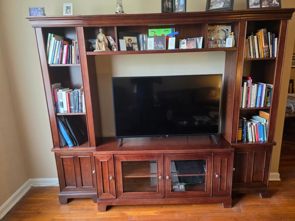 A large wooden entertainment center. Featuring multiple bookshelves and cabinet doors. It is perfect for a cozy evening, adding a warm touch to your home. The center has plenty of space for storage. There are glass doors in the center. The piece has a classic design.