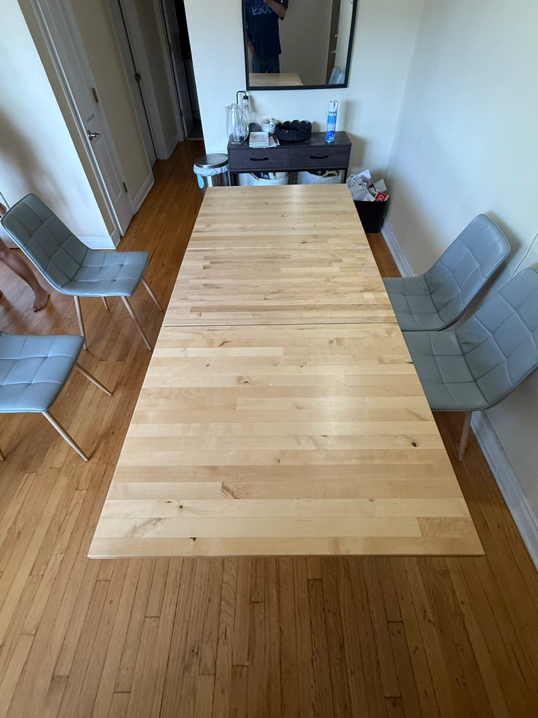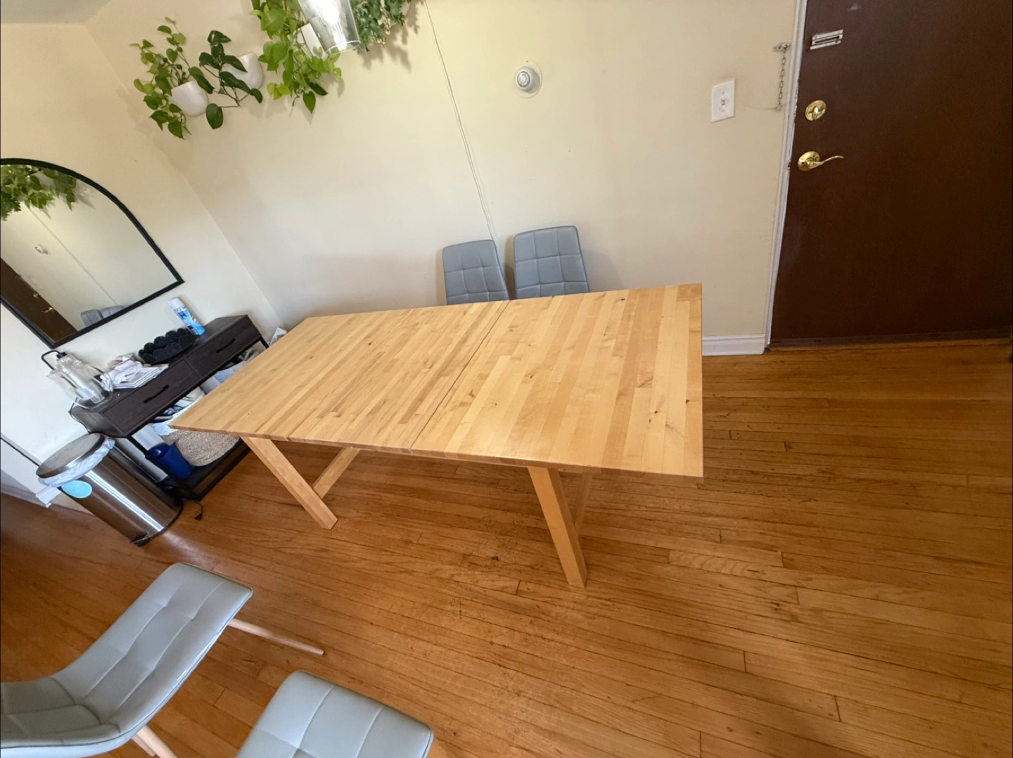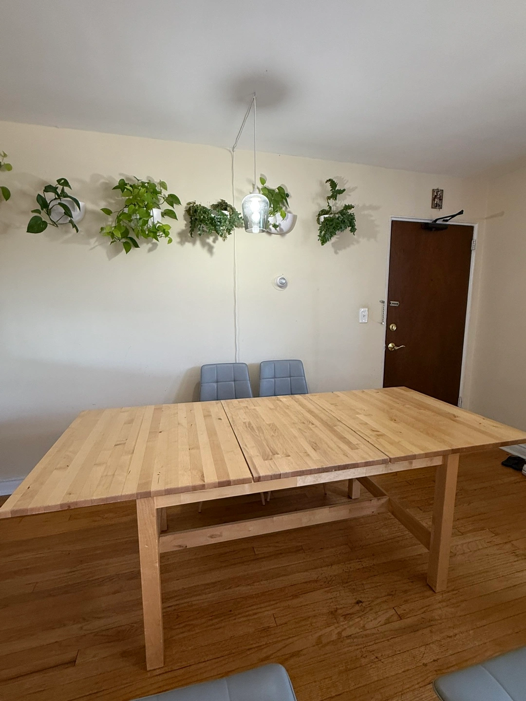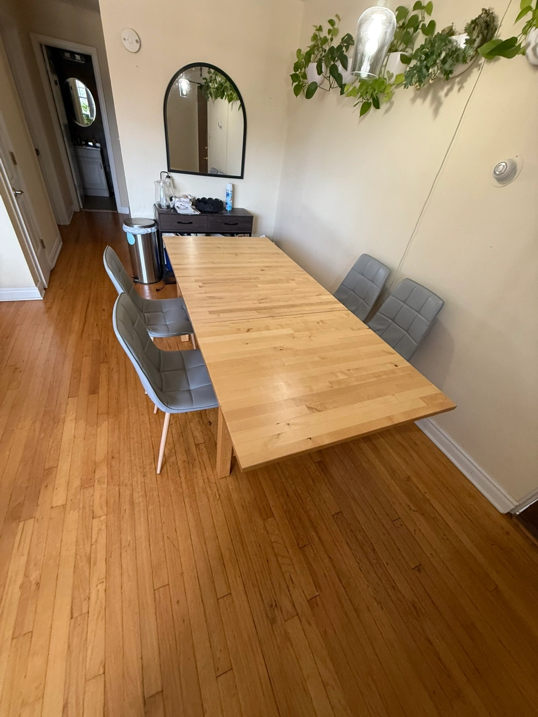 Selling a wooden extendable dining table! It's in good condition and perfect for family dinners or gatherings. The table is a light wood color and can be extended to accommodate more guests. It is a simple design that complements any dining room!