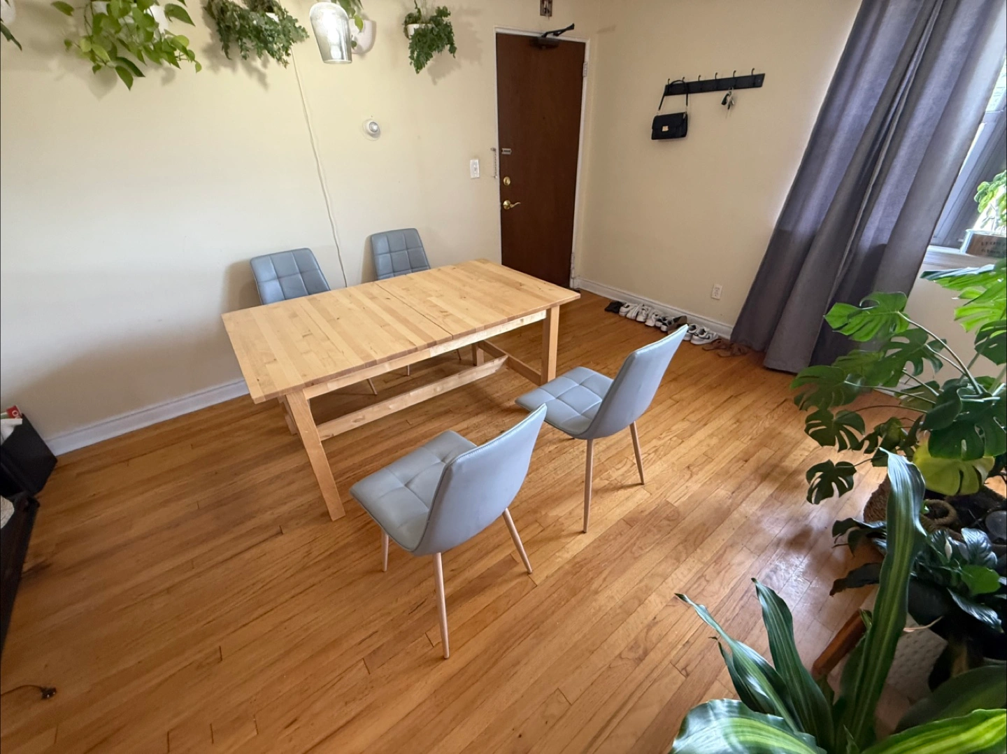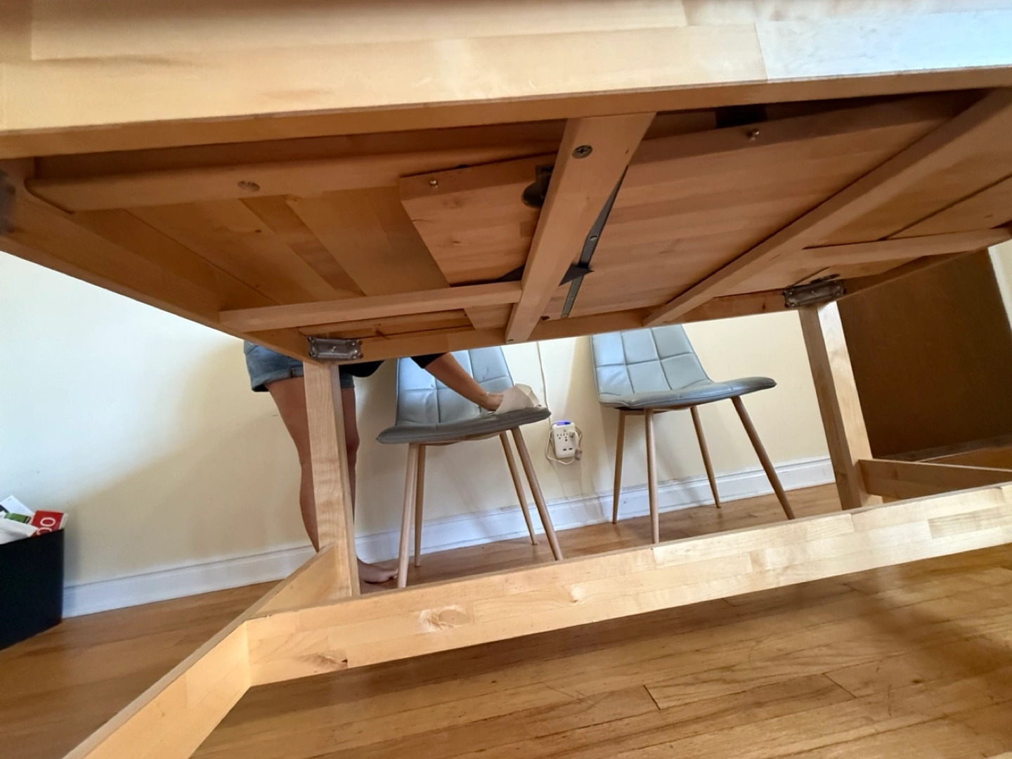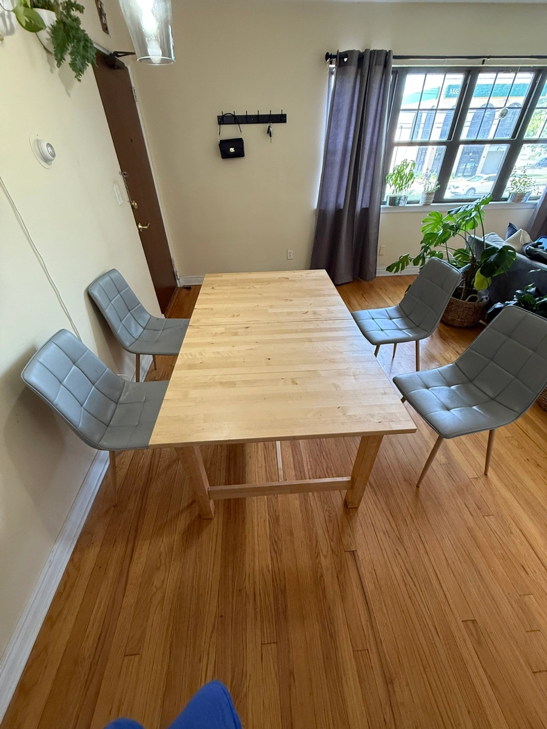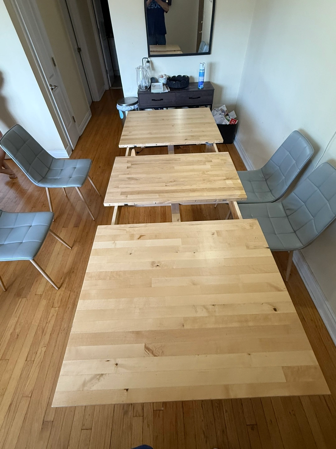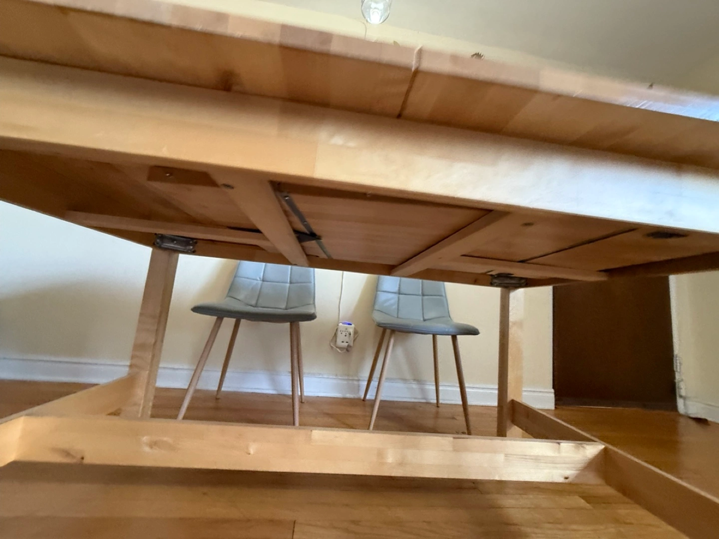Selling a wooden extendable dining table! It's in good condition and perfect for family dinners or gatherings. The table is a light wood color and can be extended to accommodate more guests. It is a simple design that complements any dining room!
