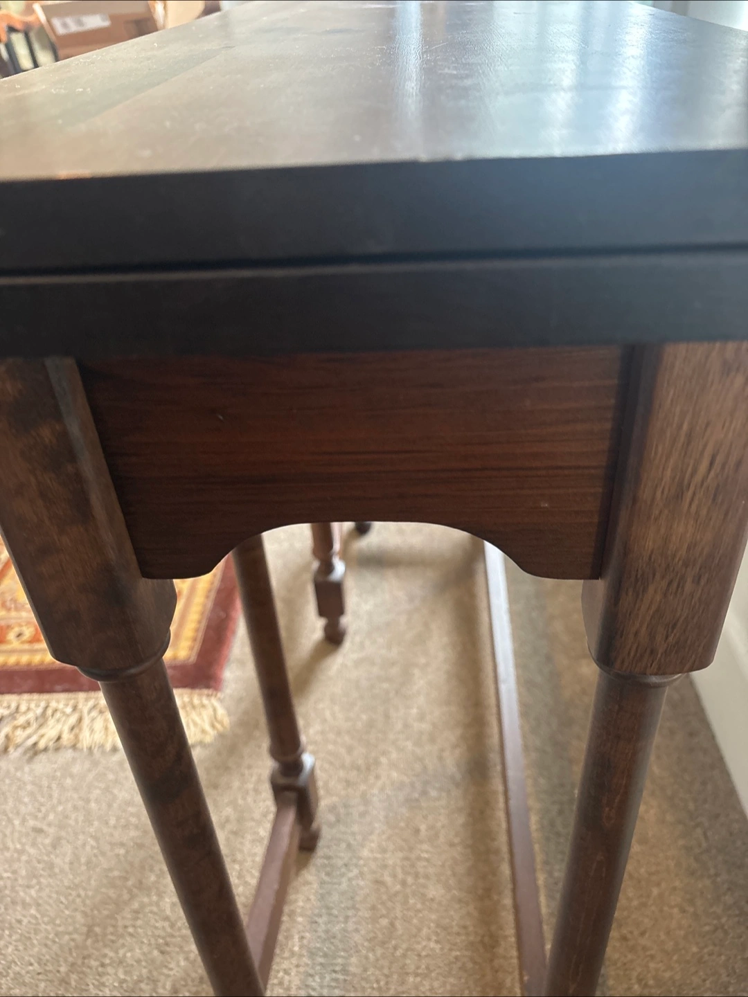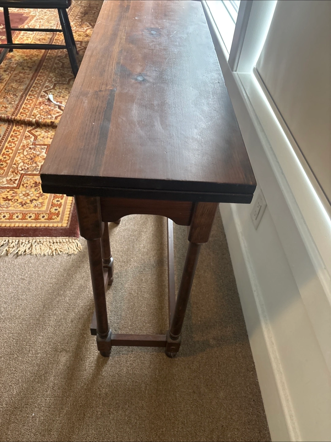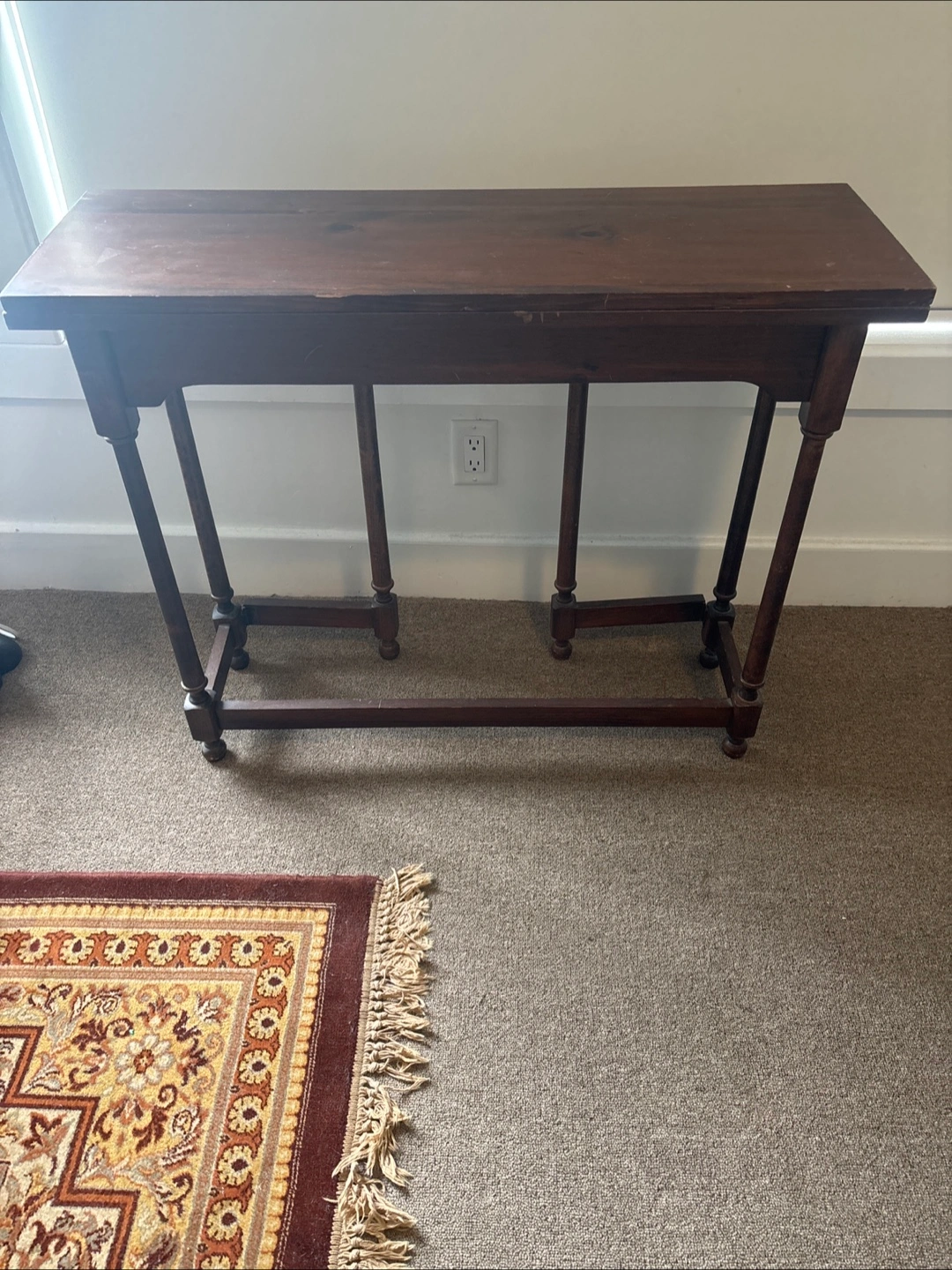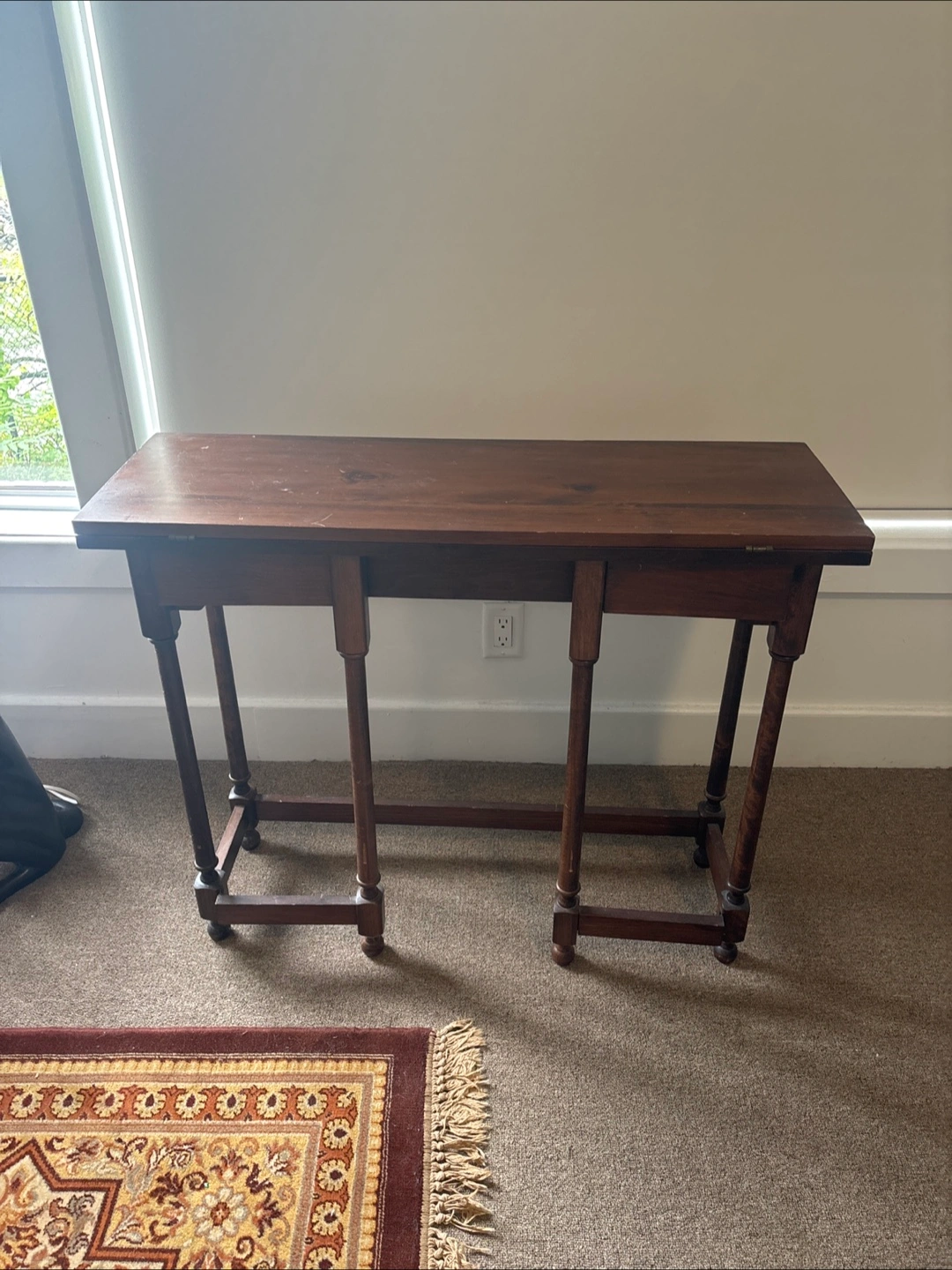 Dark brown wooden table. Features an oblong tabletop. Legs are elegantly carved. Can be used as a square table for snacking or folded as a sofa or hallway table.