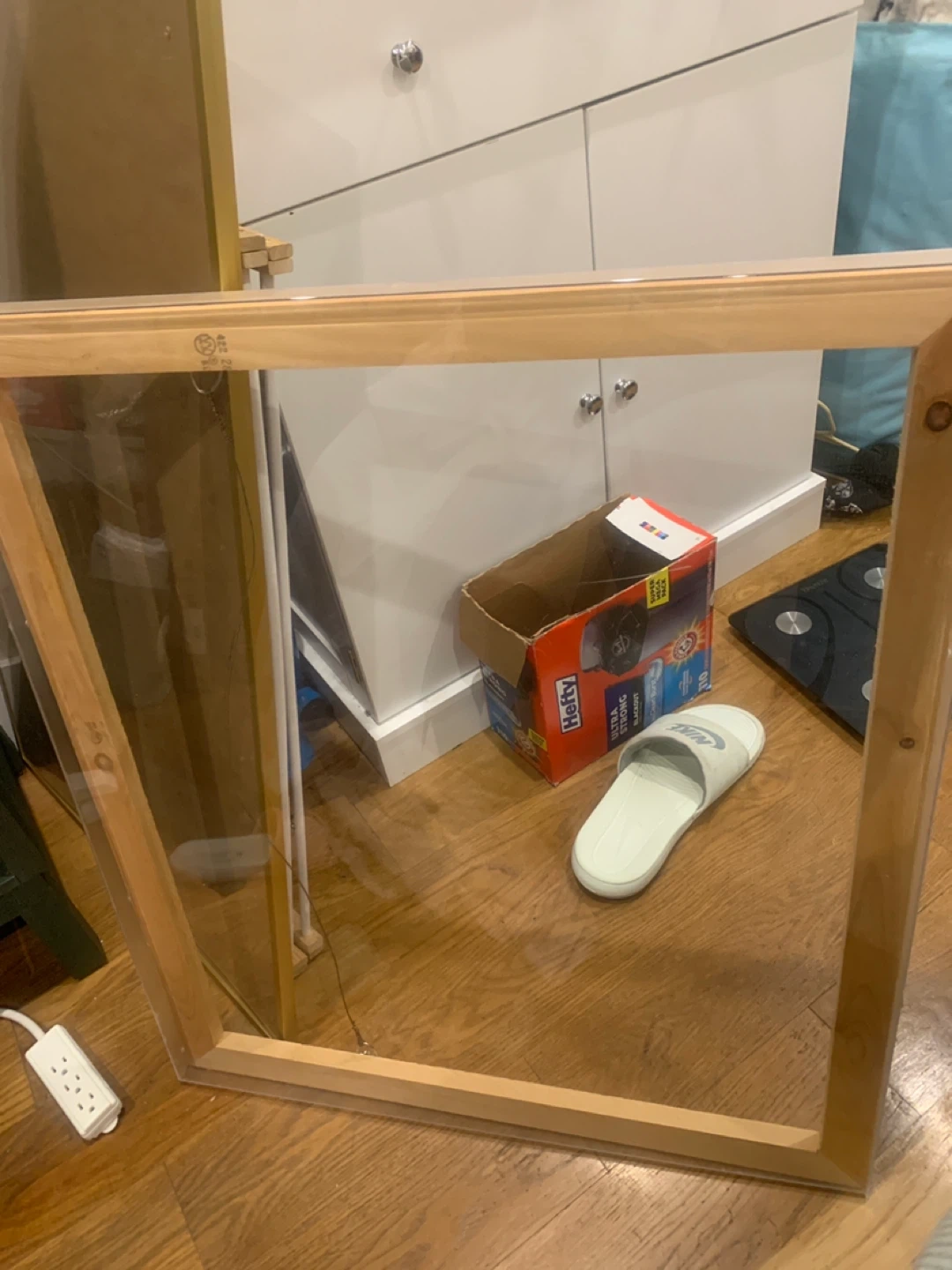 Selling a wooden framed glass print frame . It appears to be in good condition. Please take a look at the pictures to see if it's the right fit for you. Does not come with screws