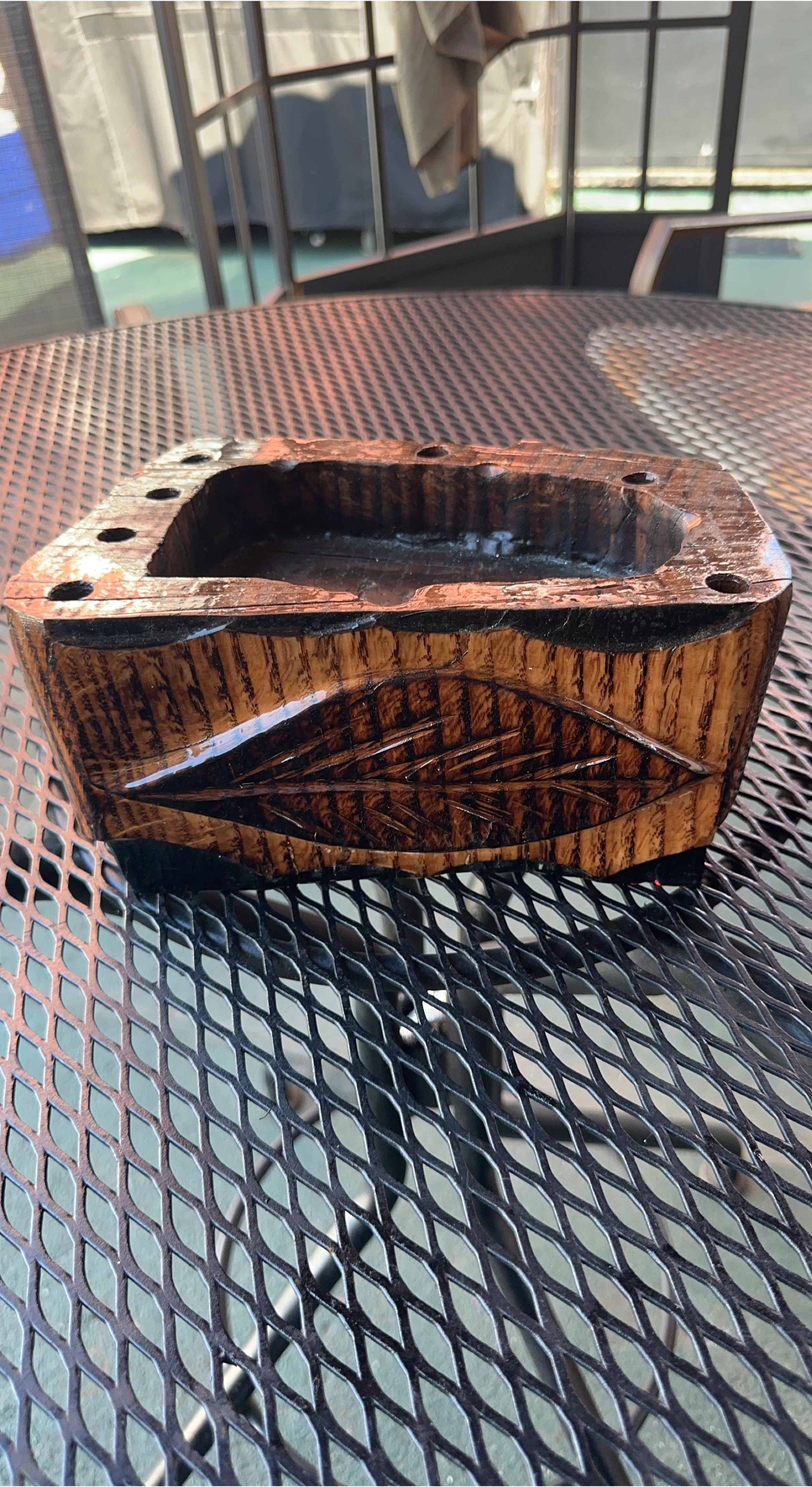 Here's a wooden ashtray with a carved design. It has a rectangular shape and several small holes around the edge for holding cigarettes. It would make a nice addition to your patio or smoking area