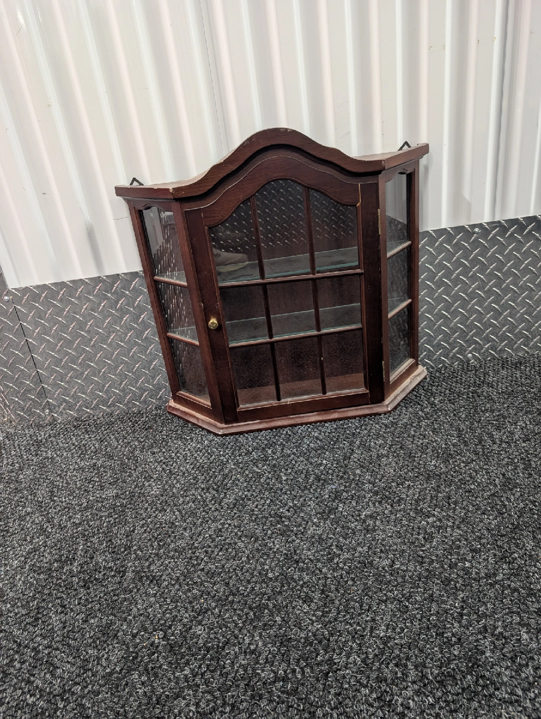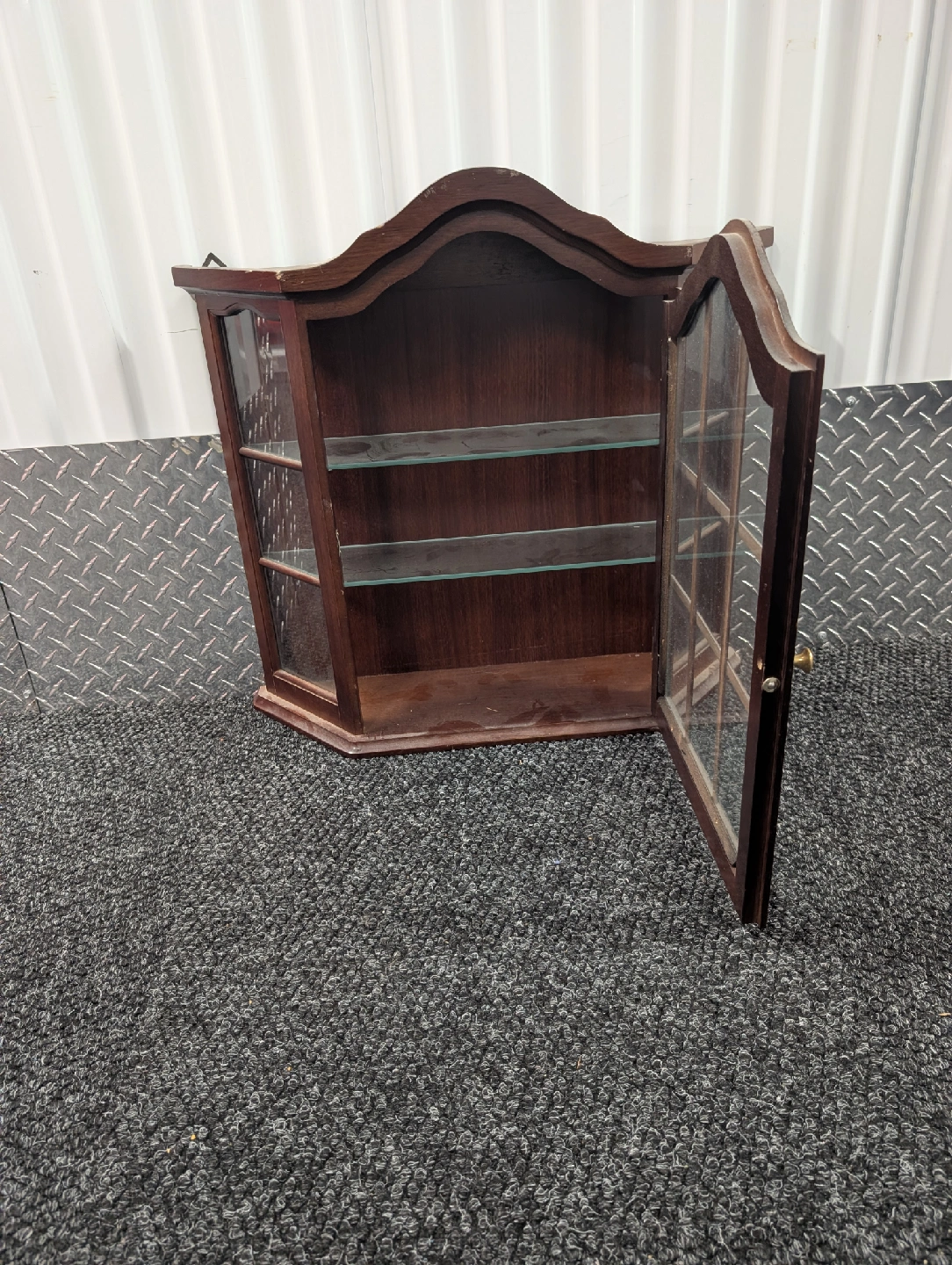 Here's a wooden Hanging curio cabinet. It has a dark wood finish and glass shelves. The cabinet door opens to reveal the shelves inside. It's perfect for displaying collectibles or small items.