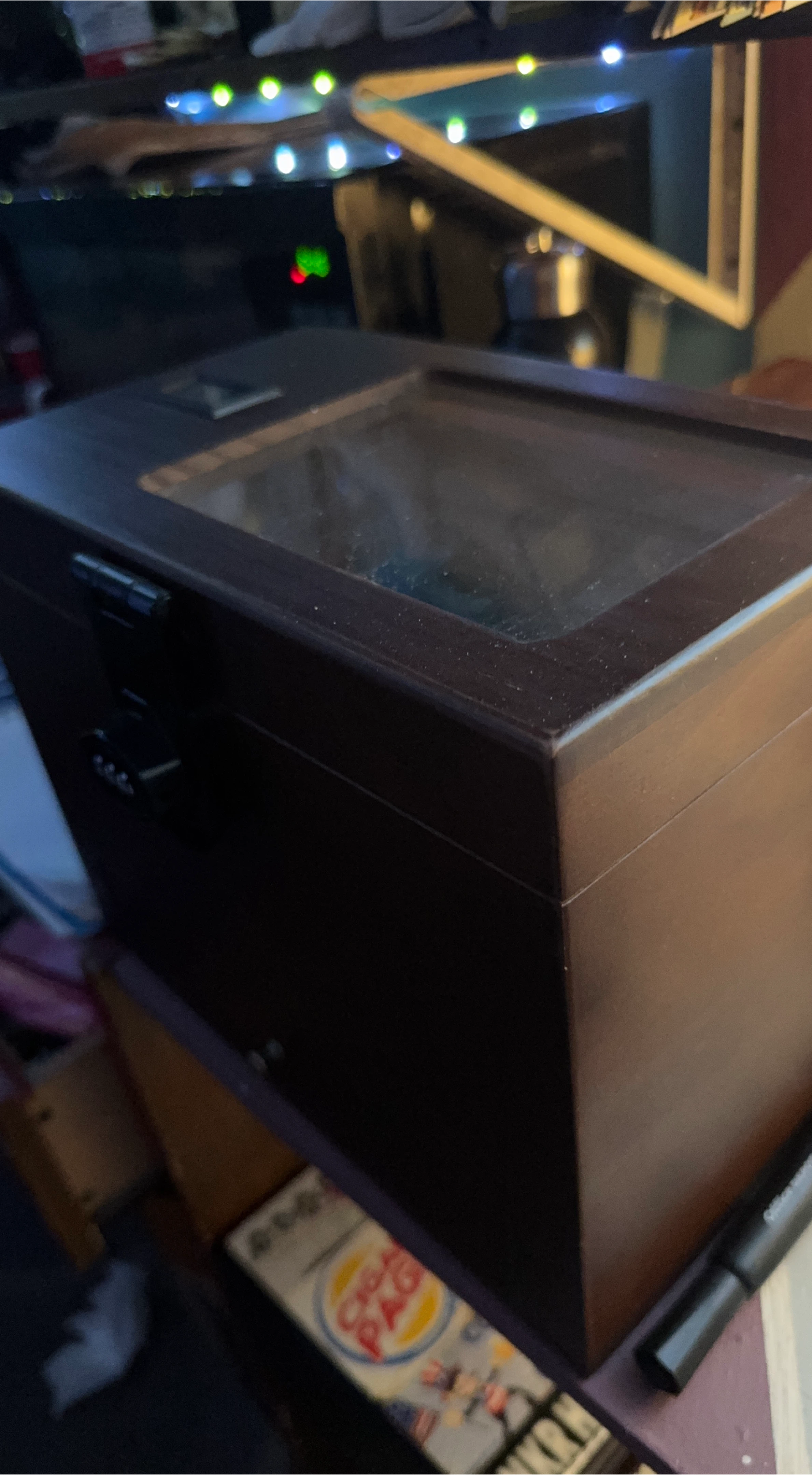 10Selling a wooden humidor box with a glass top. It's in good condition and perfect for storing cigars or other items you want to keep protected and displayed. It has a lock on the front too. Most importantly it holds and maintains desired humidity levels.