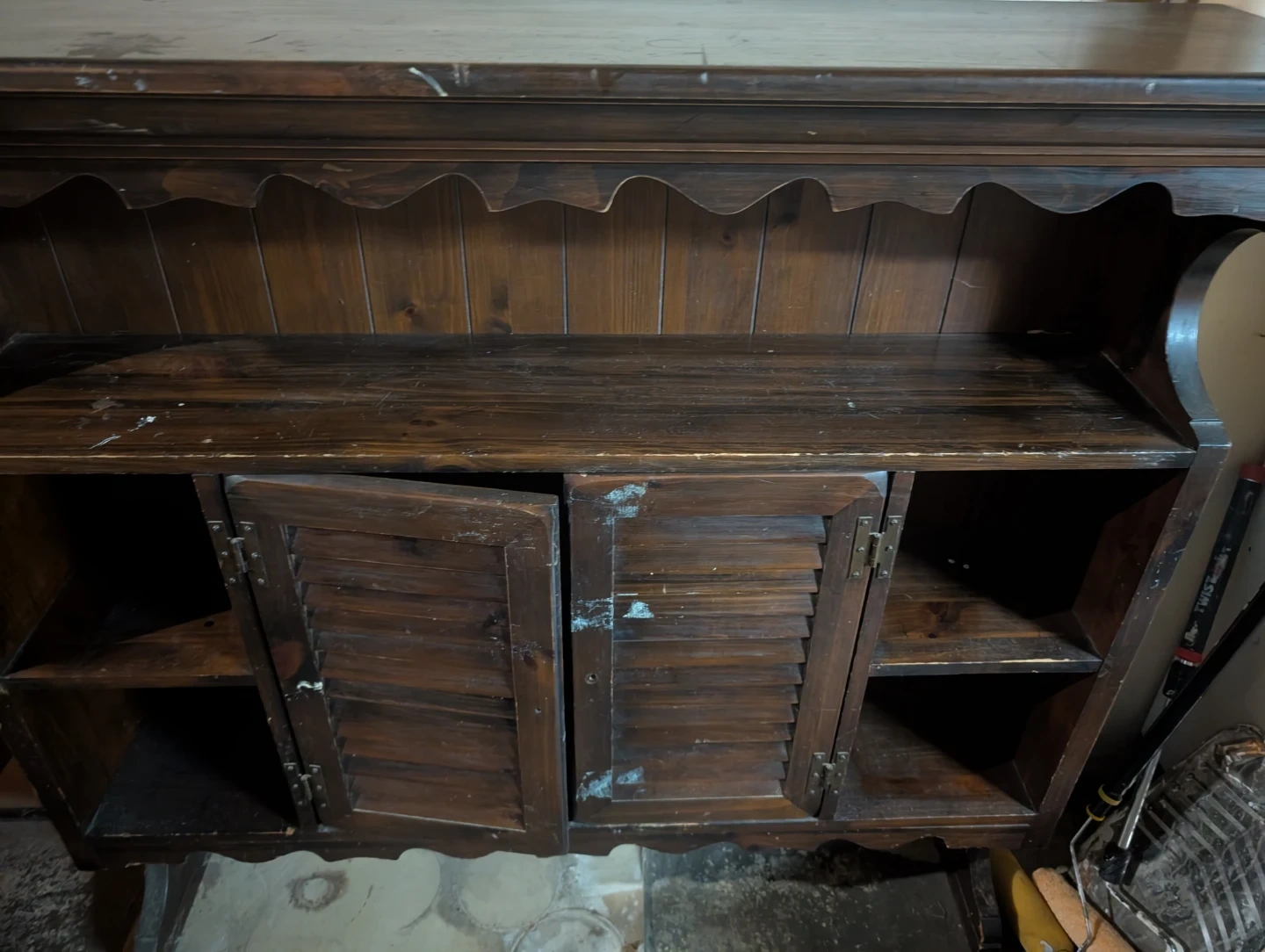 78Selling a wooden hutch cabinet. It has a dark wood finish and features a top shelf with decorative trim, a center shelf, and a cabinet with louvered doors. It would be a great addition to any home!