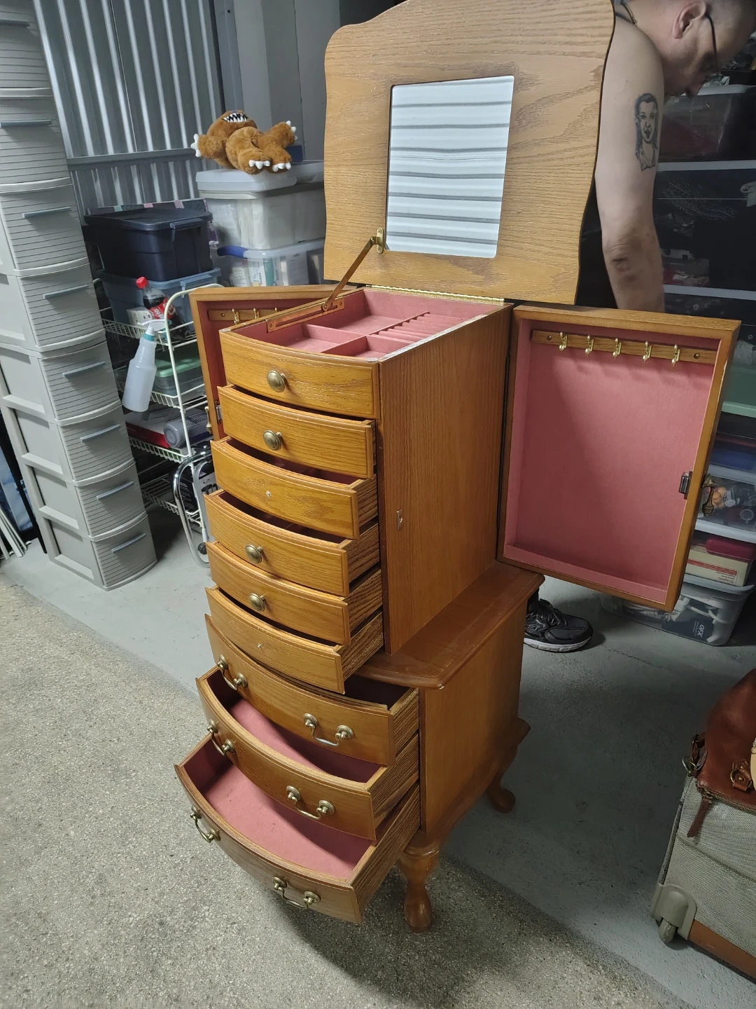 72This is a lovely wooden jewelry armoire with a mirror. It features multiple drawers and compartments, perfect for organizing all your jewelry. The interior is lined with a soft, pink fabric. It's a great piece to keep your valuables safe and stylishly displayed