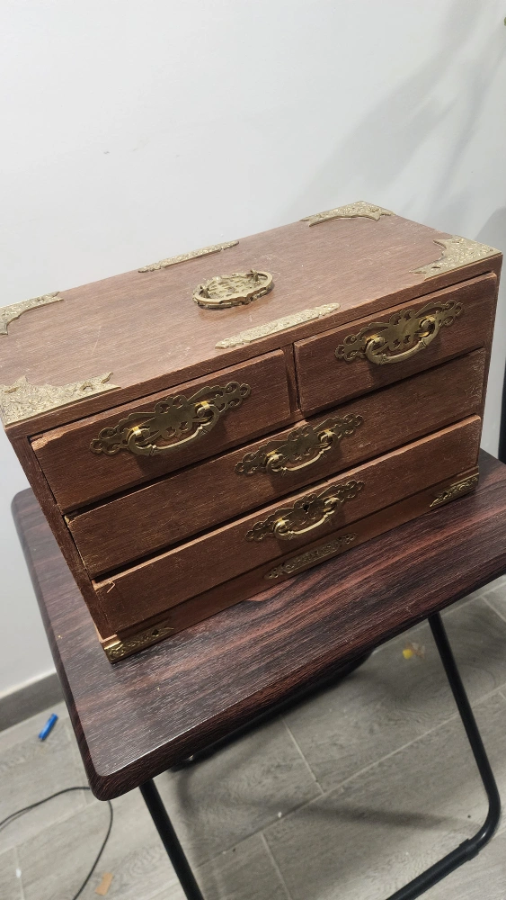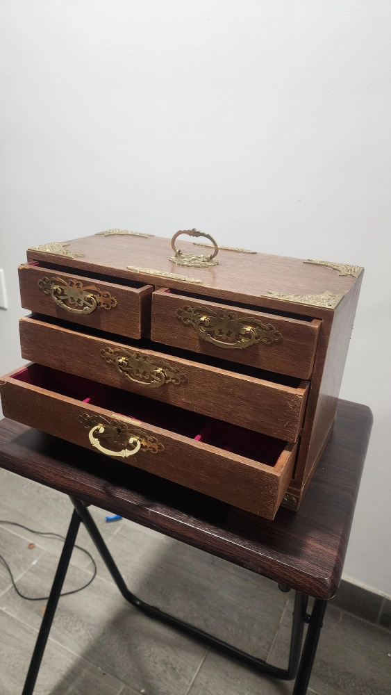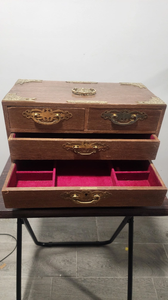 This is a wooden jewelry box with multiple drawers. It has a vintage look with brass-colored handles and corner accents. The drawers are lined with a red velvet-like material. It's perfect for storing your jewelry and keeping it organized!