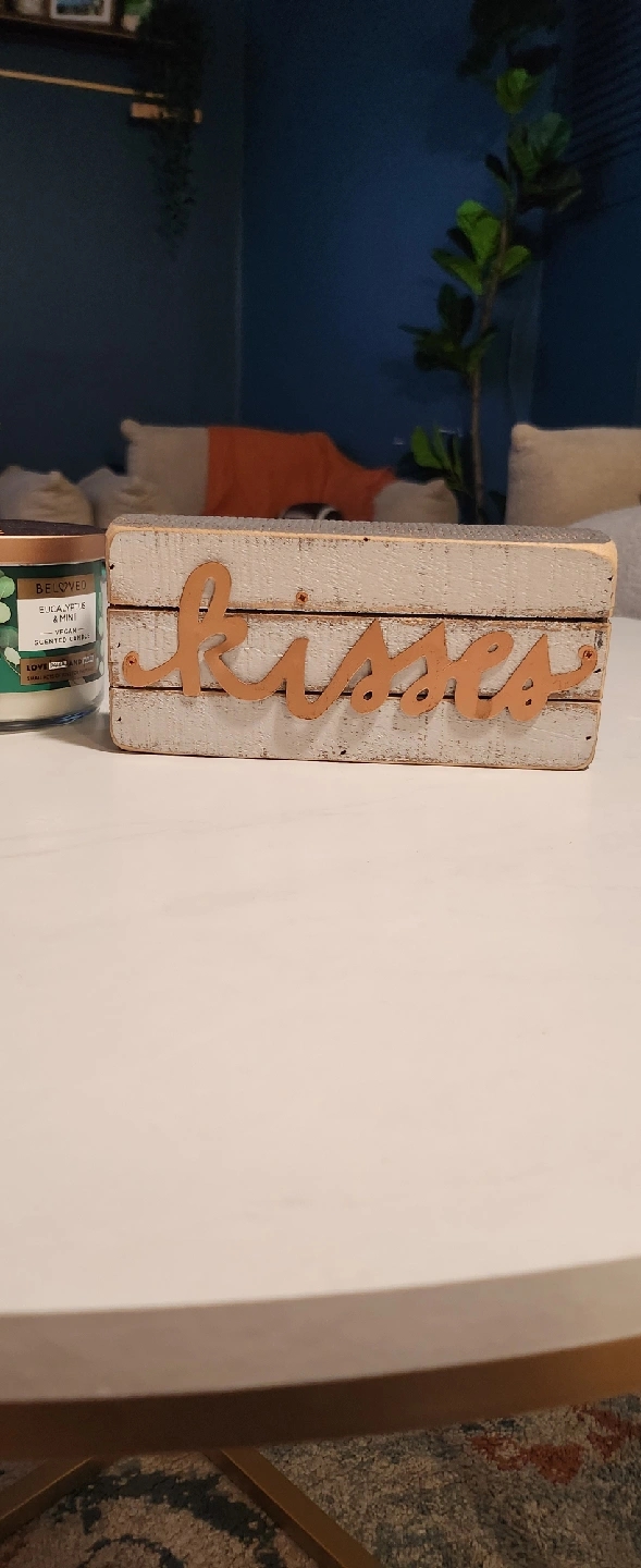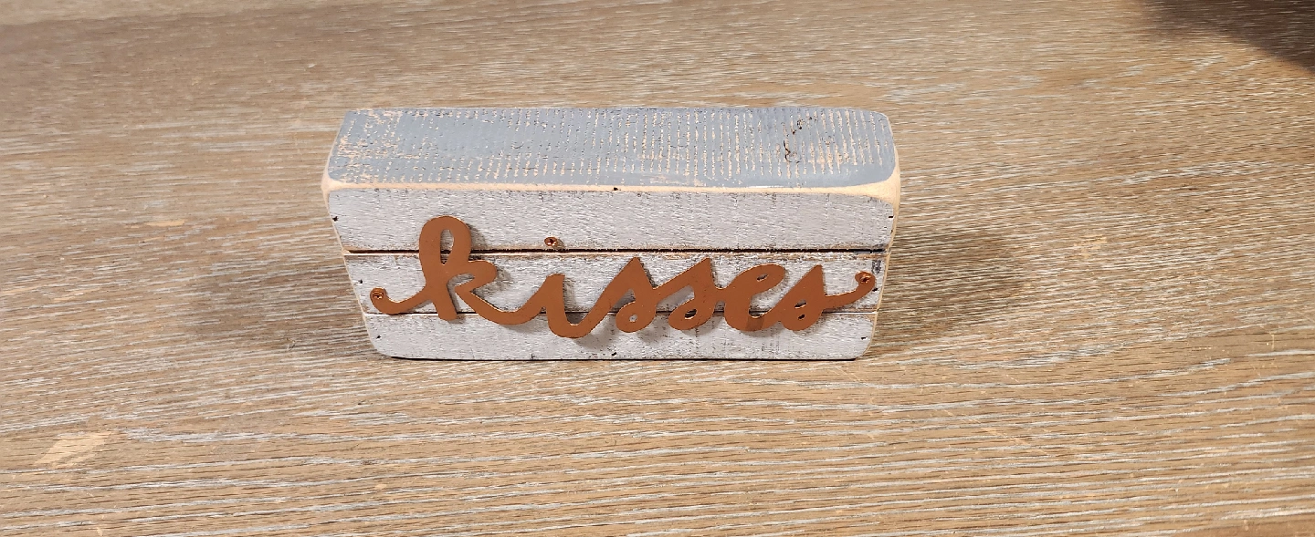 114Cute little rustic wooden block decor piece with the word 'kisses' on it. It would look great on a shelf or desk.