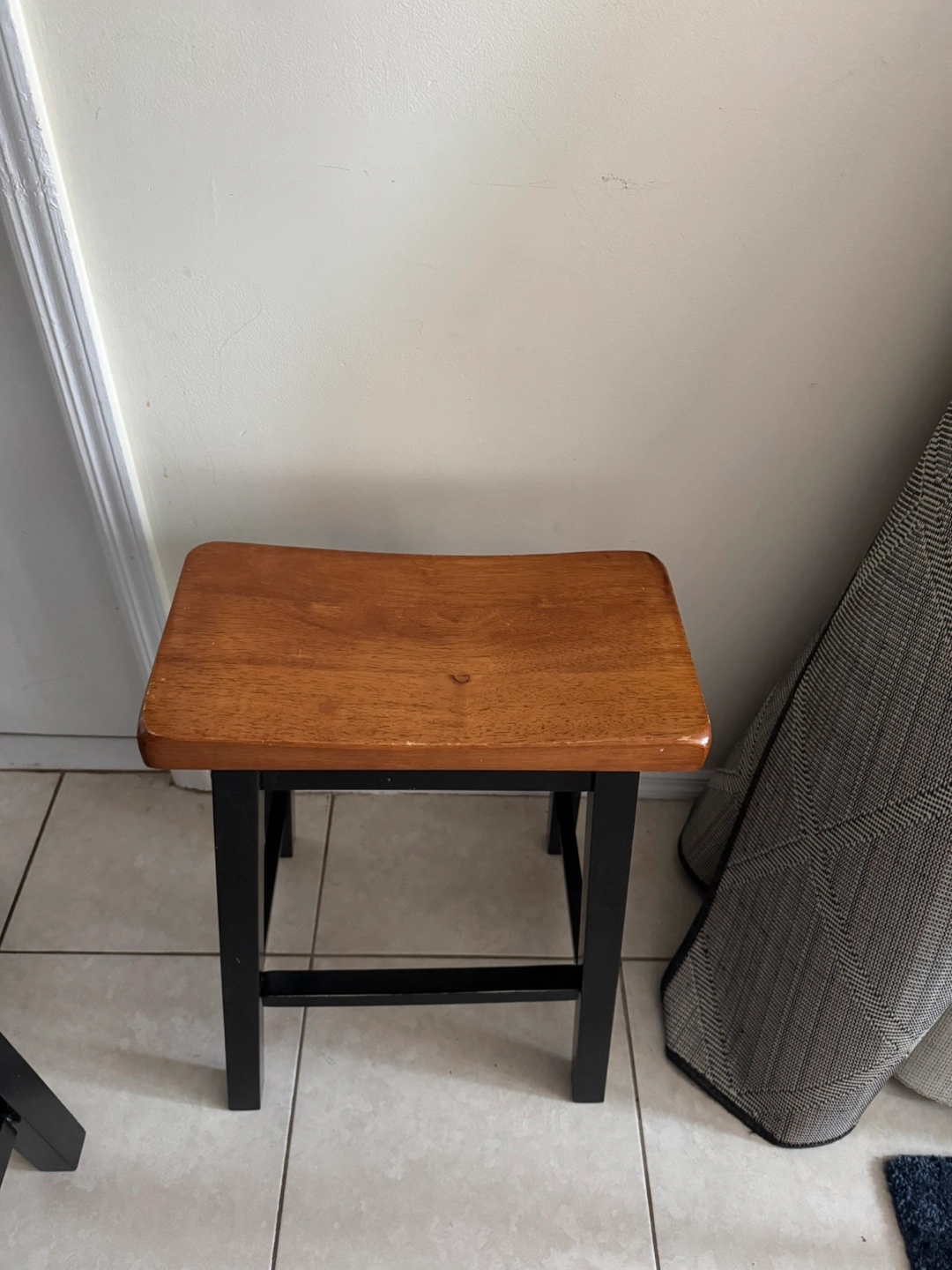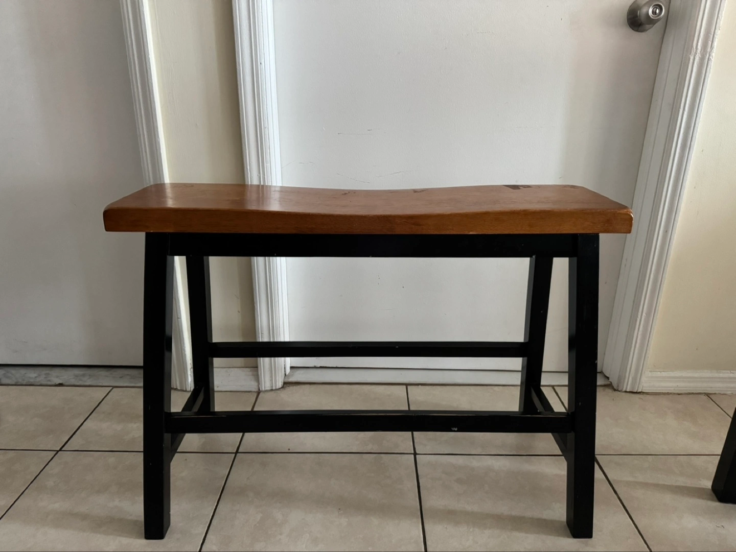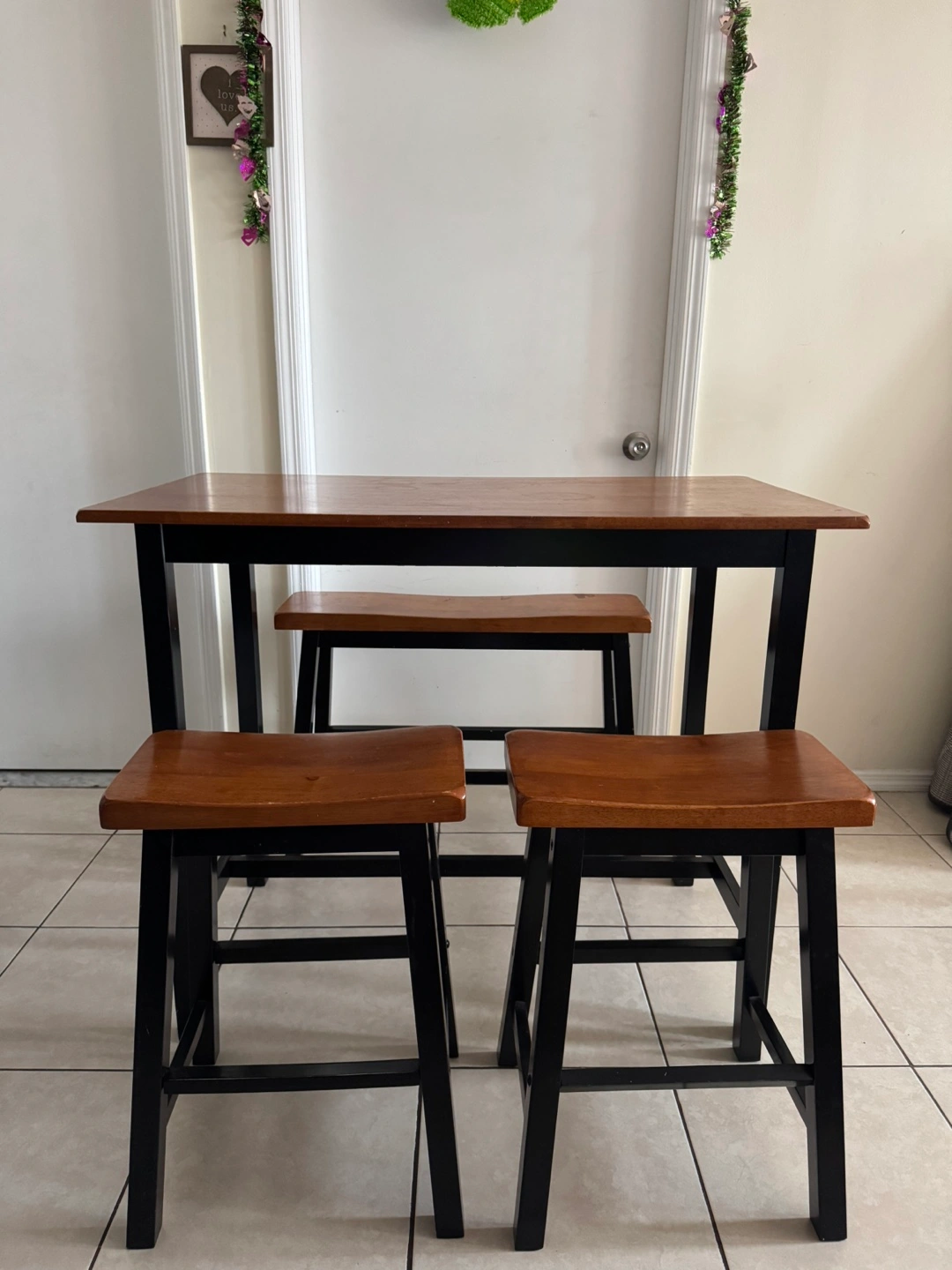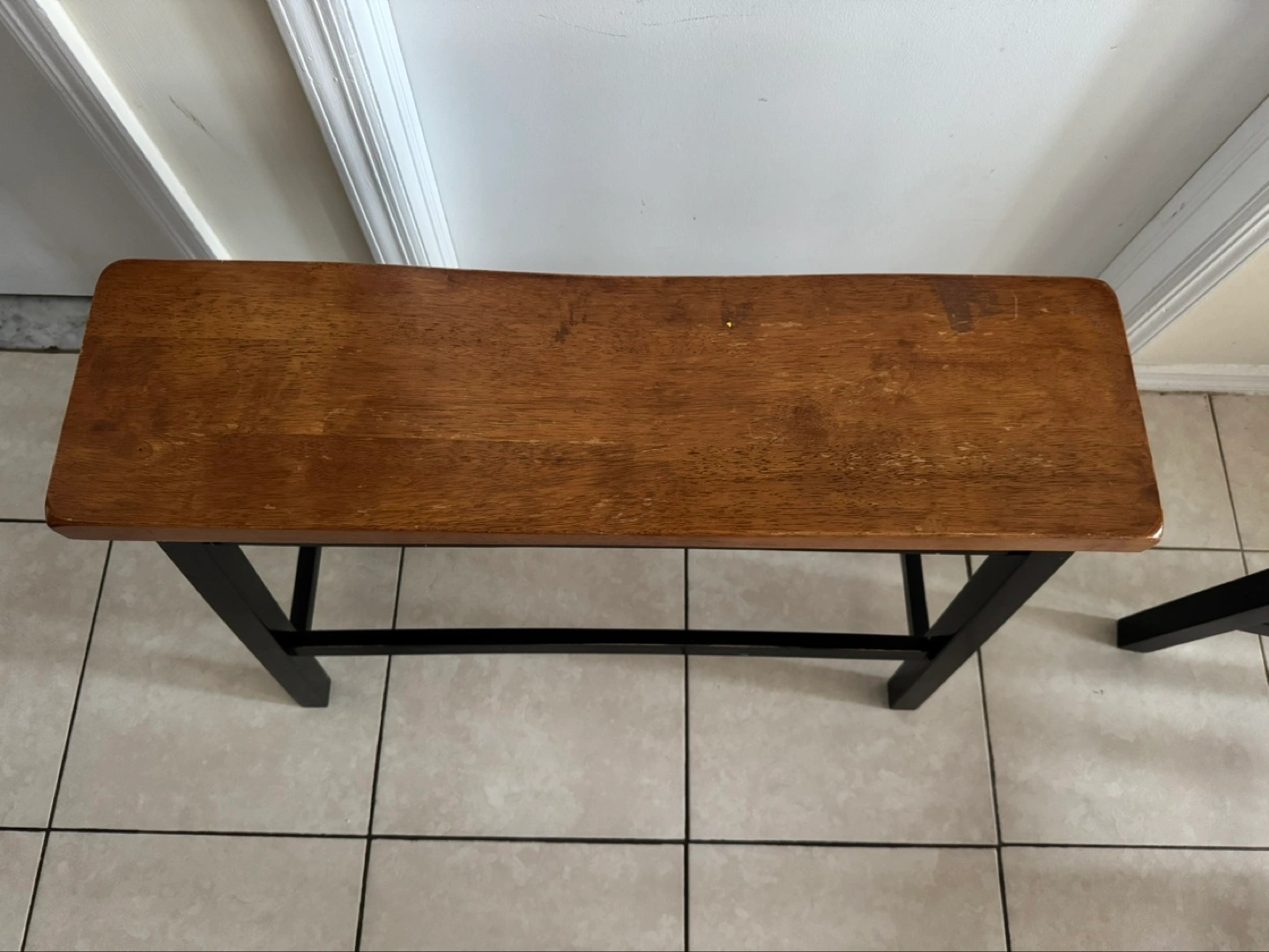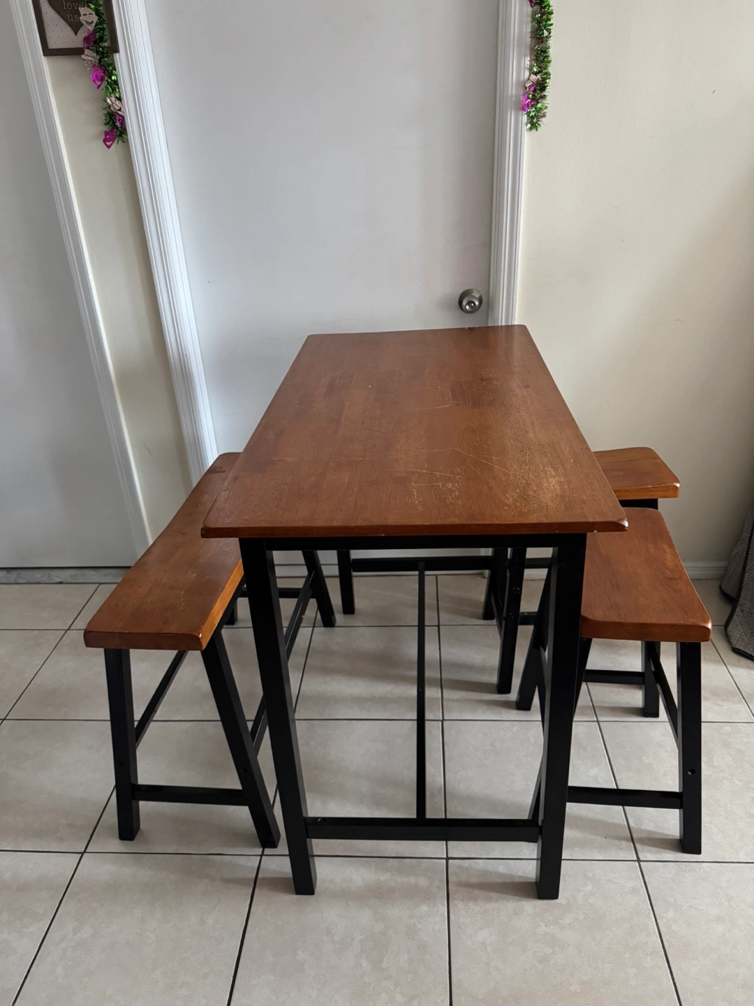 26Charming and compact kitchen table set—ideal for cozy spaces. Comes with a table, bench, and two stools, all featuring sturdy black legs and durable wooden tops. The wood is high-quality and built to last. We’re only parting with it because of a move—this set has been a true gem in our home.