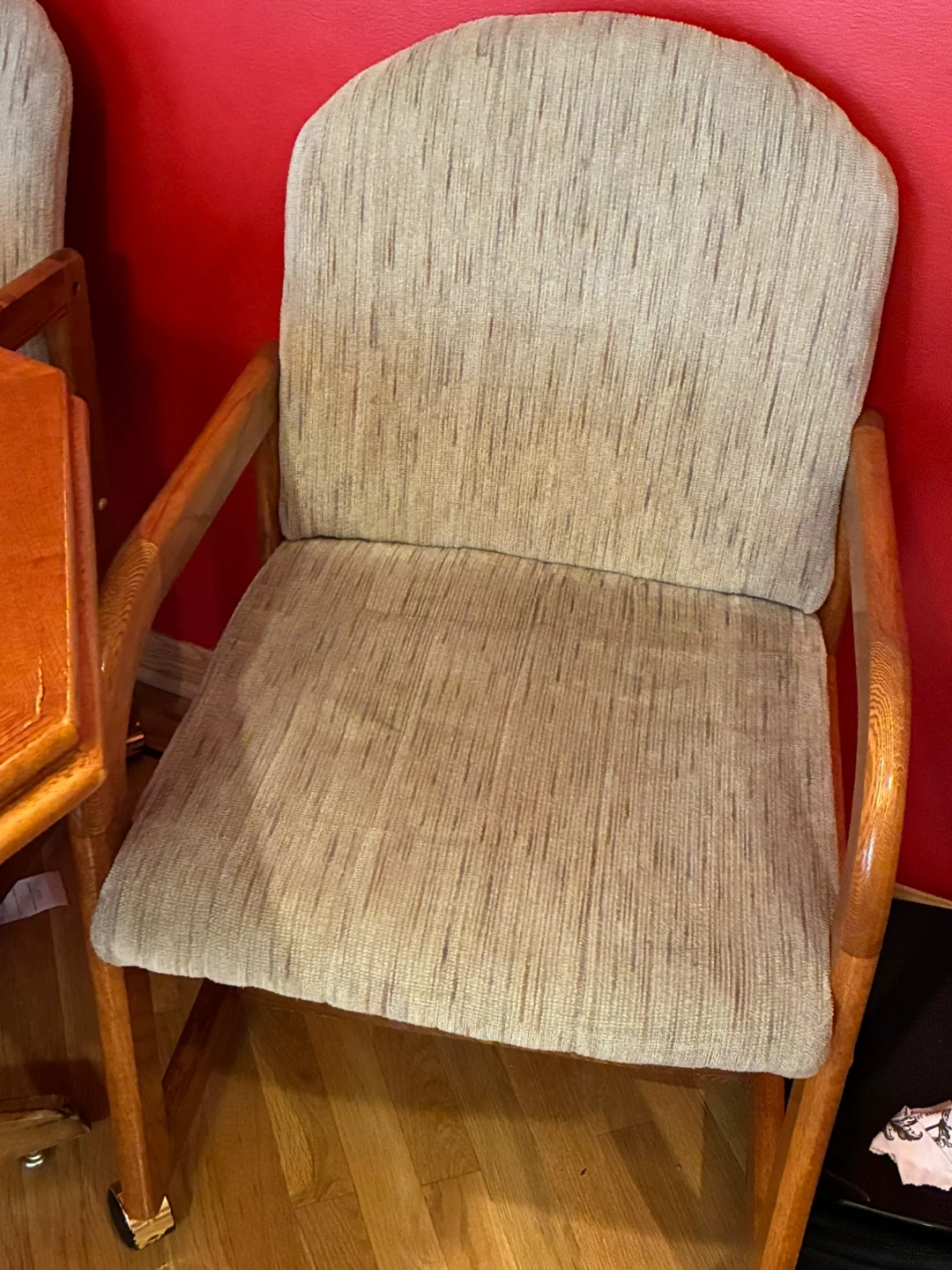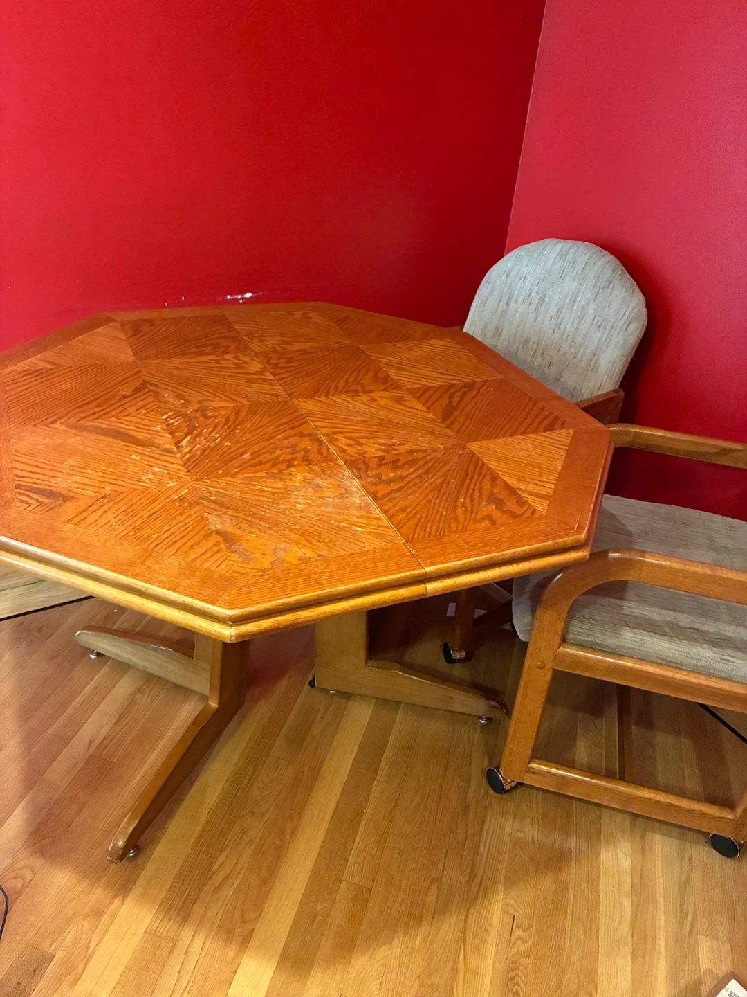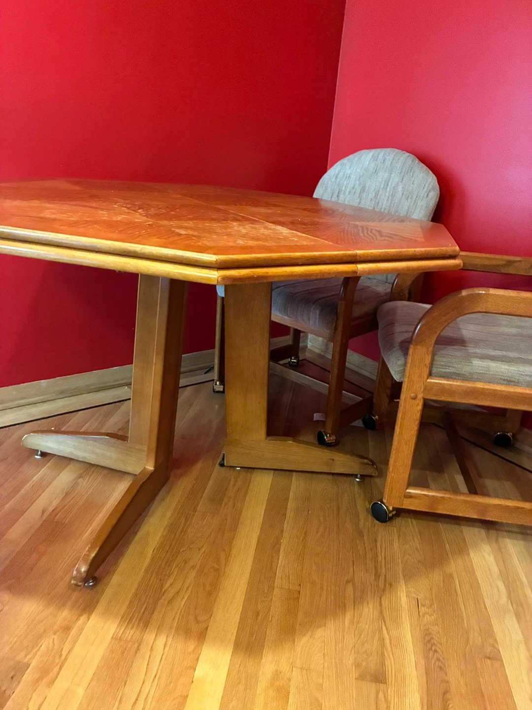 19Selling a used wooden table with four wheeled chairs and extension leaf. The table has an octagonal shape with a unique wood grain pattern on the surface. The chairs have a wooden frame with a cushioned seat and back. They also have wheels on the legs for easy movement. Perfect for a dining room or kitchen!