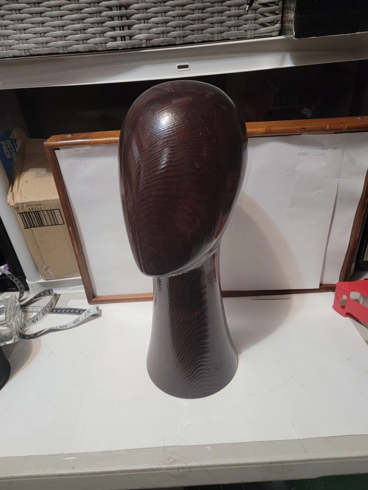 60Selling a wooden mannequin head in a dark brown color! It's about 16 inches tall and has a head circumference of around 21 inches. Great for displaying hats, wigs, or jewelry