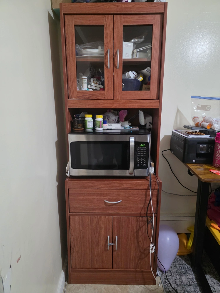 Selling a wooden microwave cabinet. It has a drawer and cabinets for storage. Drawer is slightly distorted. purchased through Amazon link: https://a.co/d/eIVkhlD