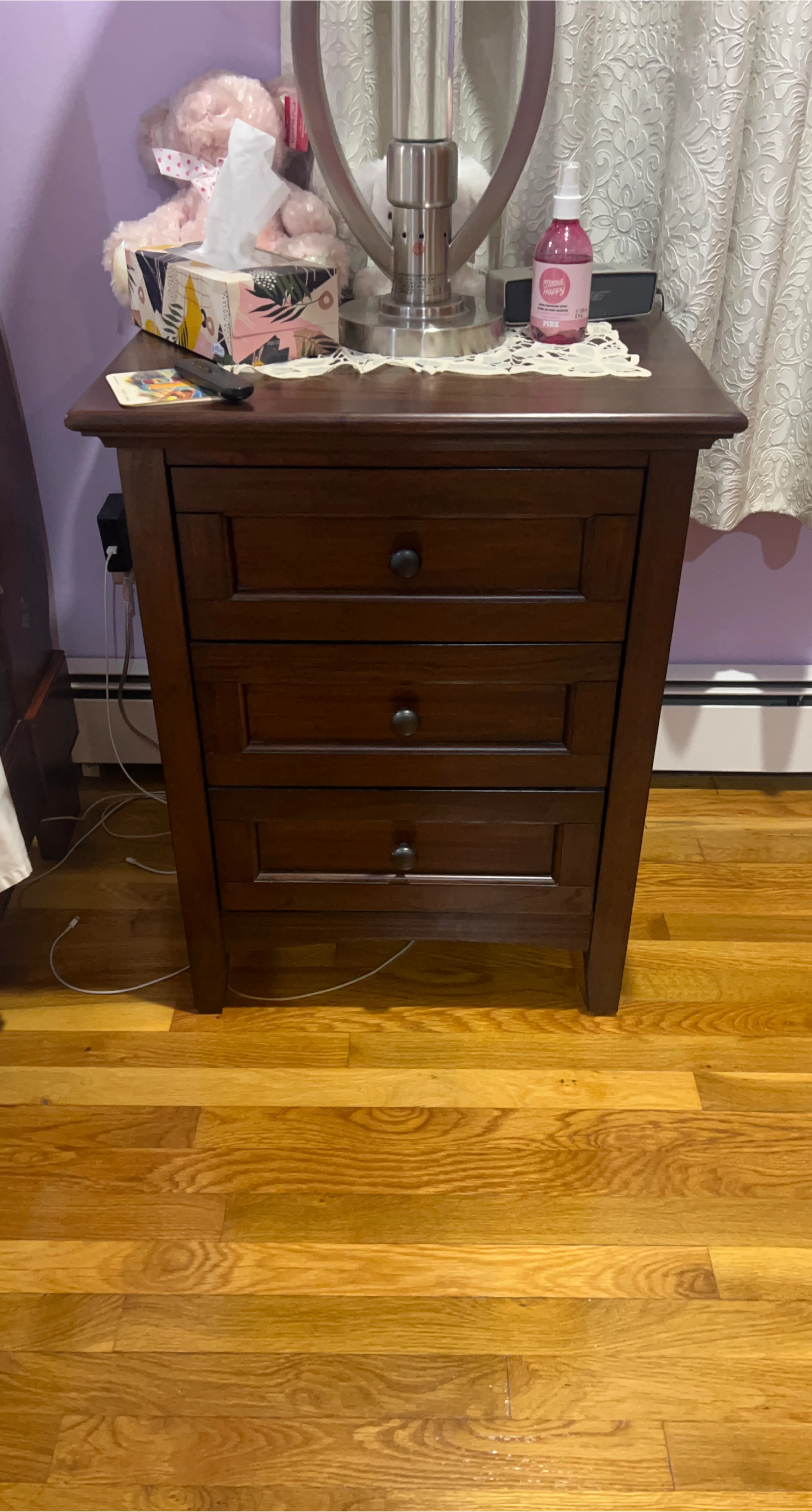 Selling a wooden nightstand with three drawers. It's in good condition and ready for a new home! The dark wood finish adds a touch of elegance to any bedroom. Perfect for storing your nighttime essentials