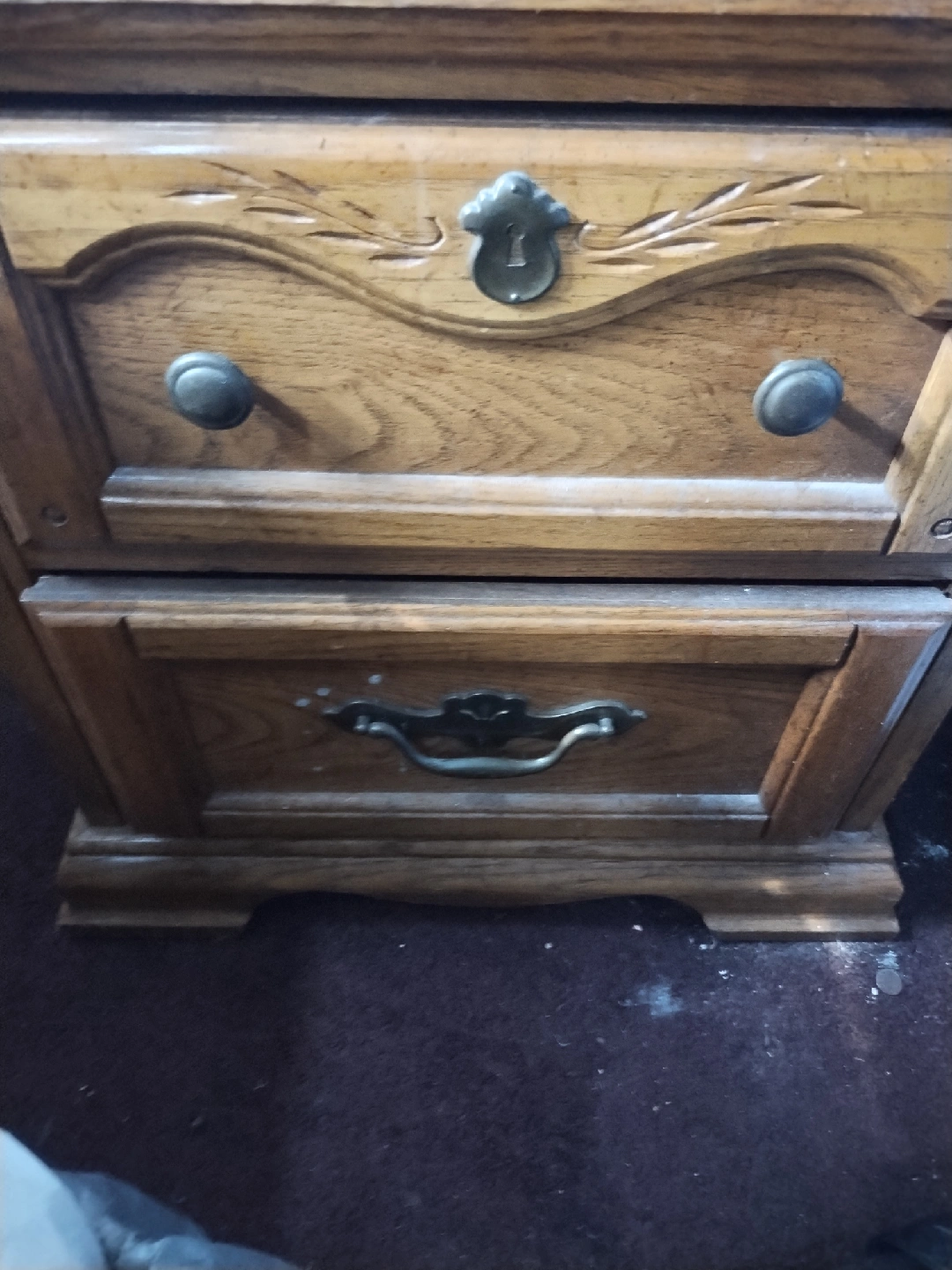 Selling a cute wooden nightstand with two drawers. It has a classic look with unique drawer pulls and decorative carvings. Perfect for adding some vintage charm to your bedroom! matching set of 2