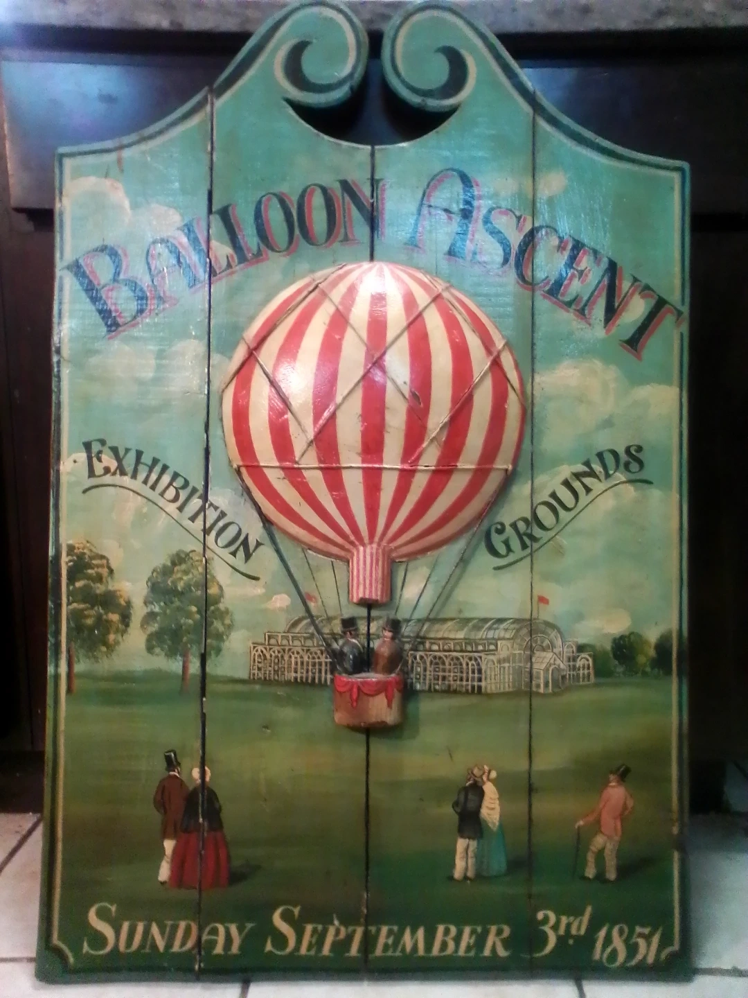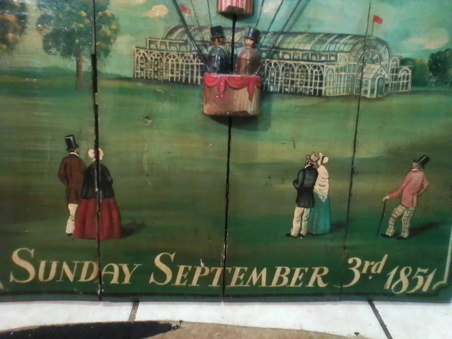 78Wooden advertising balloon sign that is very antique, depicting the art exhibition in London, England of the exhibition grounds on September 3, 1851.
