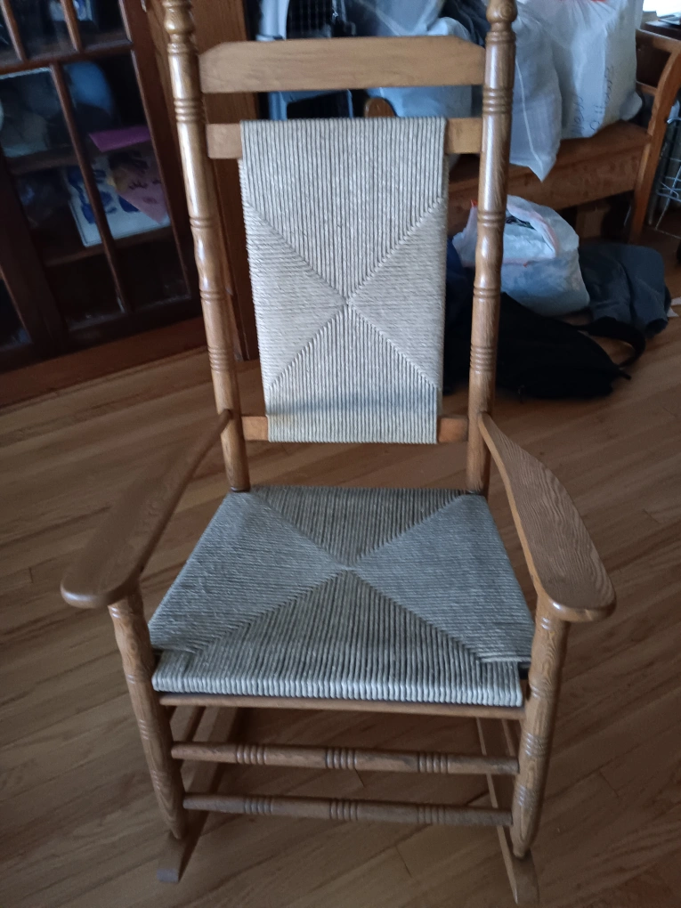 Here's a classic wooden rocking chair with a woven seat and back. It has a warm, natural wood finish. The woven seat and back add a touch of rustic charm. It's perfect for relaxing on the porch or in your living room!