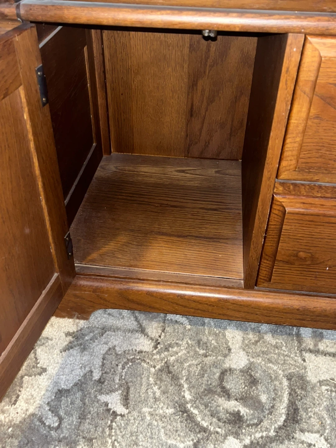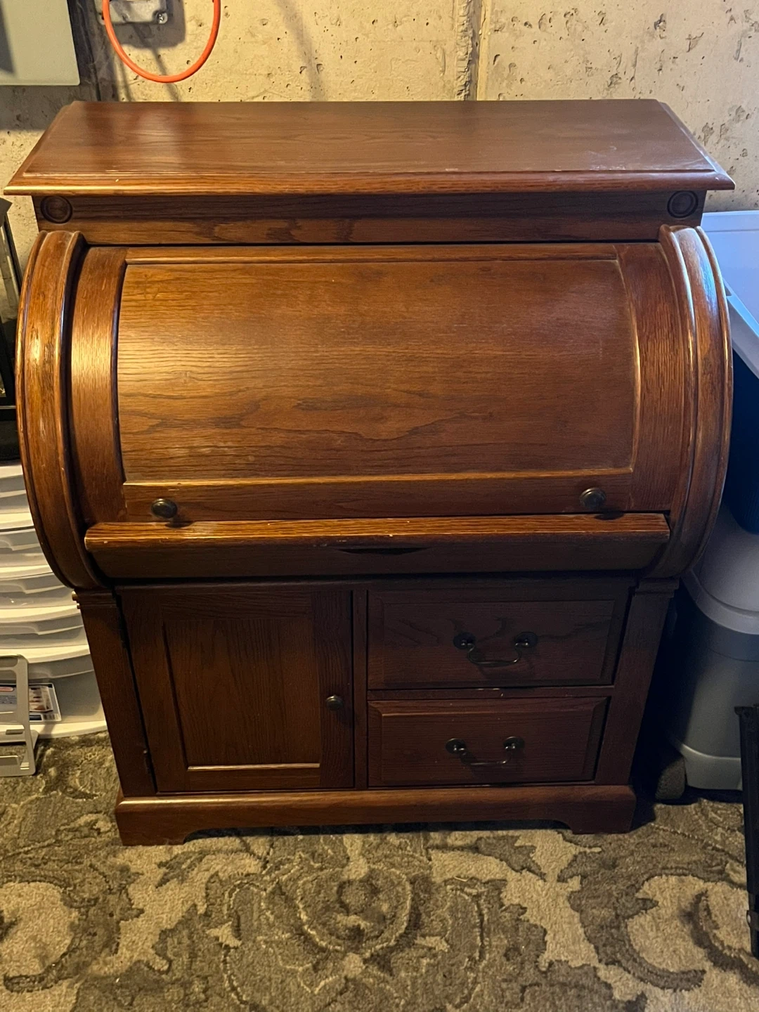 60Selling a wooden roll top desk. It has a classic design with a roll top that slides open to reveal storage compartments. There are also drawers and a cabinet for additional storage. It shows some signs of wear, but is still functional. 42.5 height 32.5 length 18 width Free Delivery I can take care of the marking inside the desk