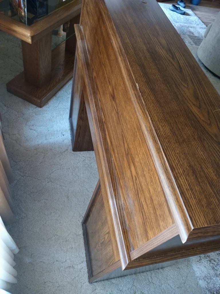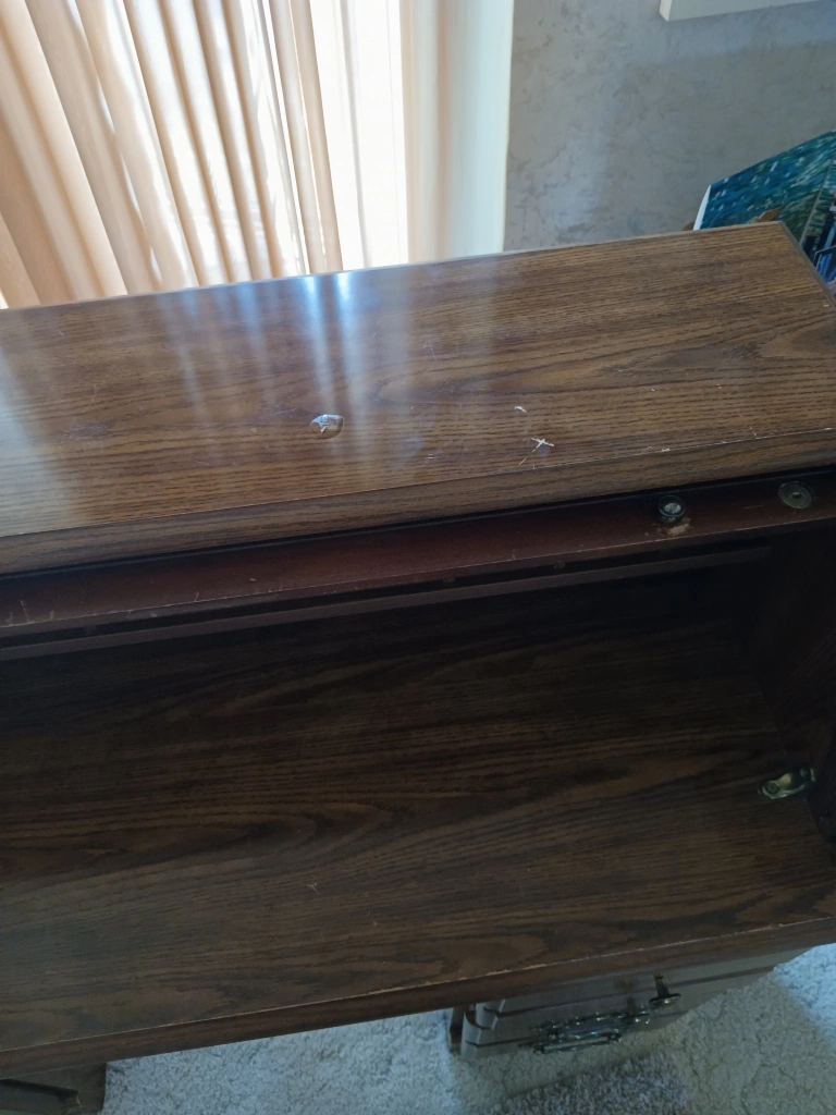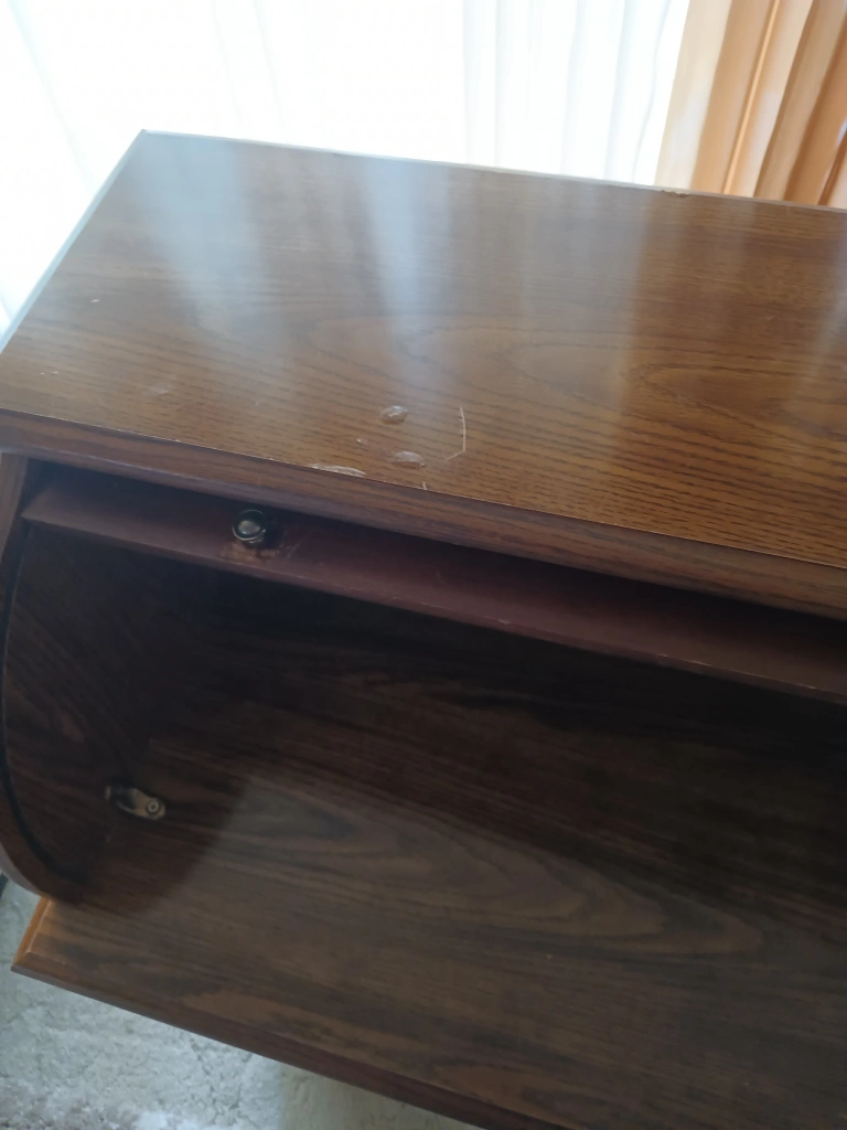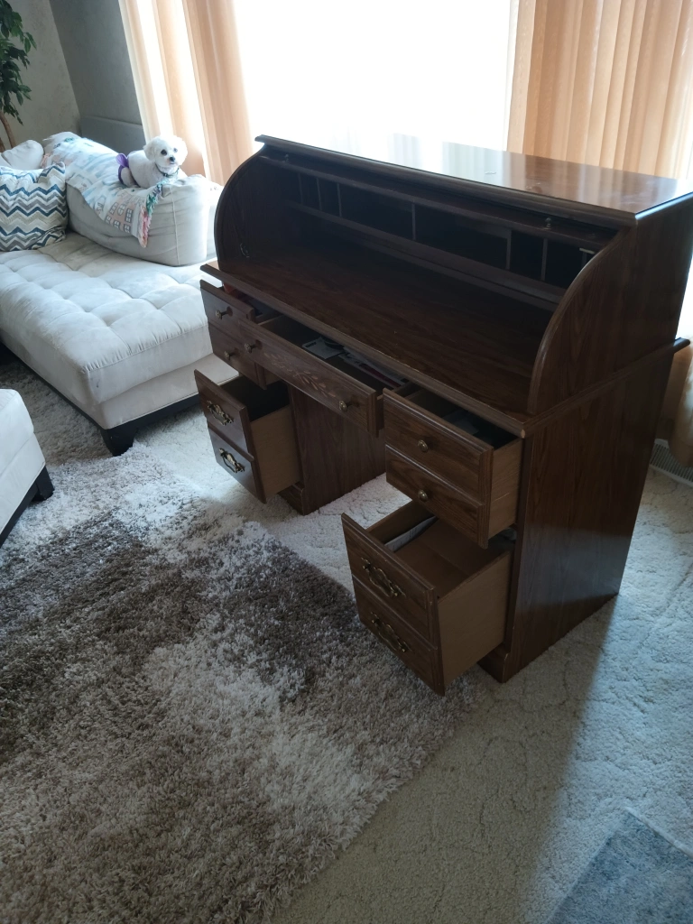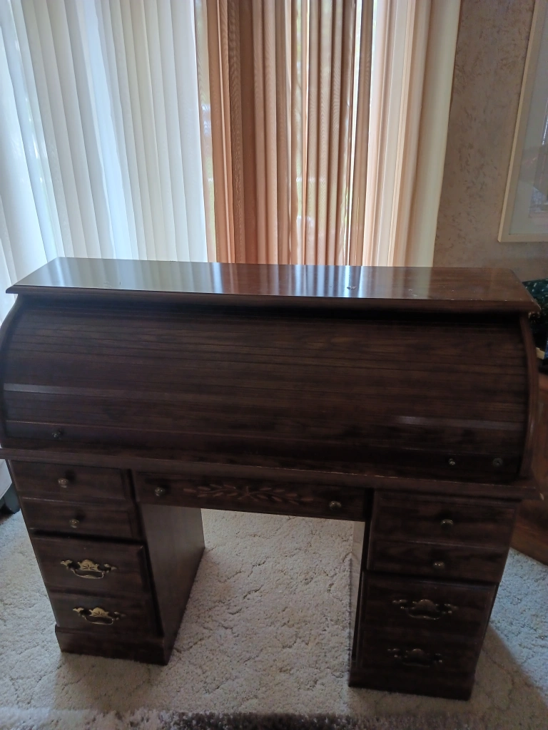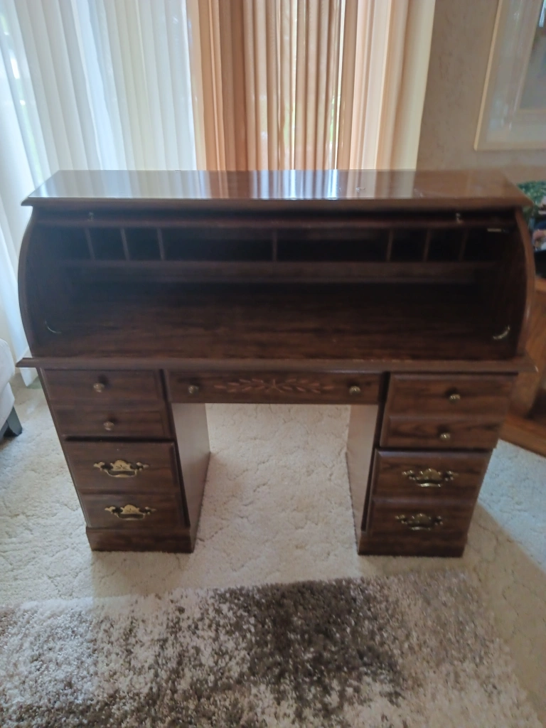 65Roll-top desk with drawers on both sides. There are a few signs of use. This desk would be perfect for working from home or managing a home office.