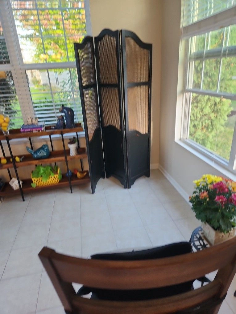 10Brown, three-panel, hand-woven rattan and wood room divider.