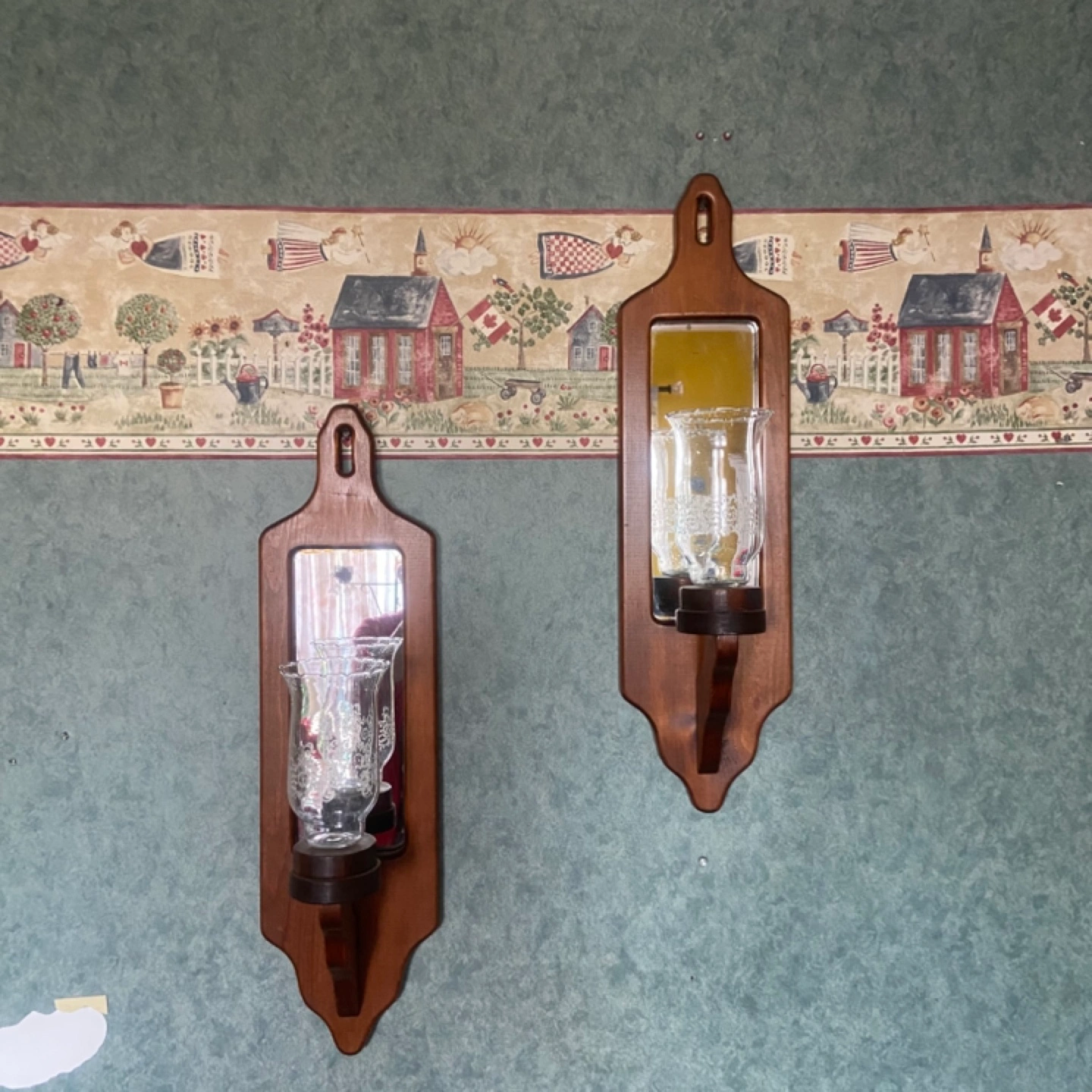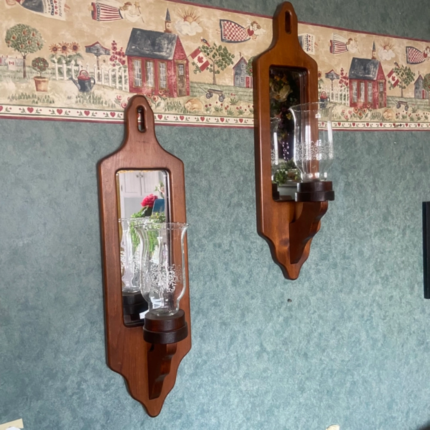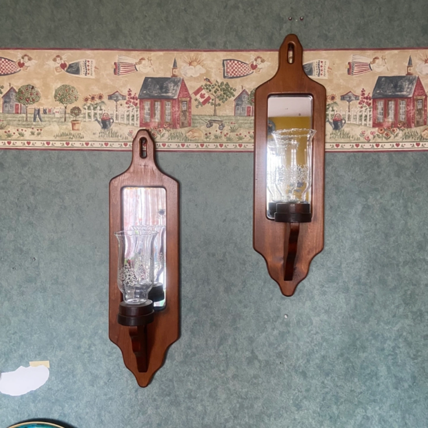 Selling a set of two wooden candle holders with mirrors. They add a touch of rustic charm to any room. Perfect for creating a cozy atmosphere!