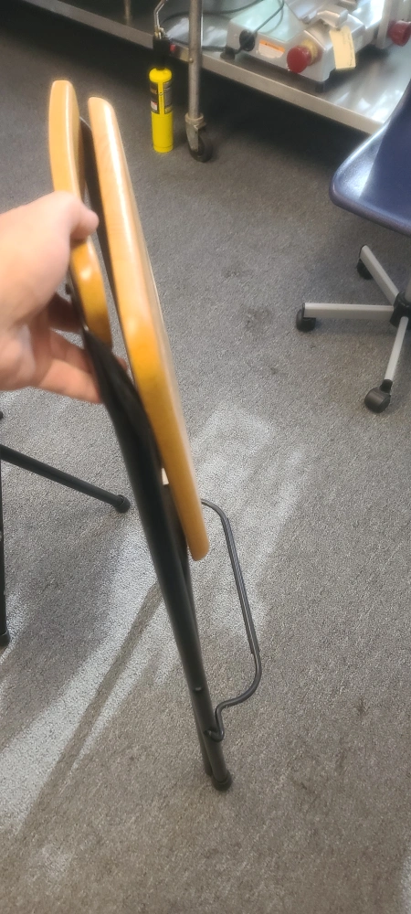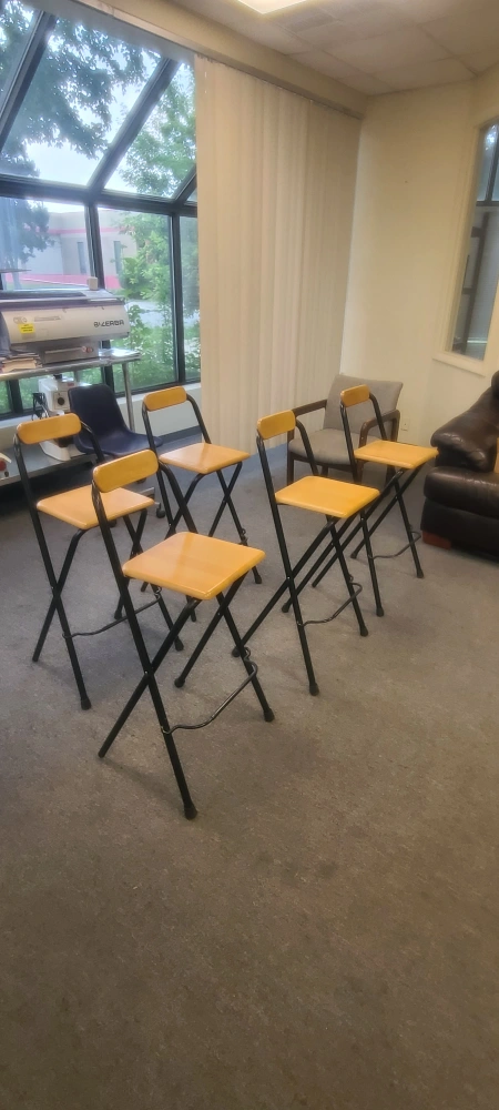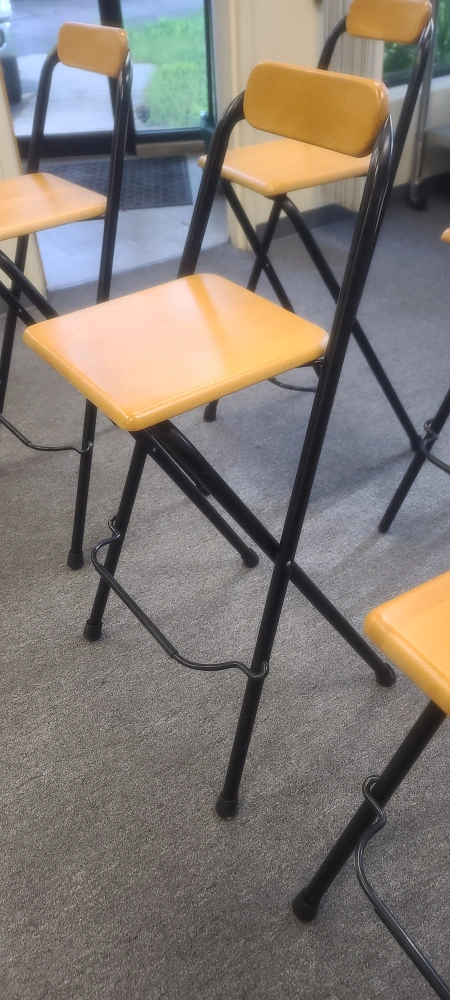 5Bar stool with a wooden seat and backrest. Black metal legs. The perfect stool to have while you sit back and enjoy a morning coffee. Also, folding and easy to store. Will give a discount to a buyer of all 5 stools!!!!