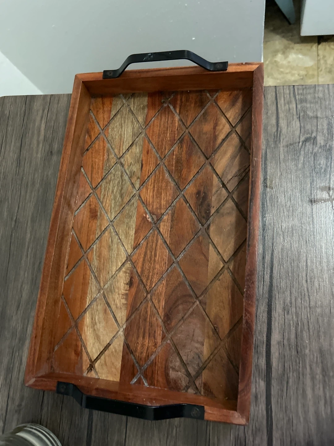 46Here's a wooden serving tray with black metal handles! It has a diamond pattern carved into the wood, giving it a unique look