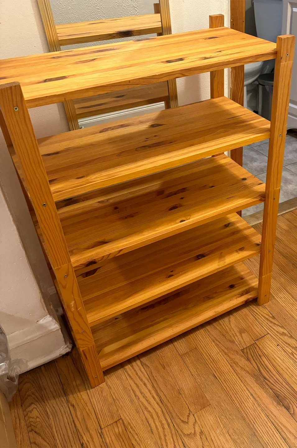 5Selling a wooden shelf, perfect for adding storage to any room. It features multiple shelves, providing ample space for books, decor, or other items. The shelf is in good condition and ready for a new home!