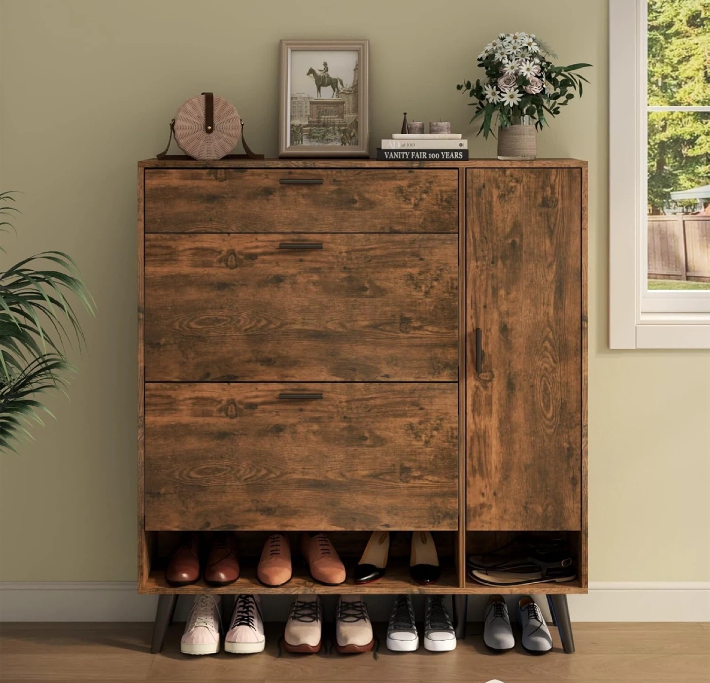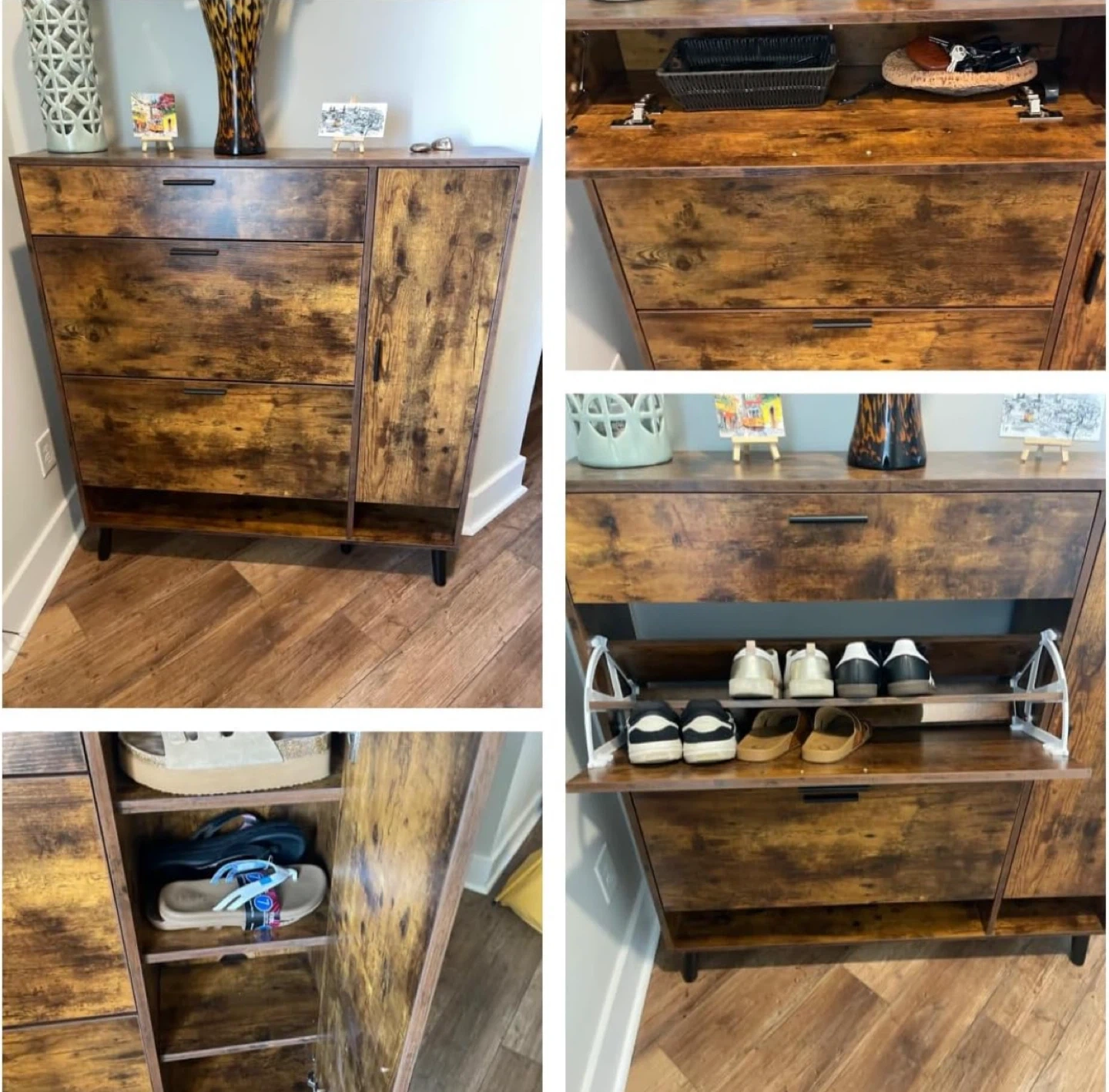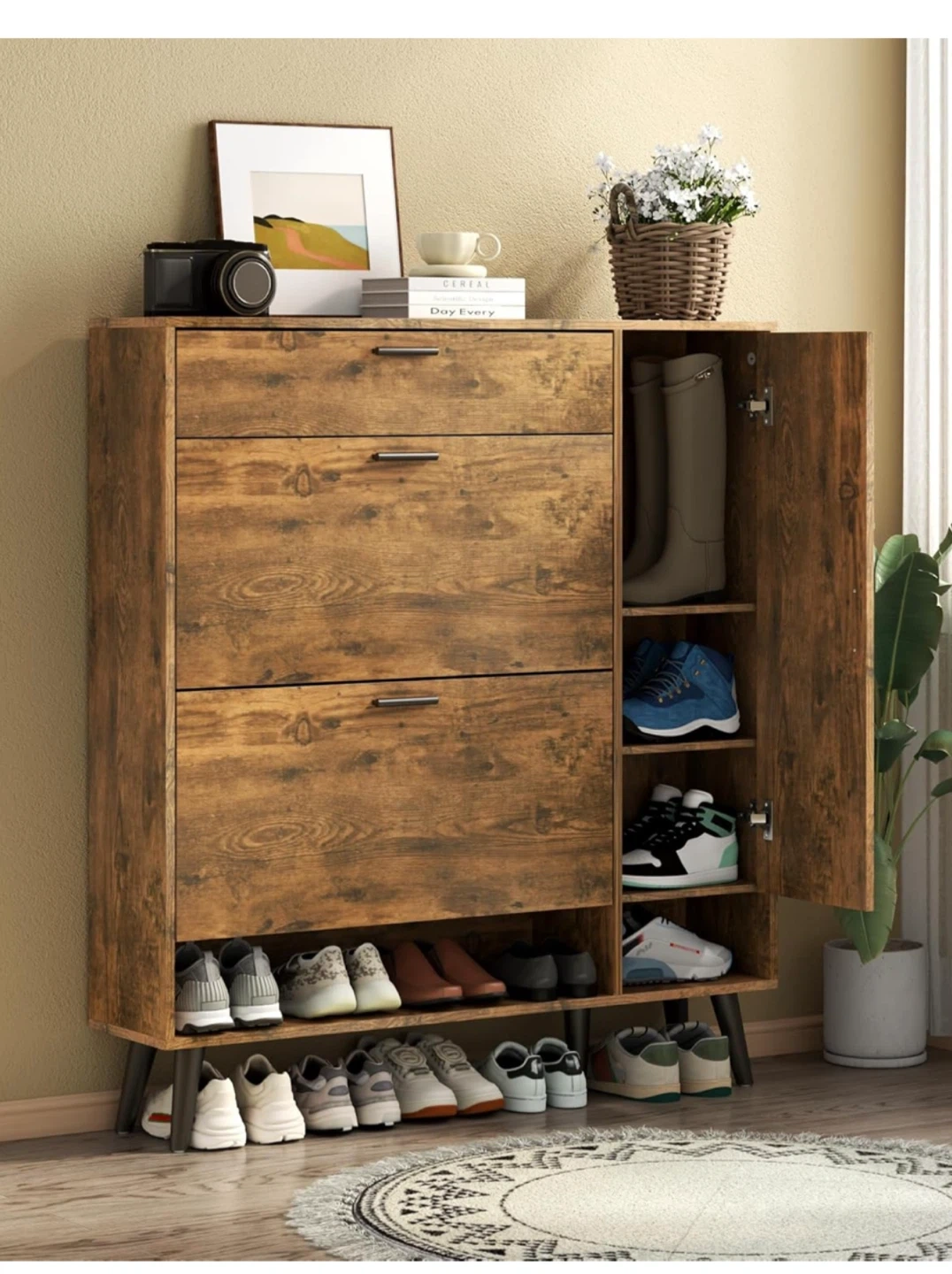 This wooden shoe cabinet is a great way to organize your entryway or closet! It features: - Three flip drawers for shoe storage - A side cabinet with adjustable shelves for boots or other items - A rustic brown finish that will complement any decor It's in great condition and ready for a new home
