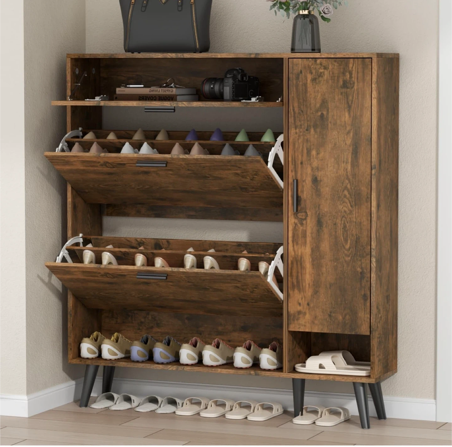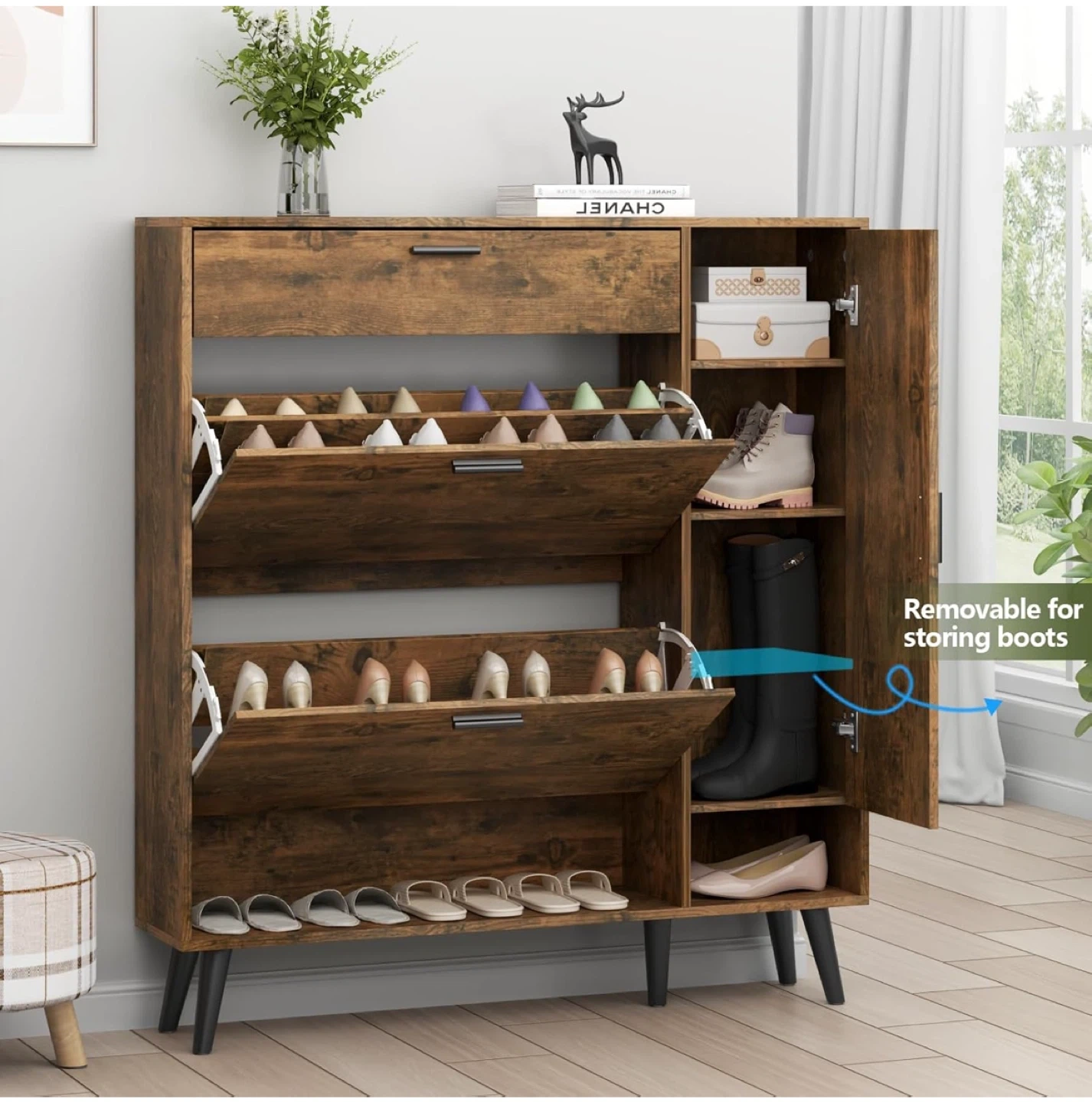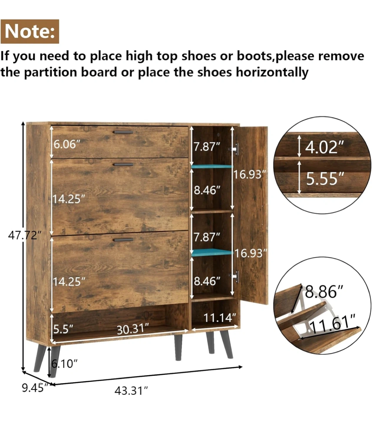 This wooden shoe cabinet is a great way to organize your entryway or closet! It features: - Three flip drawers for shoe storage - A side cabinet with adjustable shelves for boots or other items - A rustic brown finish that will complement any decor It's in great condition and ready for a new home