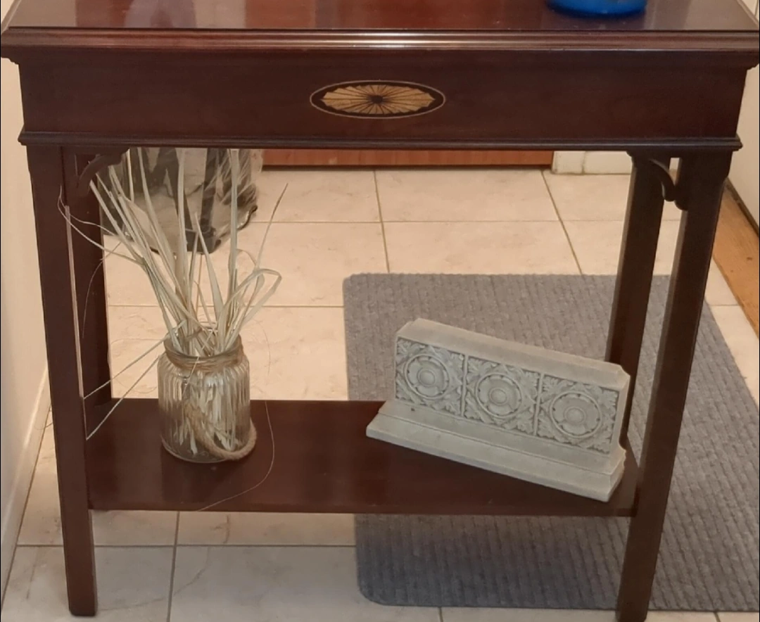 I'm selling a wooden side table. It has a dark wood finish and a unique design on the side. It would look great in any living room or bedroom!
