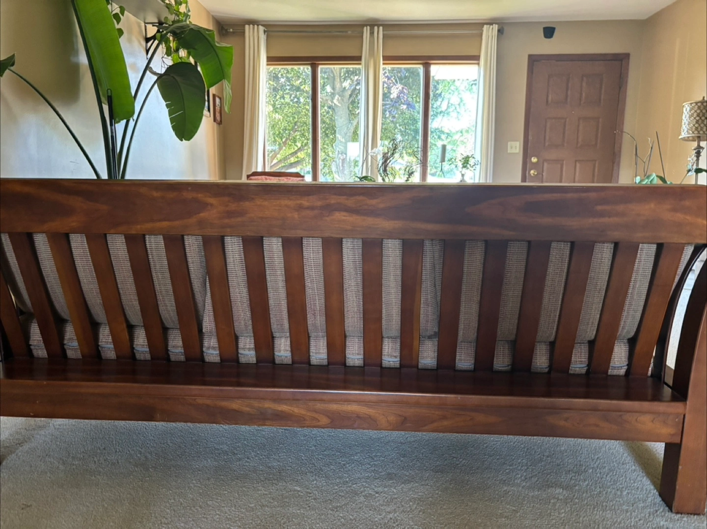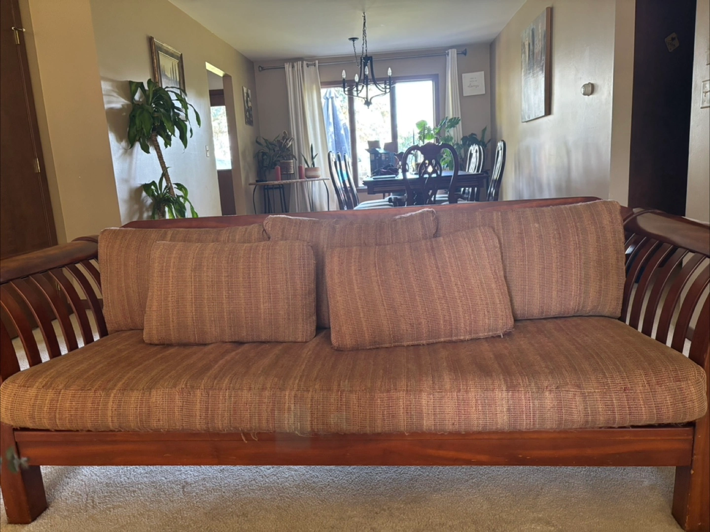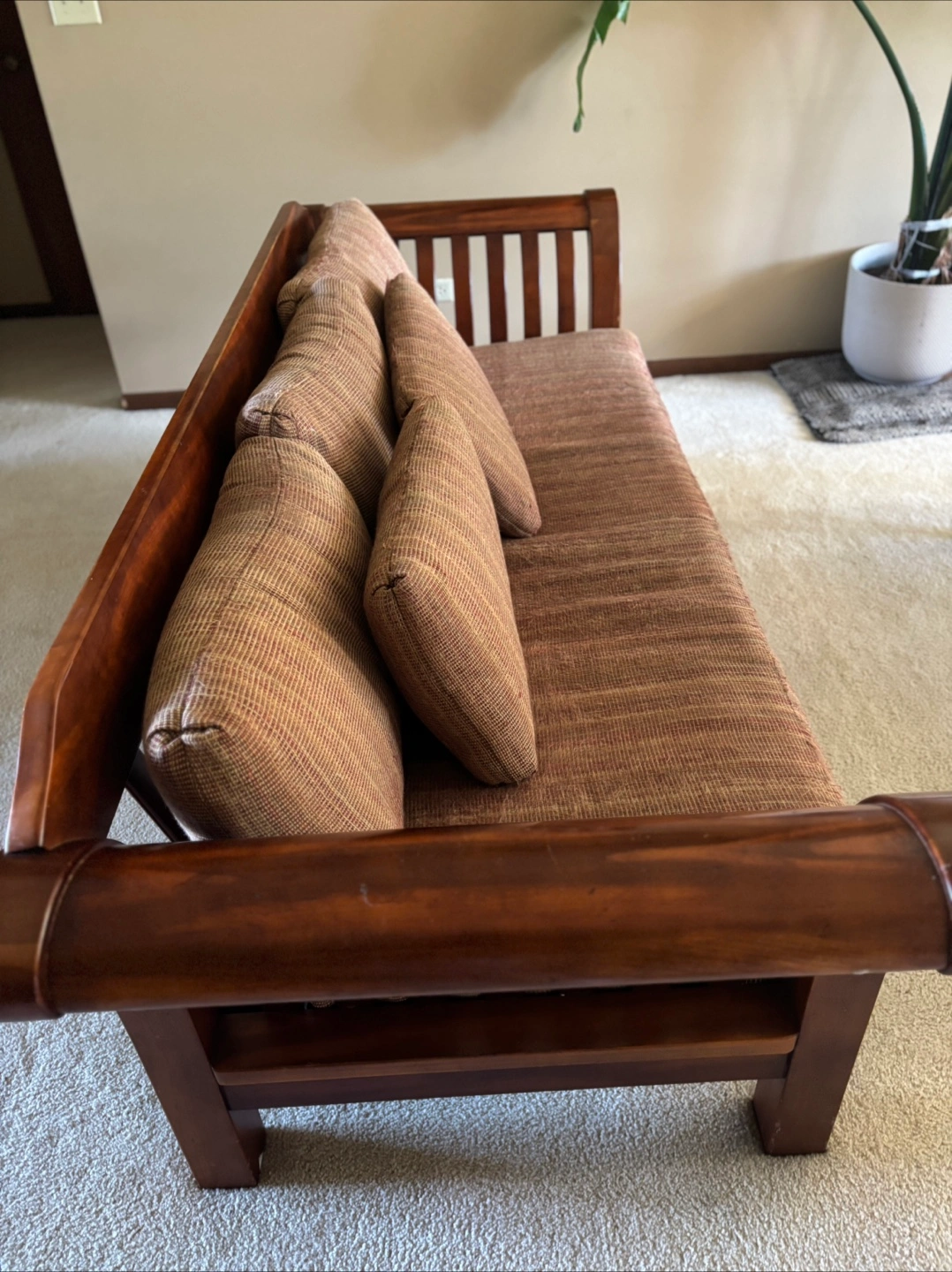 Selling a lovely wooden sofa that's in great condition. It comes with comfortable cushions, perfect for relaxing. The wooden frame is sturdy and has a beautiful finish. It would be a great addition to any living room or seating area