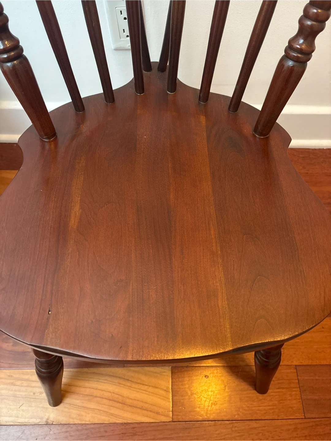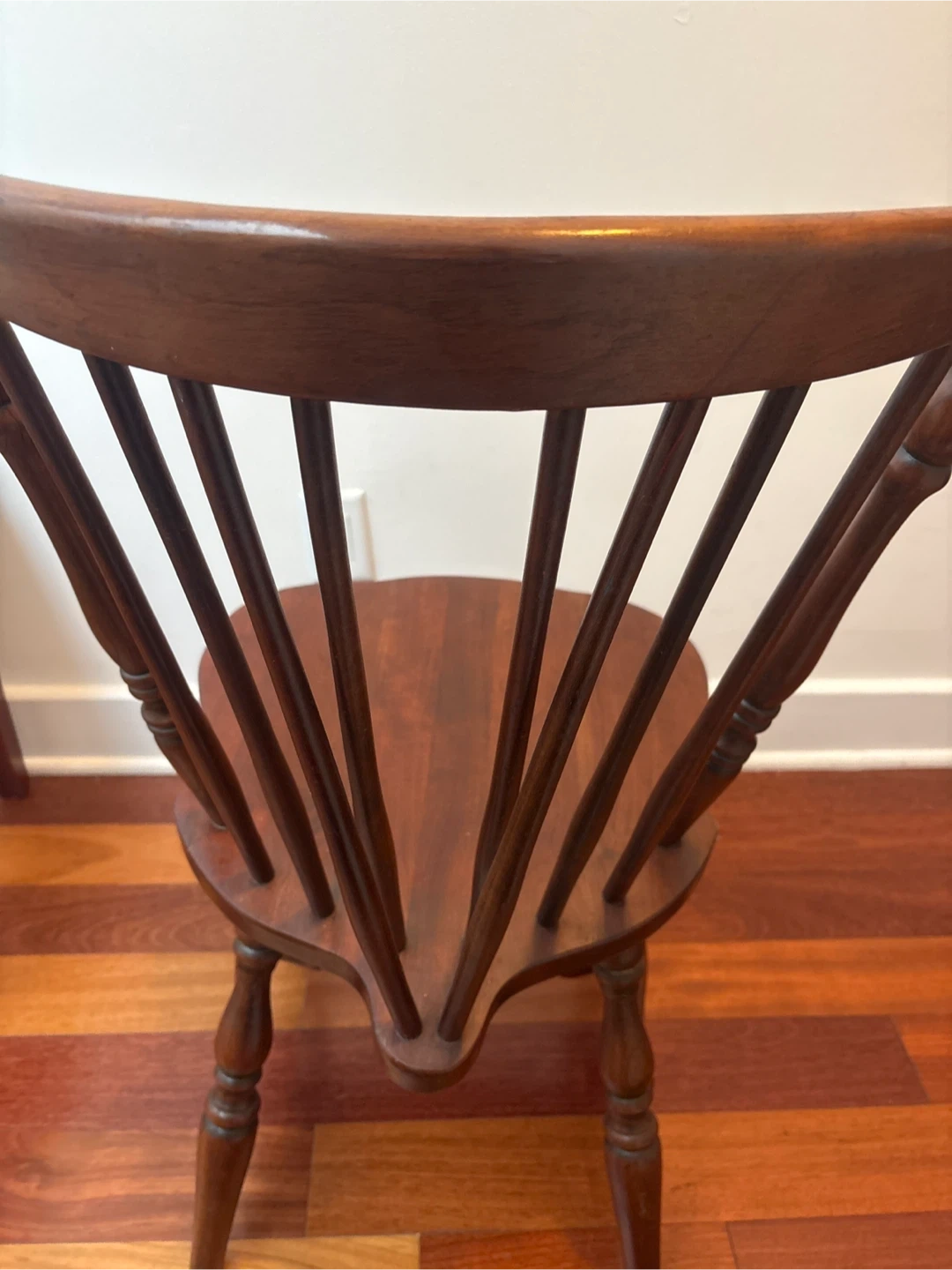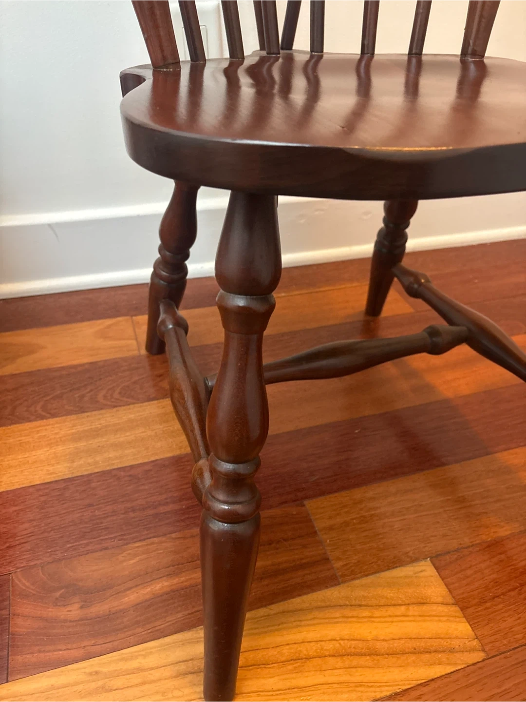 Here's a lovely wooden spindle back chair! It's in great shape and would look great in any room. It has a classic design and sturdy construction, perfect for adding a touch of elegance to your home