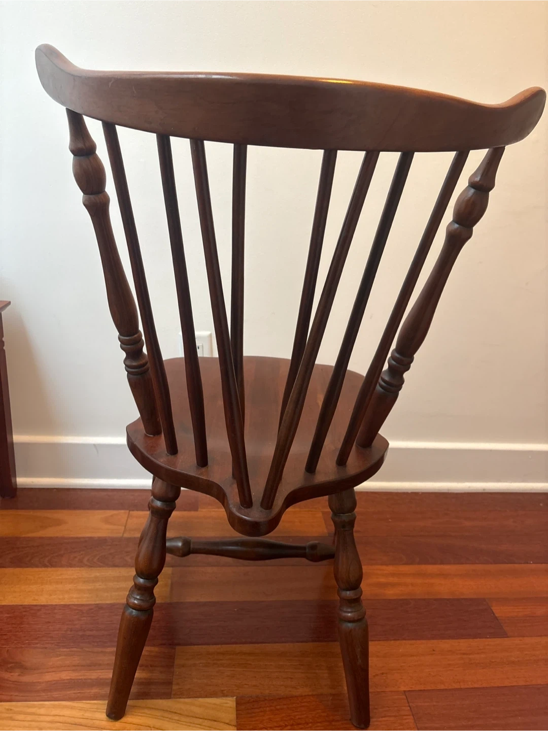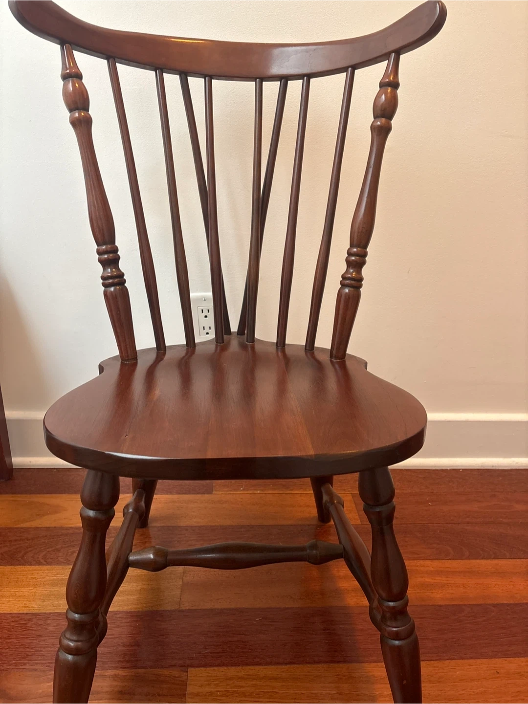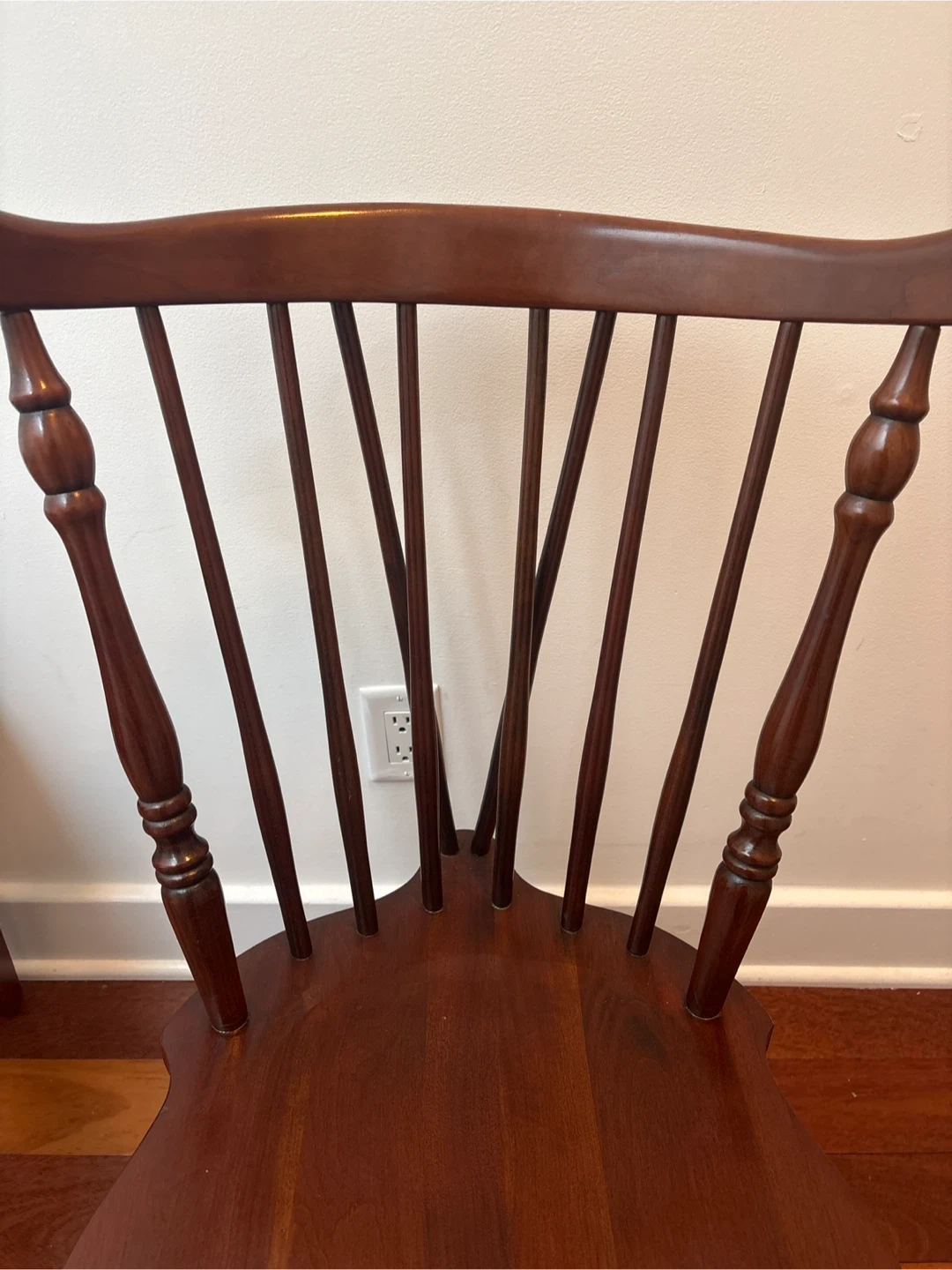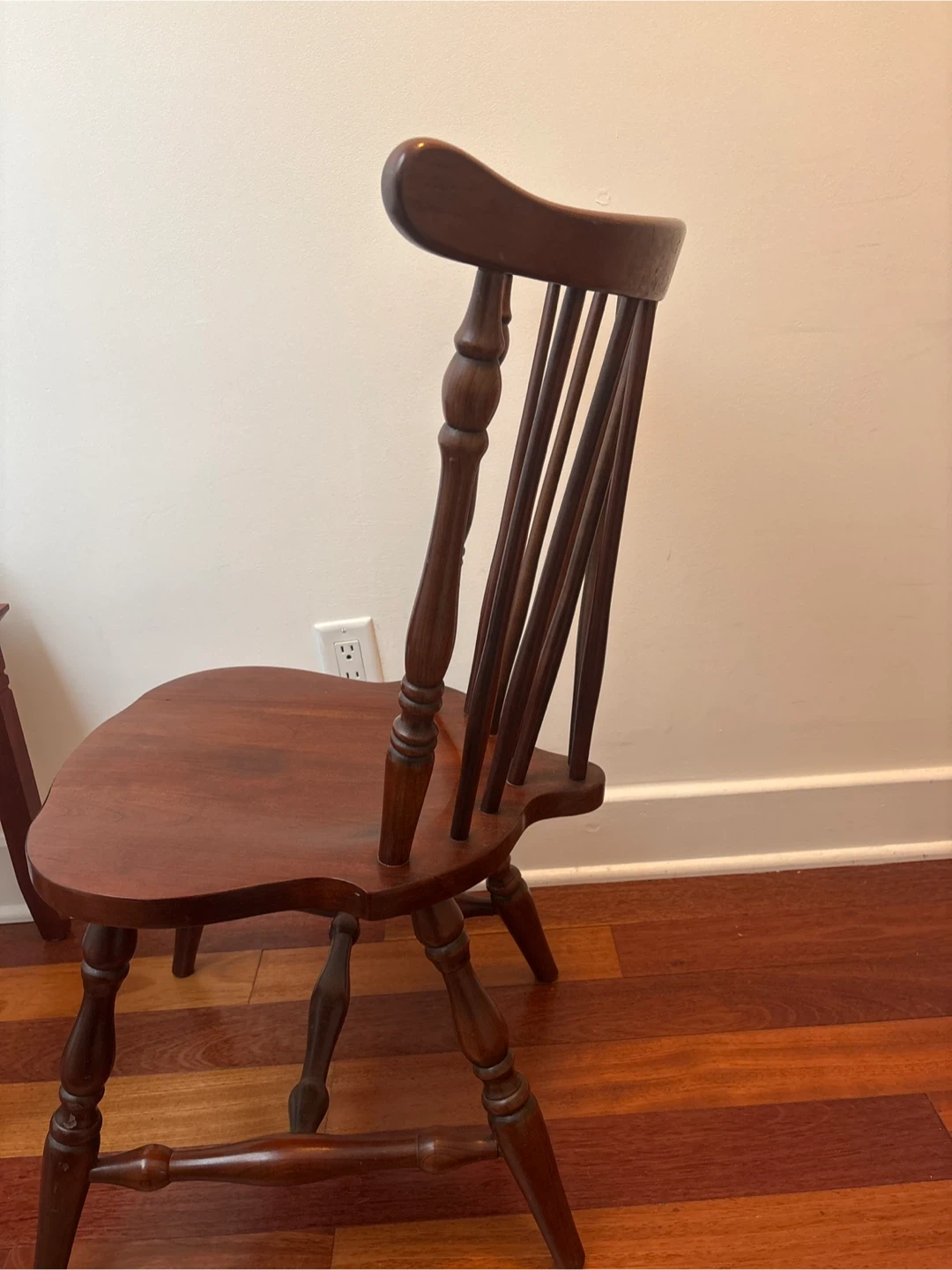 Here's a lovely wooden spindle back chair! It's in great shape and would look great in any room. It has a classic design and sturdy construction, perfect for adding a touch of elegance to your home