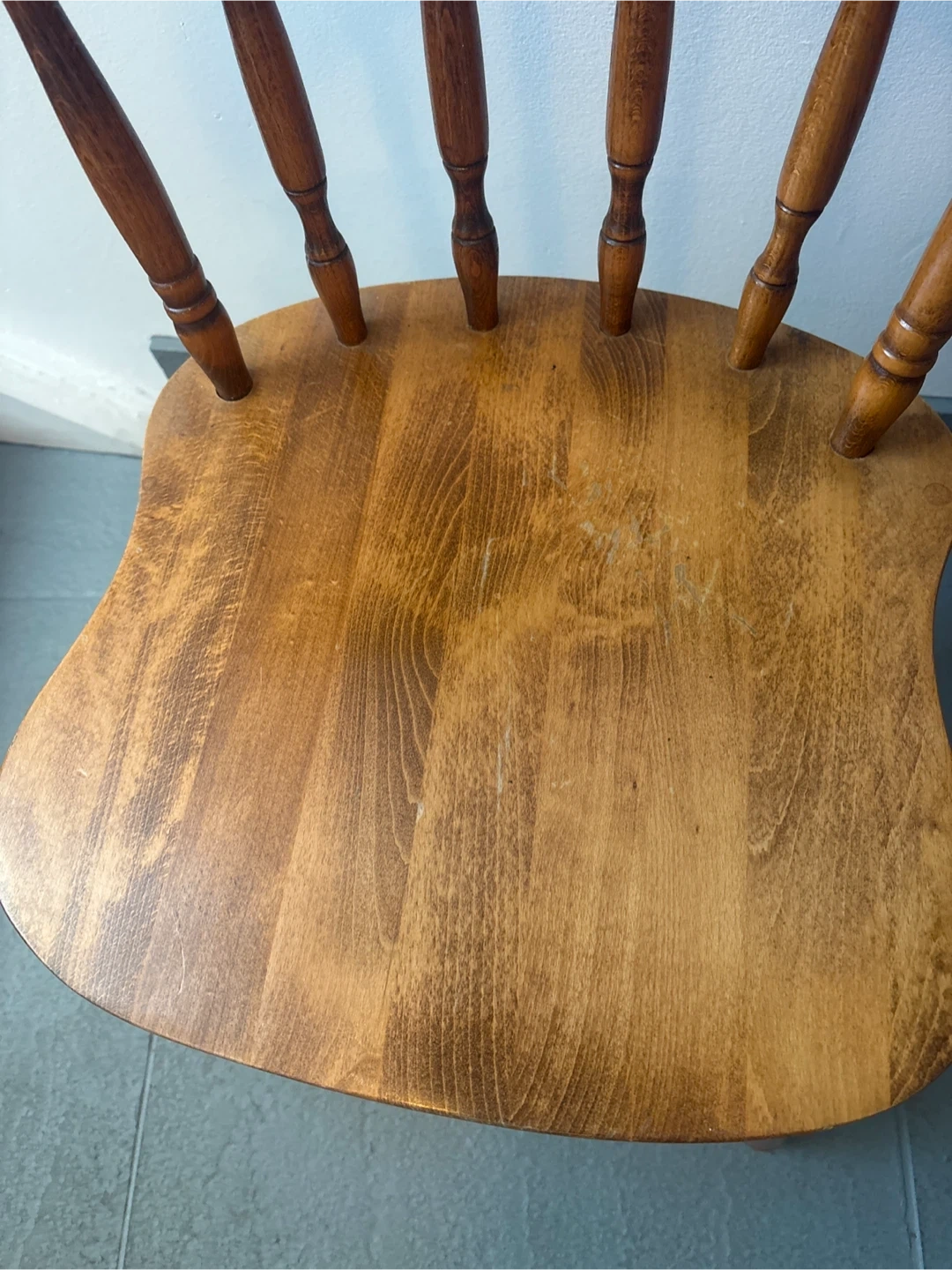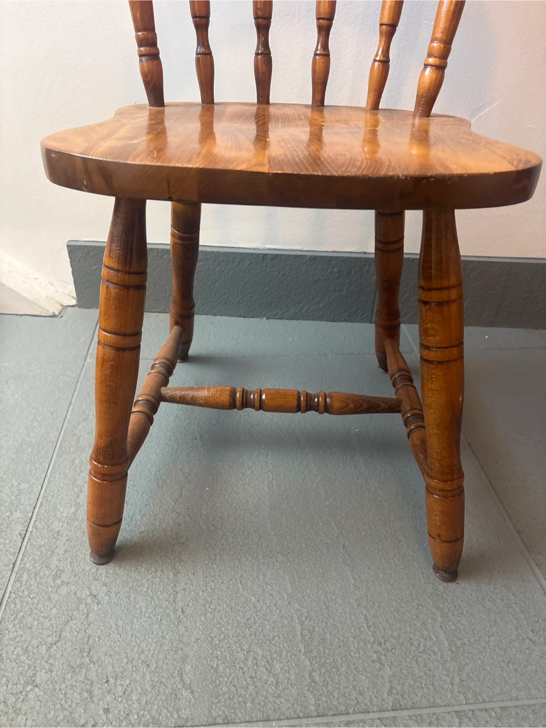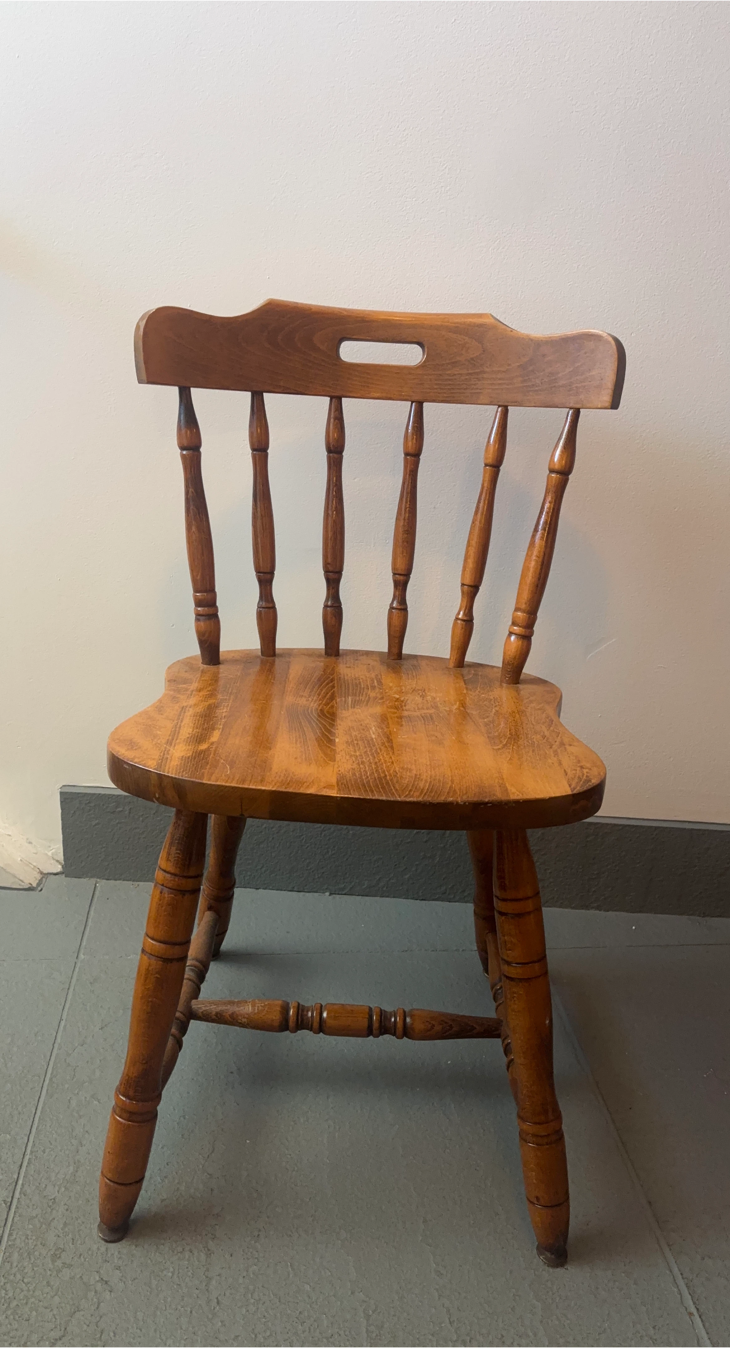 Here's a classic wooden chair with a spindle back design! It's a sturdy piece with a warm, natural wood finish. Perfect for adding a touch of traditional charm to your dining area or kitchen