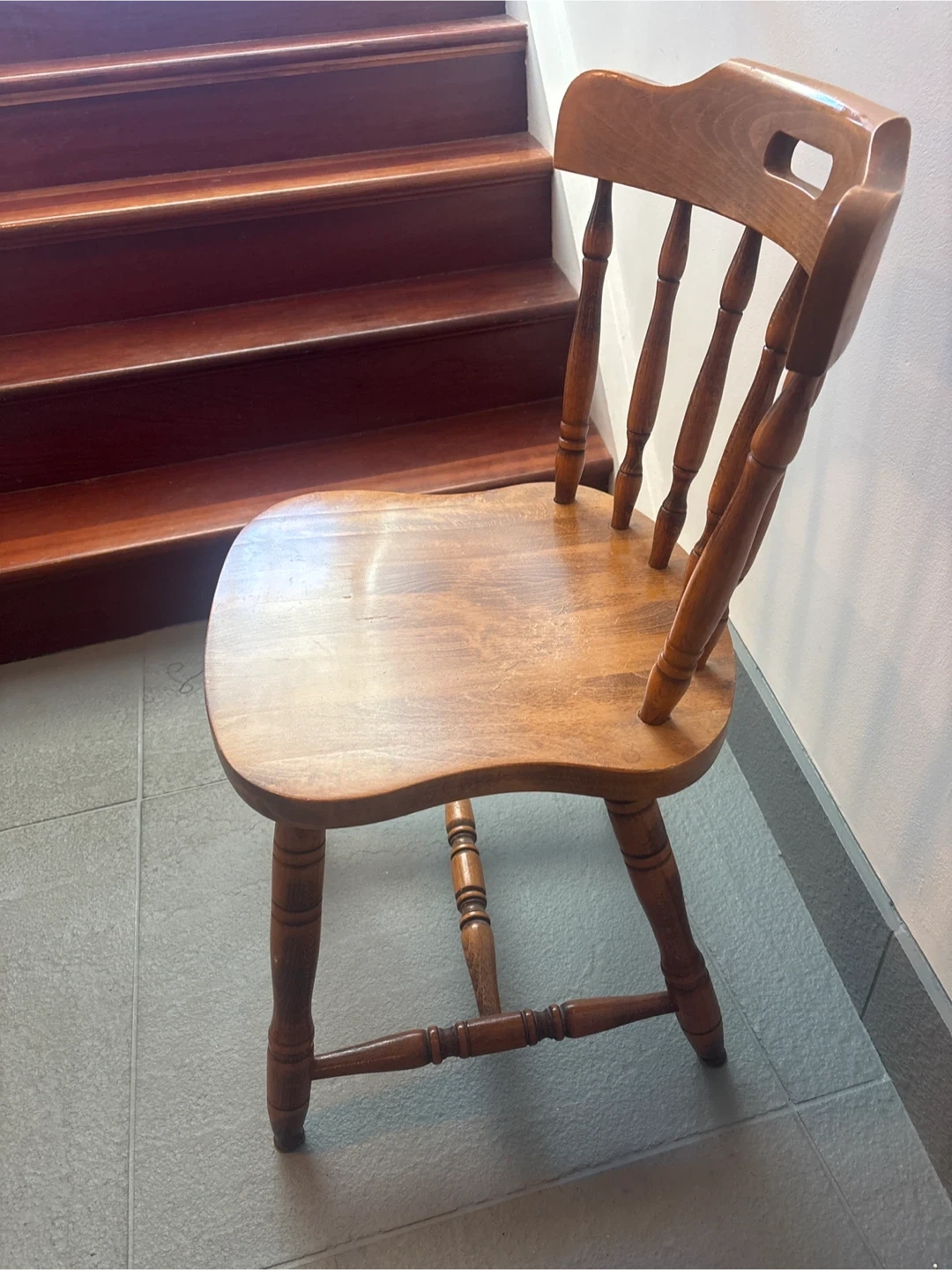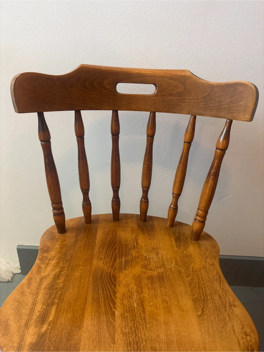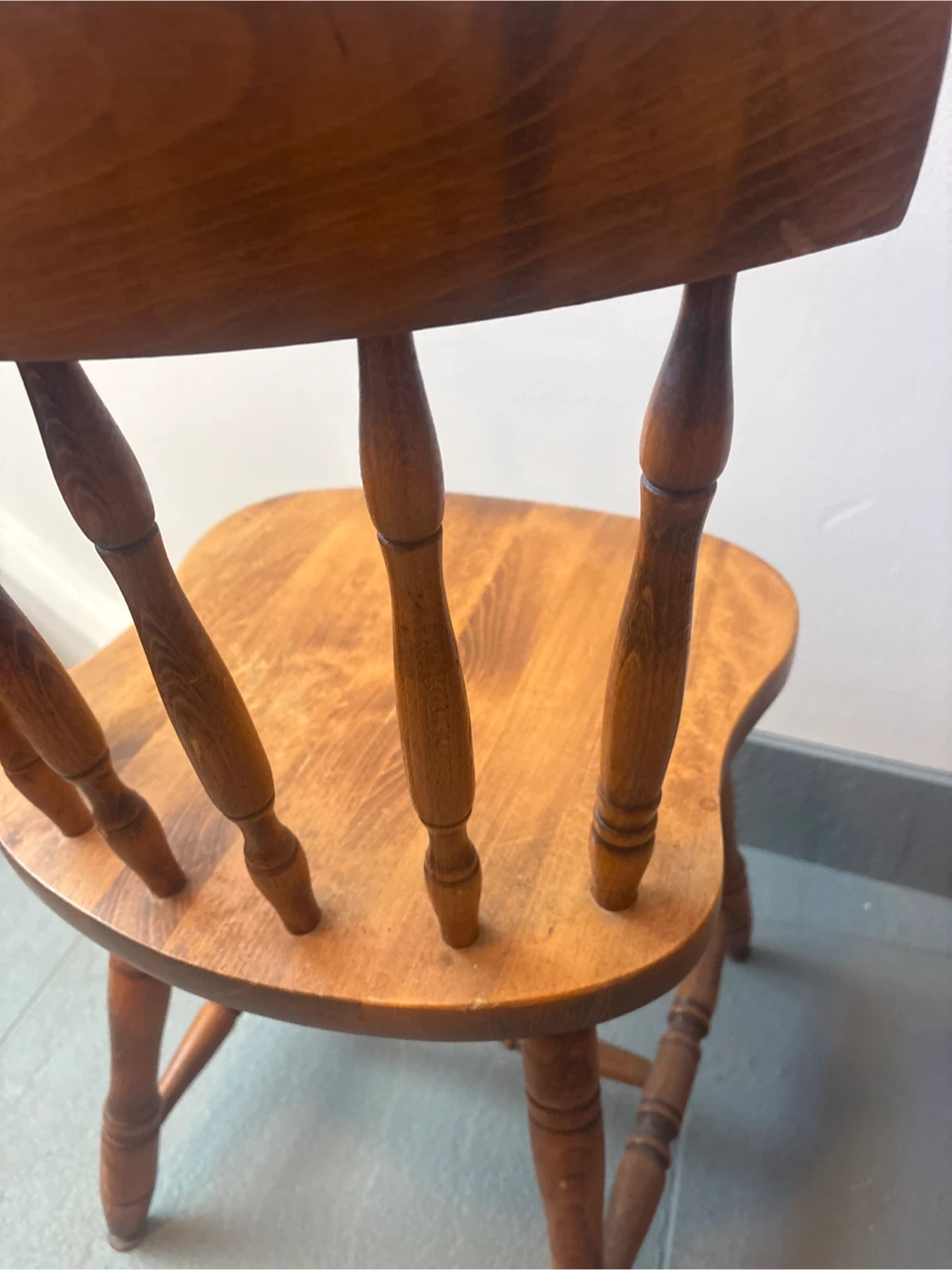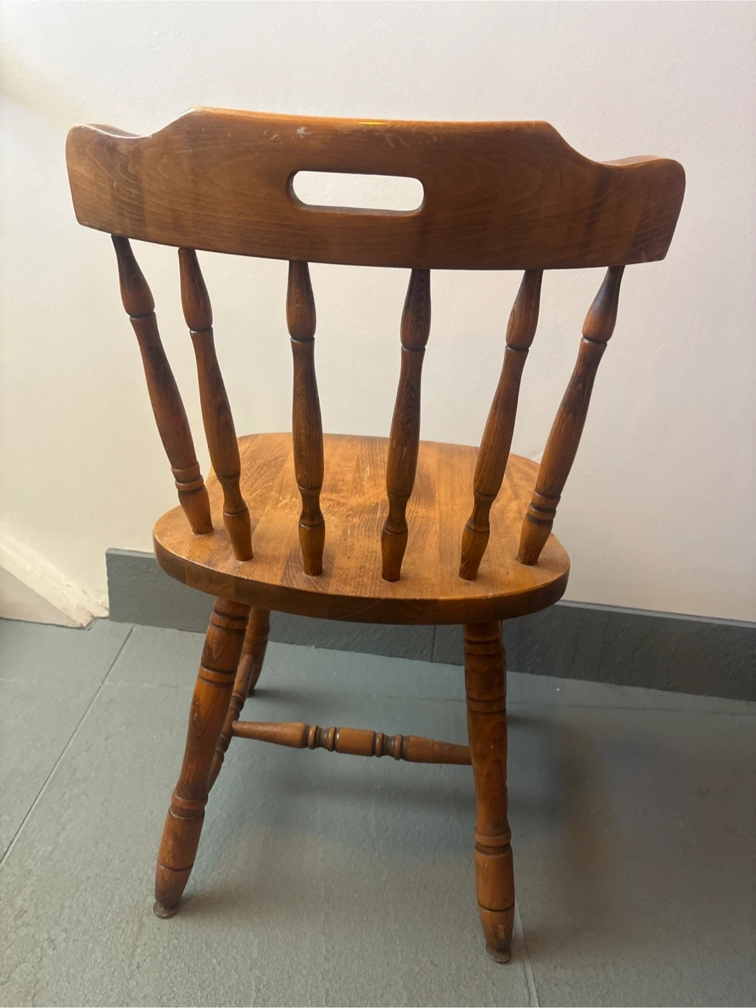 Here's a classic wooden chair with a spindle back design! It's a sturdy piece with a warm, natural wood finish. Perfect for adding a touch of traditional charm to your dining area or kitchen