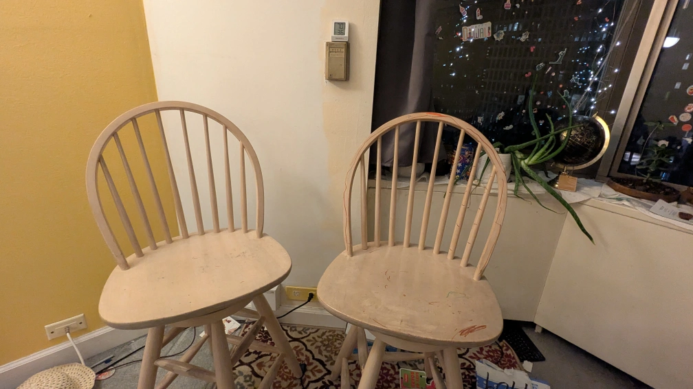 84Selling a set of two wooden swivel bar stools. They have a light wood finish and a classic design. Perfect for adding some seating to your kitchen island or bar area! They show some signs of use. Cream Wood Bar Height Windsor Stools – a pair