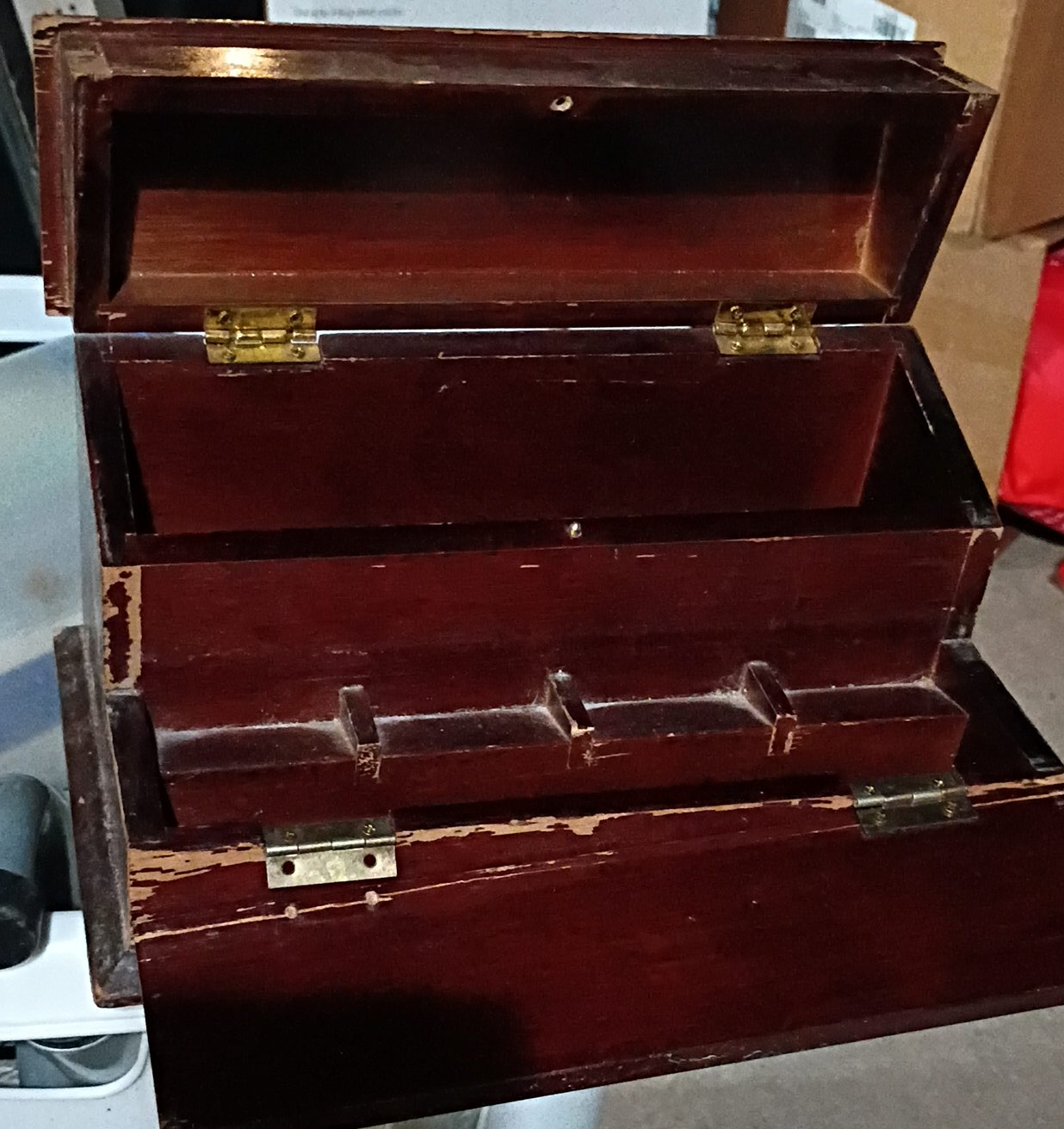 10Selling a wooden tool box. It has some wear and tear, but it's still sturdy and functional. Great for storing tools or other items.