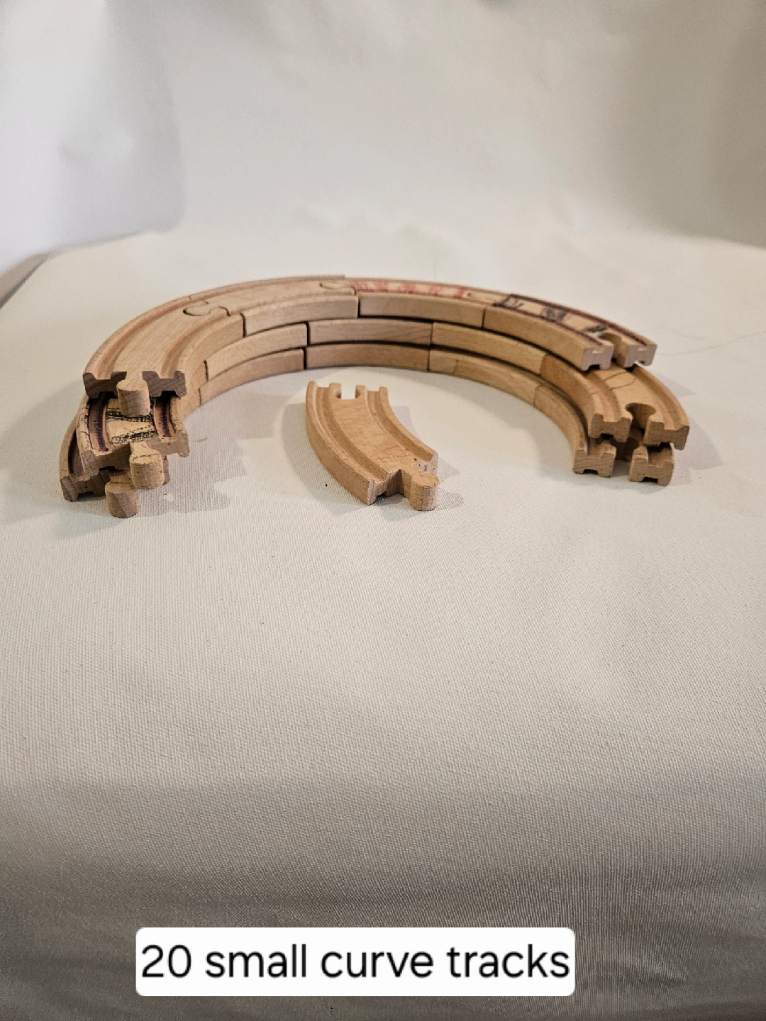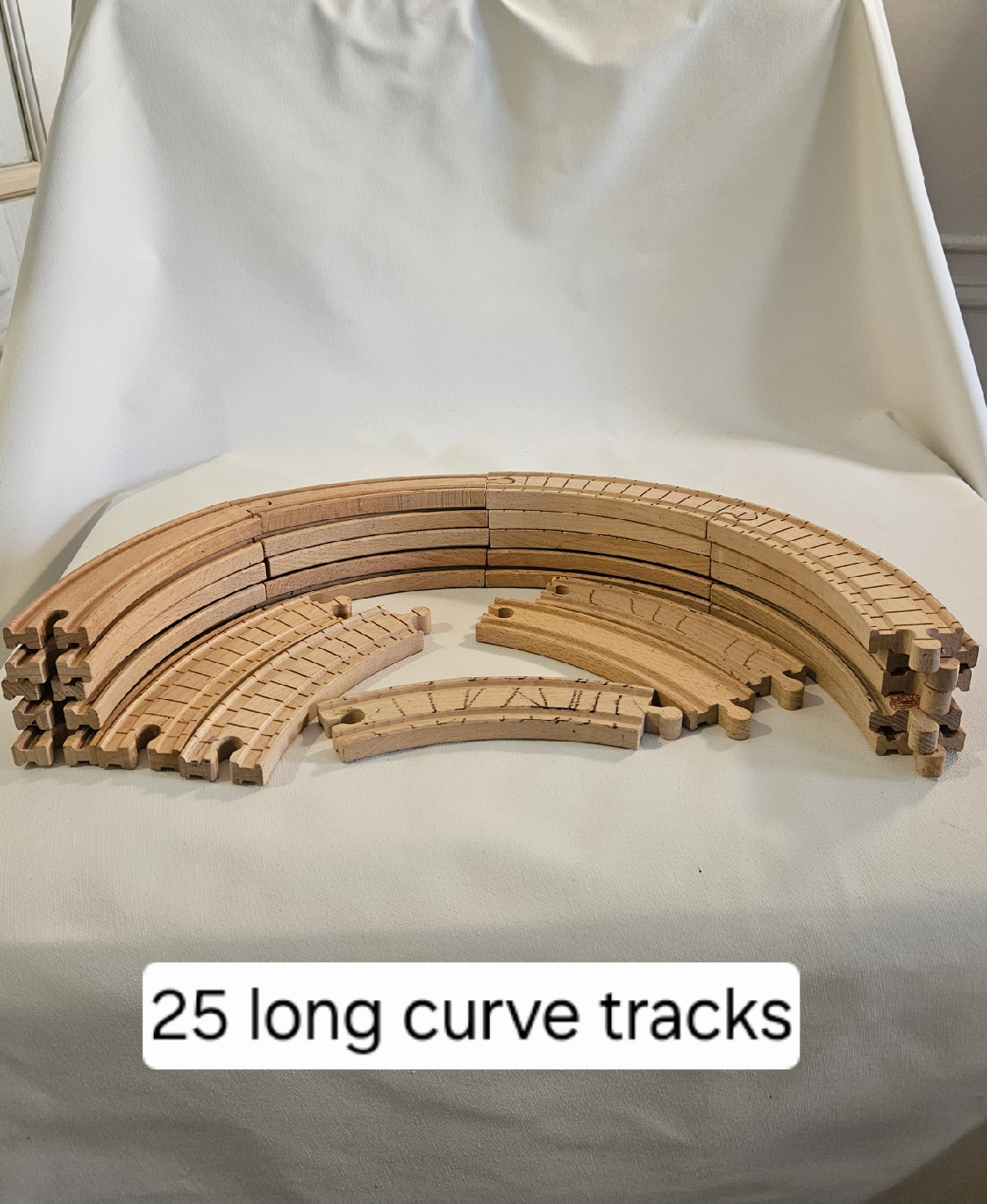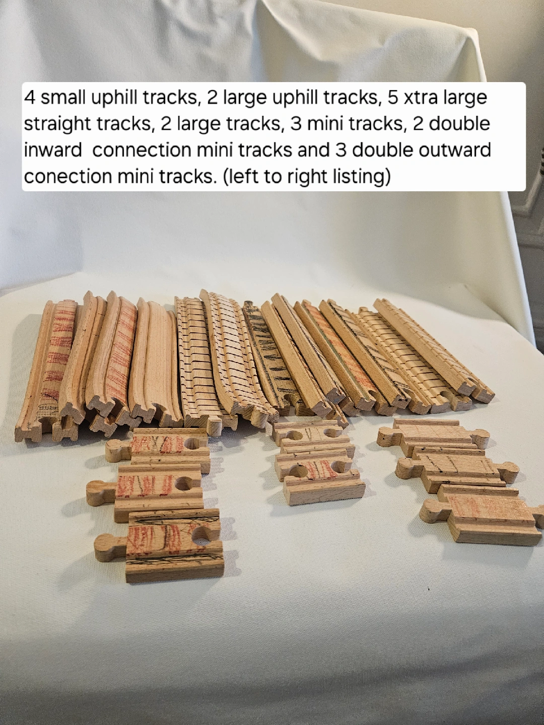 Selling a set of wooden train tracks! Includes 25 long curve tracks, 20 small curve tracks, 4 small uphill tracks, 2 large uphill tracks, 5 extra large straight tracks, 2 large tracks, 3 mini tracks, 2 double inward connection mini tracks and 3 double outward connection mini tracks, 7 extra small straight tracks, 2 small tracks and 4 medium tracks, also includes many trains, funtioning drawbridge, station with elevator and much more from brio and other brands