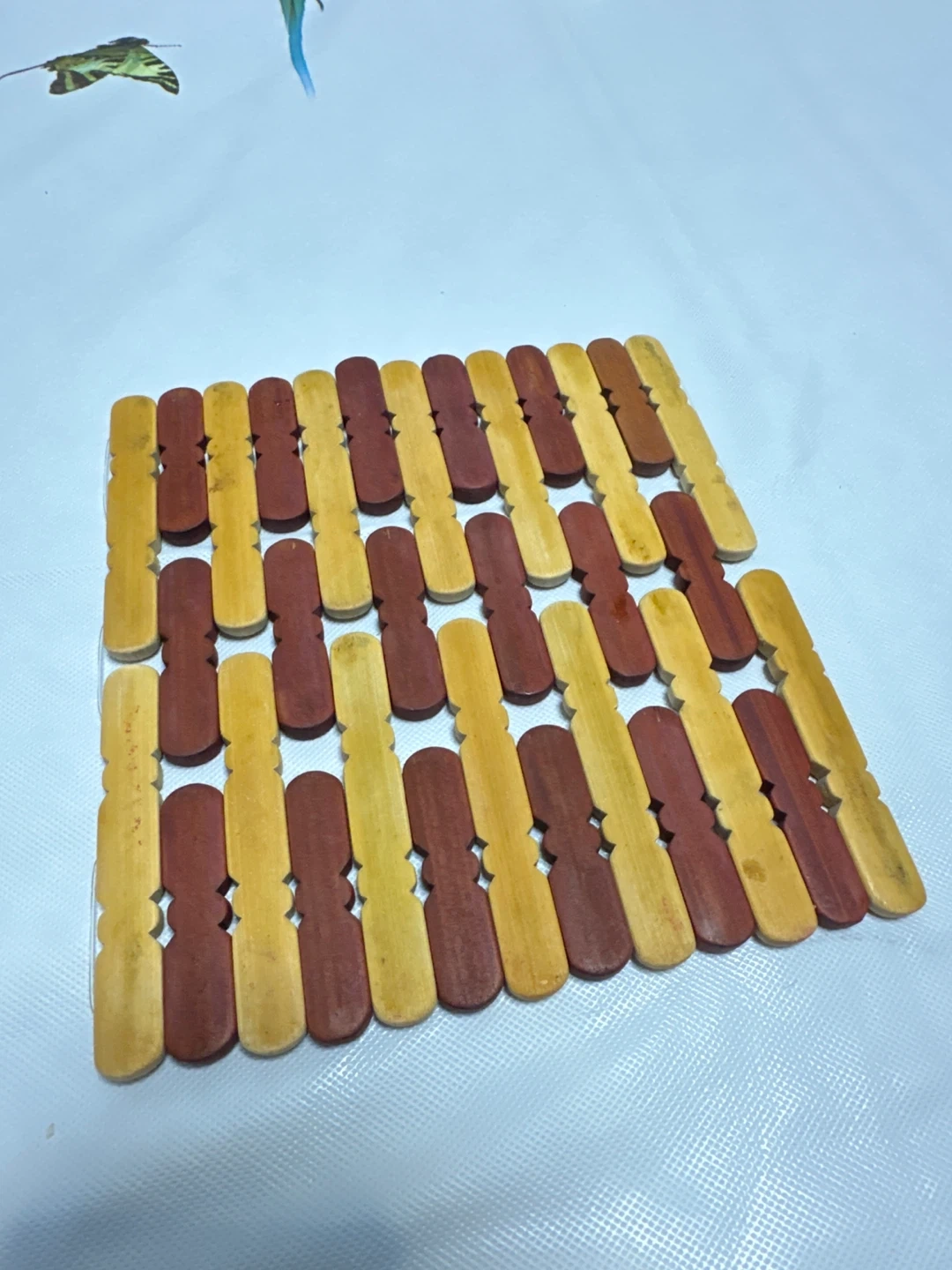 I'm selling a wooden trivet with alternating brown and yellow slats. It's in great condition and ready to protect your table from hot dishes!