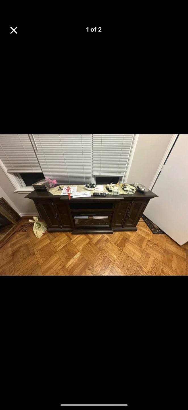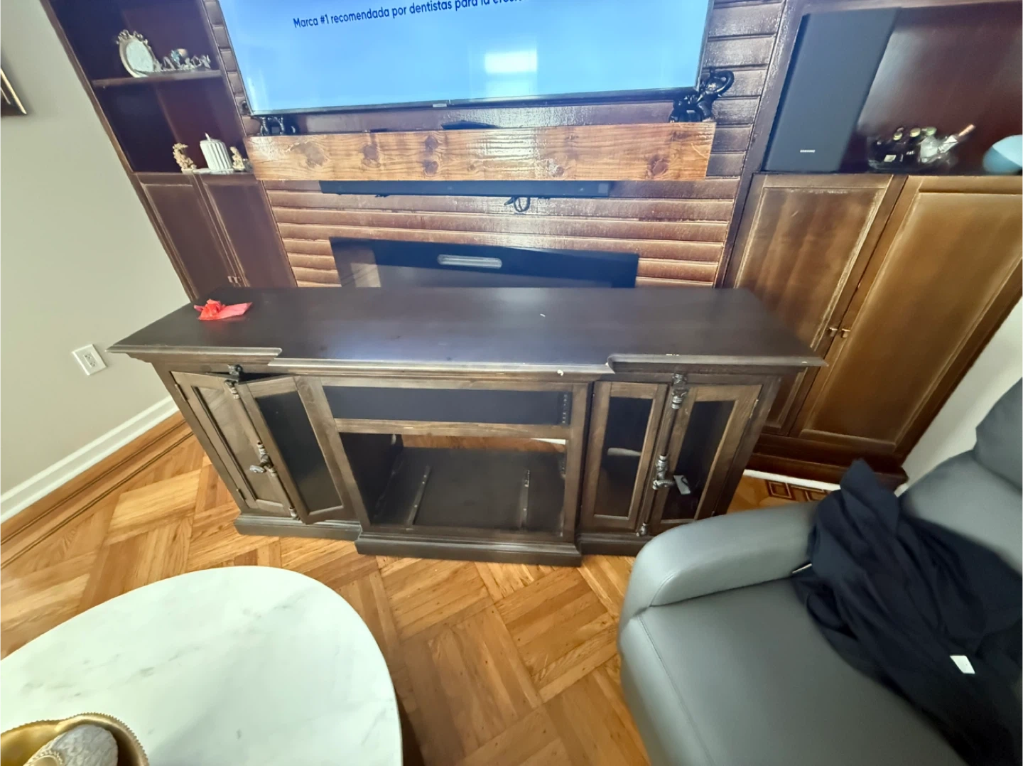Selling a wooden TV stand. It's in good condition and has plenty of storage space for your media devices and accessories. The stand features cabinets and open shelves, providing a versatile solution for organizing your entertainment area. It's a sturdy and stylish piece that would look great in any living room