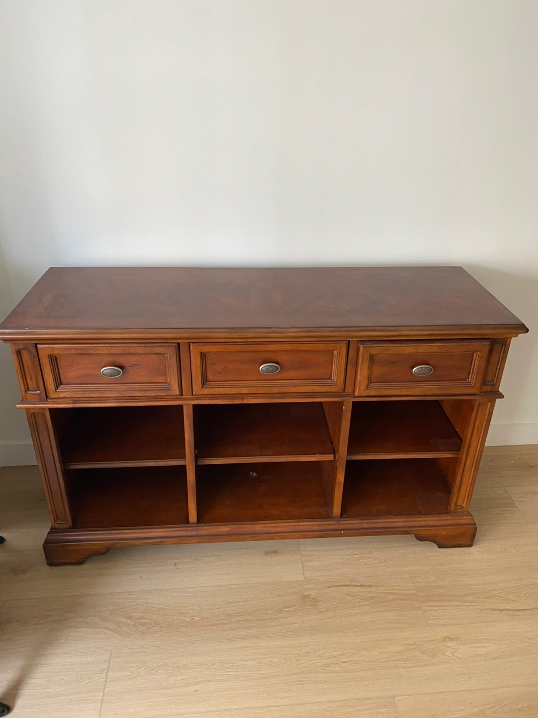 This is a wooden TV stand with three drawers and open shelving for storage. It's a great piece for organizing your living room or entertainment area. The stand is in good condition and has a classic design that would fit well with most decor styles