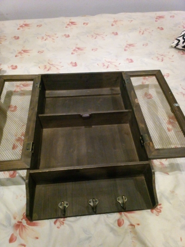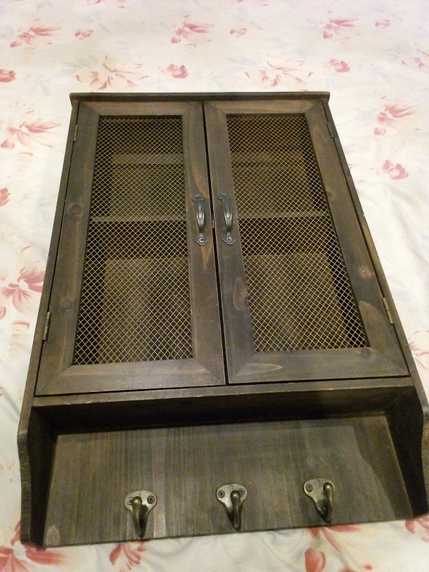 Selling a wooden wall cabinet, perfect for adding some rustic charm and extra storage to your home! It features a cabinet with mesh doors and three hooks at the bottom for hanging keys, coats, or accessories. It's in good condition and ready to be mounted on your wall
