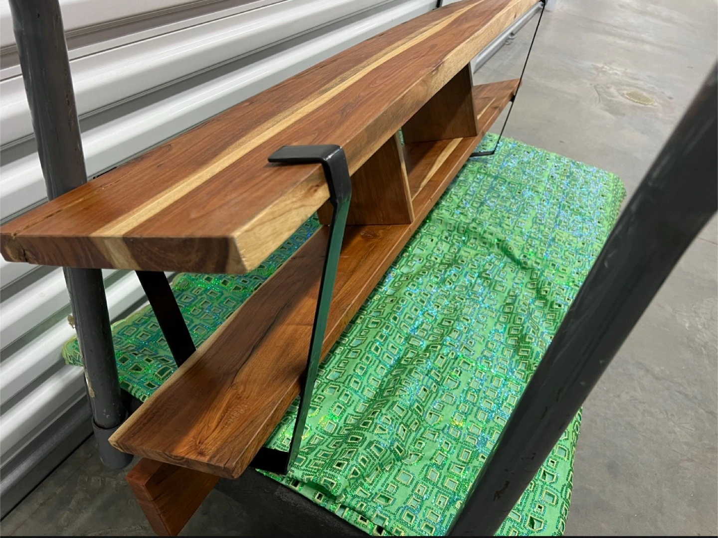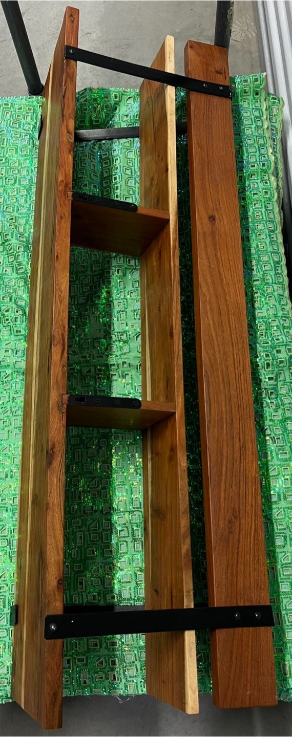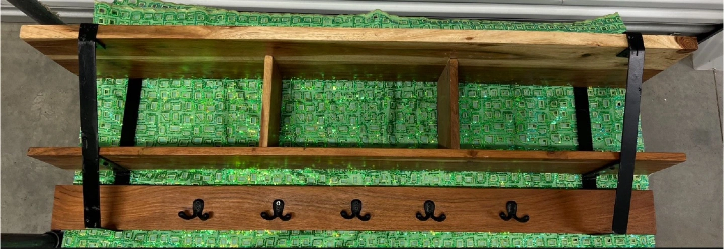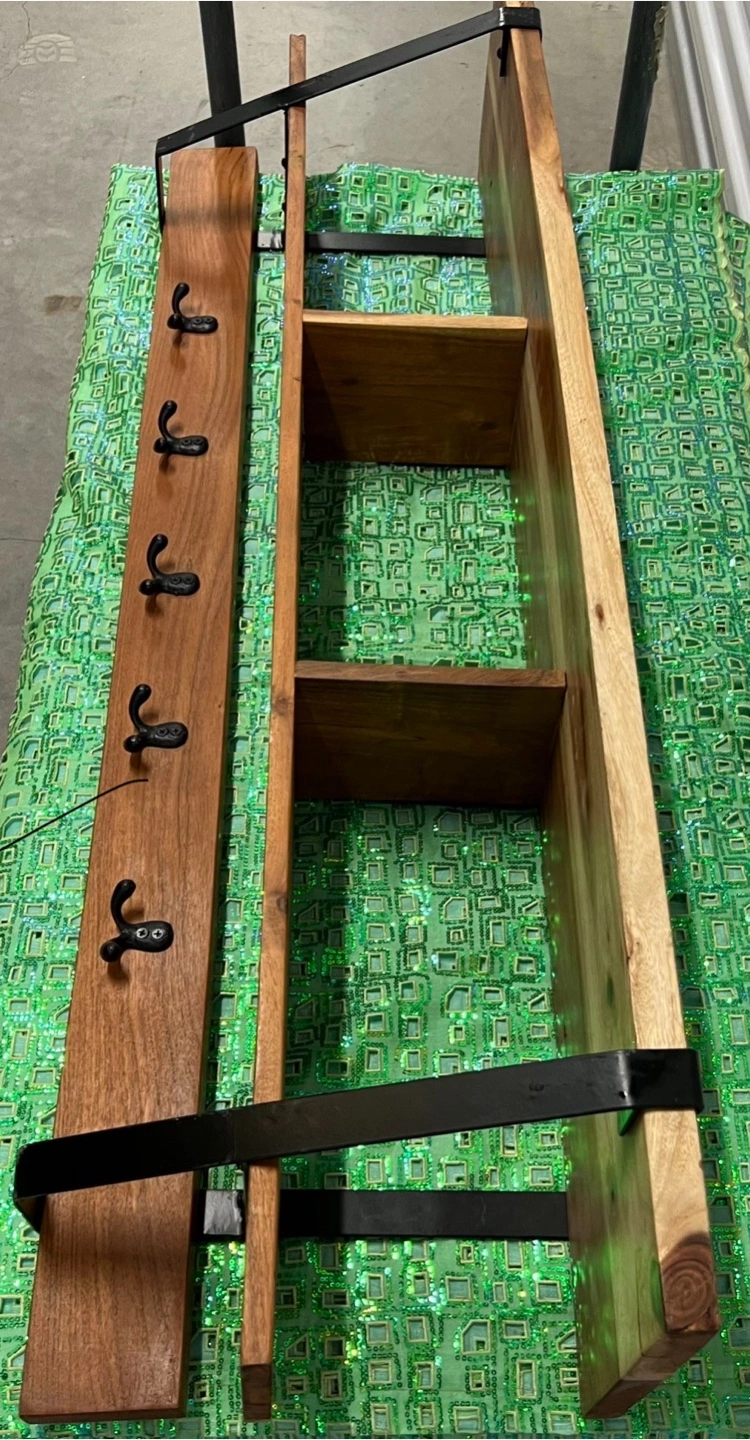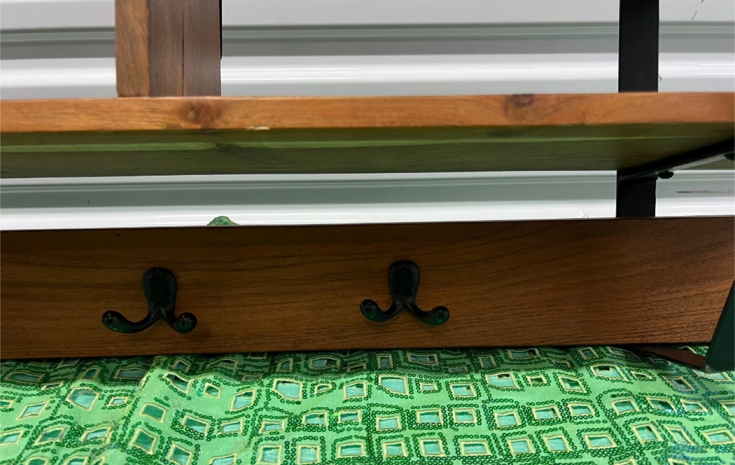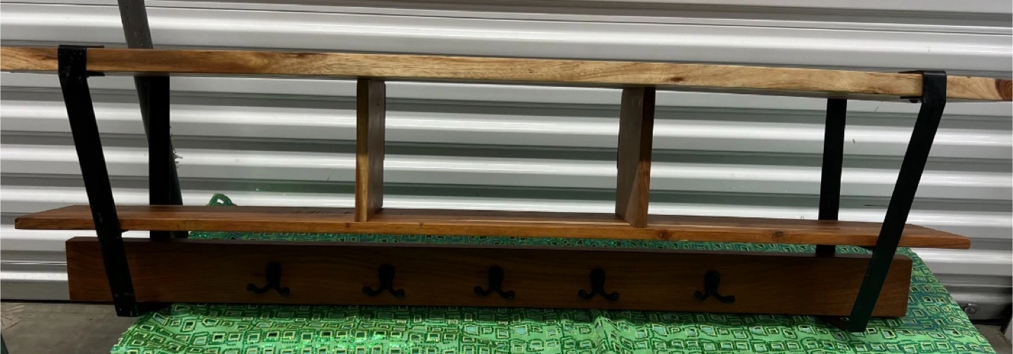 73wooden wall shelf. Features three divided compartments and four hooks. Metal accents. Perfect for entryway or bathroom. Solid heavy piece.