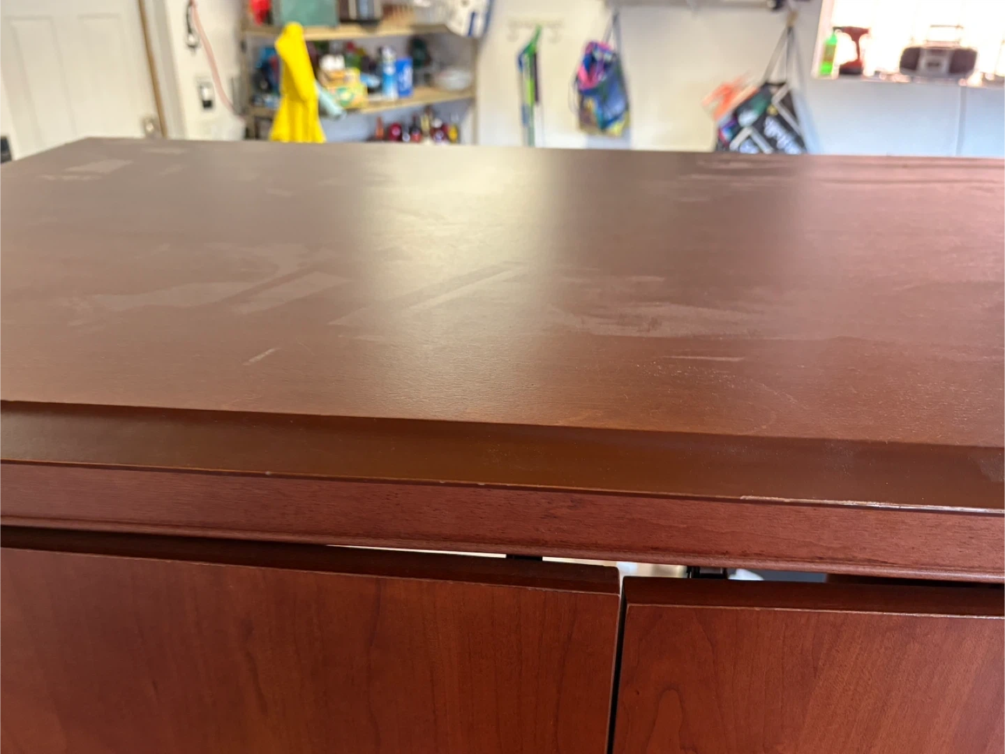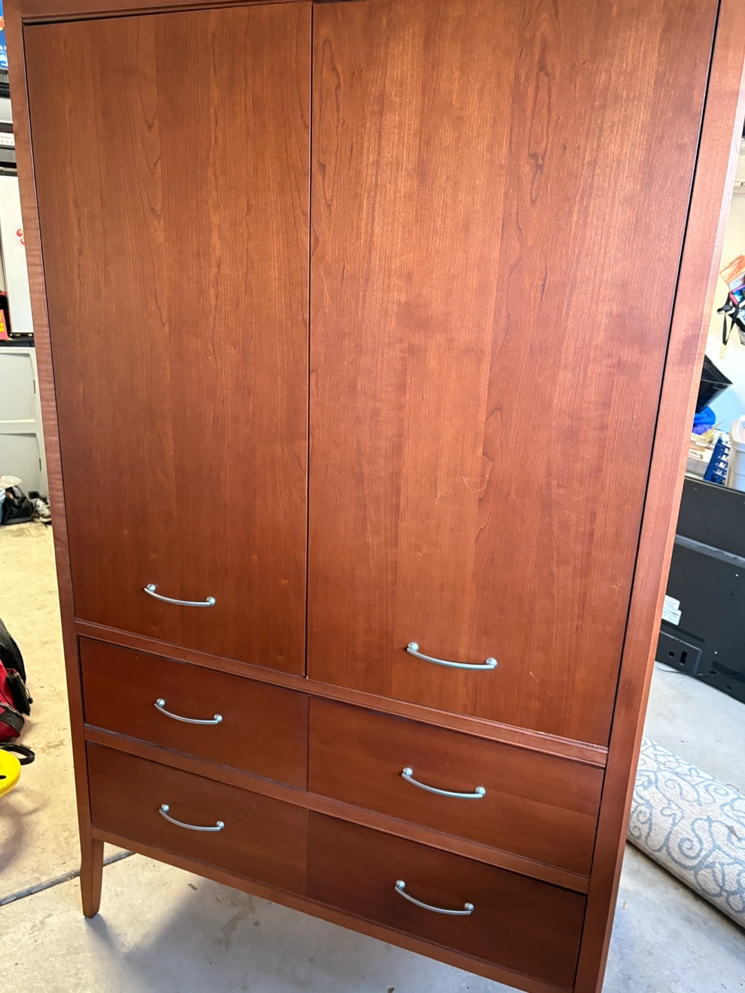 10Here's a wooden wardrobe with drawers. It has a warm, reddish-brown color. It's a great piece for extra storage in a bedroom or closet. Has 3 shelves and 4 drawers. Can also be used as a tv/entertainment cabinet.