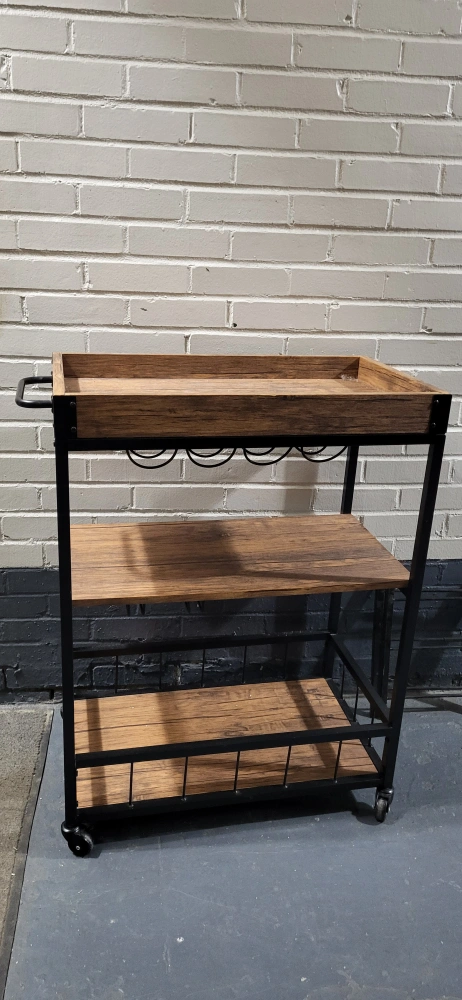 166Wooden and black metal wine cart with wheels. It has 3 tiers, and the top one is removable for use as a serving tray. It has space for you to put bottles of wine under the tray.