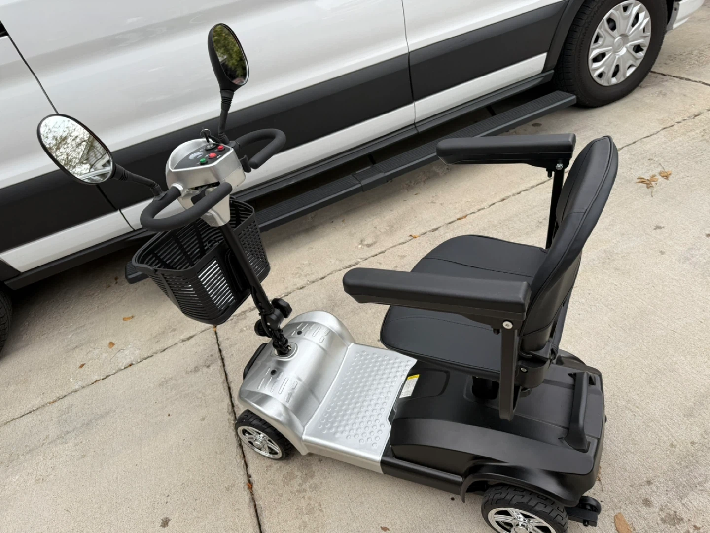 Selling a Wooken mobility scooter in silver and black! It has a comfortable seat and a basket for carrying items. Perfect for getting around with ease