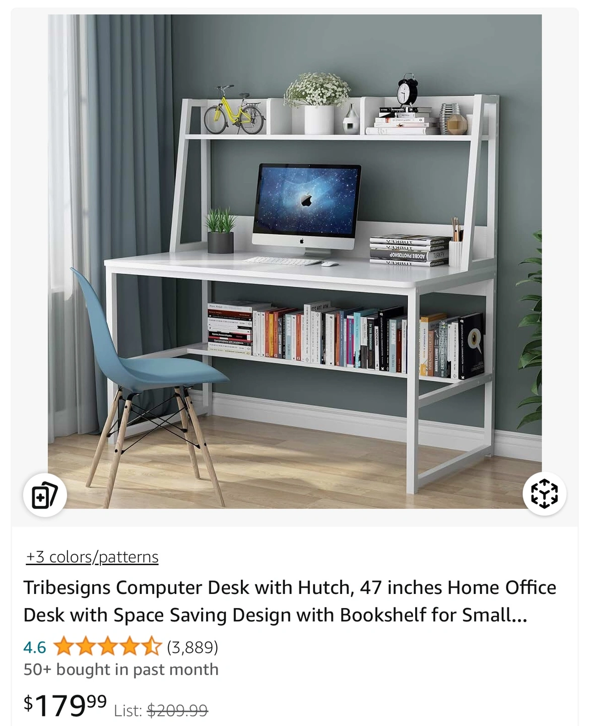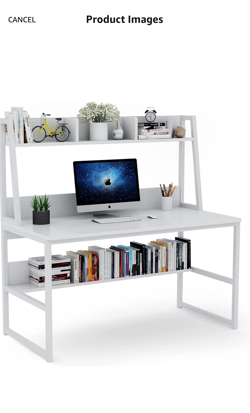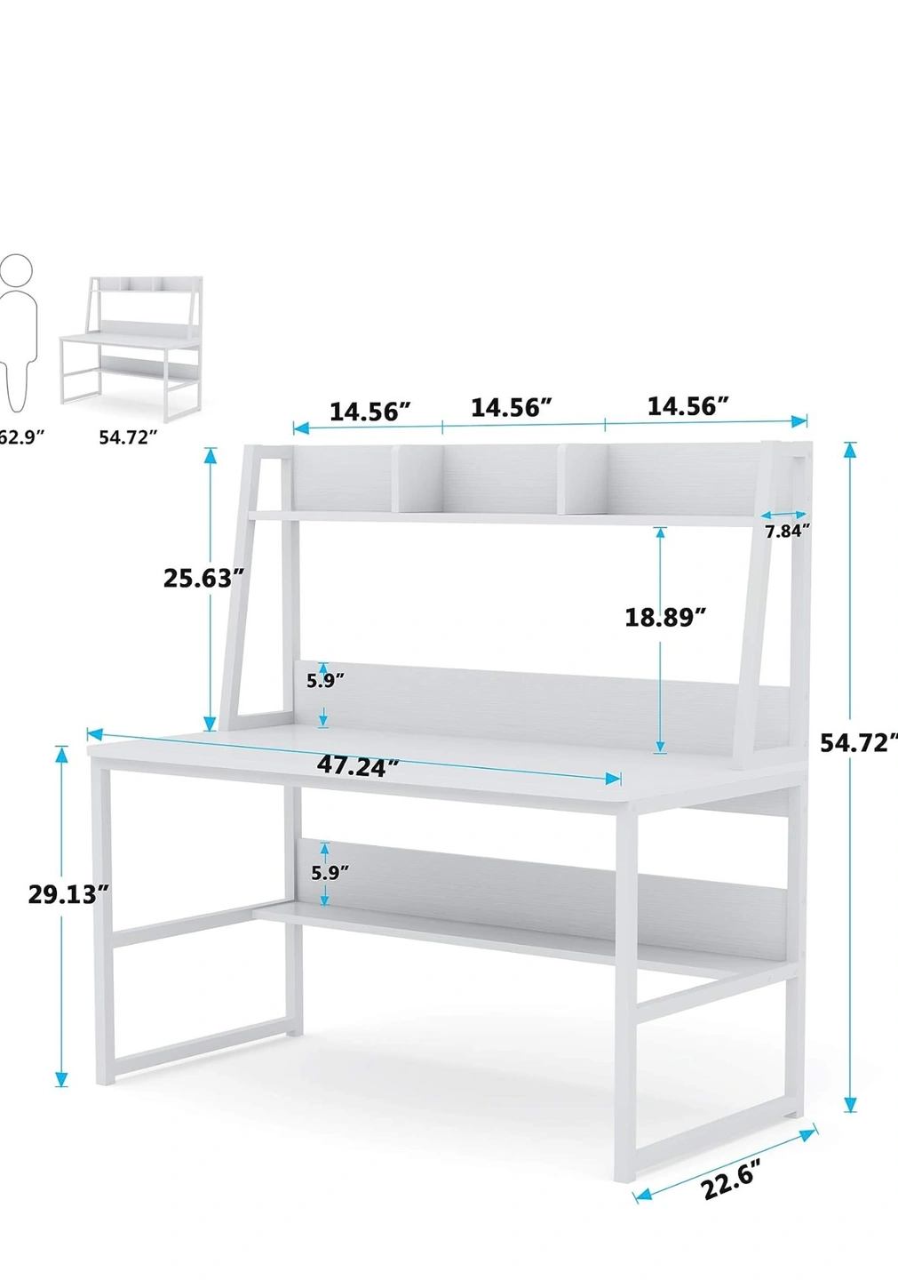 Brand: Tribesigns Shape: Rectangular Desk design: Computer Desk Product Dimensions: 23"D x 47"W x 54"H Color: White Style: Modern DESK & BOOKSHELF TWO-IN-ONE: Its vertical design features a open bookshelf and attached a hutch saves floor space while enhancing storage options. And even with all your stuffs it still feels spacious! COMPACT BUT HUGE ENOUGH FOR 2 MONITORS: This extra large desk surface (47.2in*23.6in) with high capacity makes it perfect fit for your laptop or desktop PC and all of your office accessories. [SUPER STURDY AND DURABLE]: The desk legs made from heavy-duty metal ( 1.18" by 1.18" width) which offers super stability and durability, 0.6" thicker desktop is strong enough support heavy duty load. The Panel material is environmental E1 standard particle wood which is wear-resistant, heat-resistant and easy to clean.
