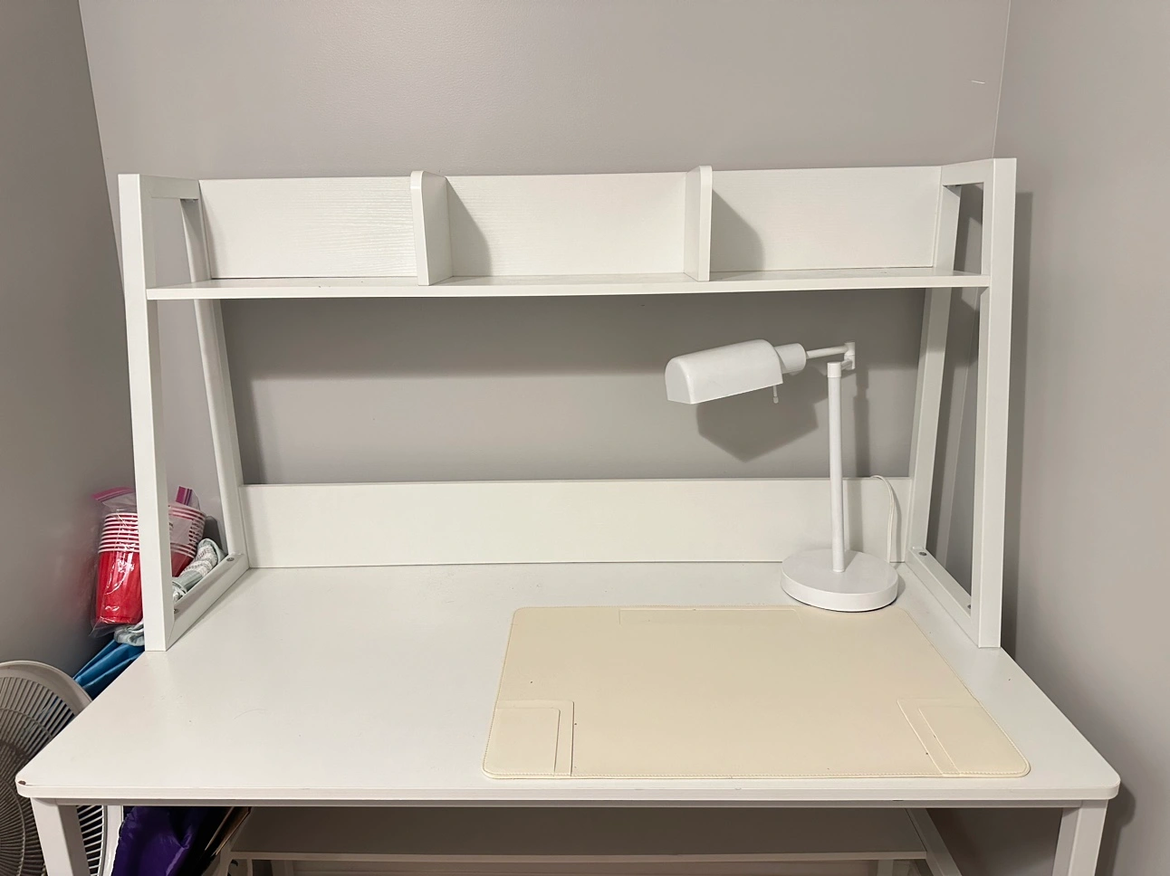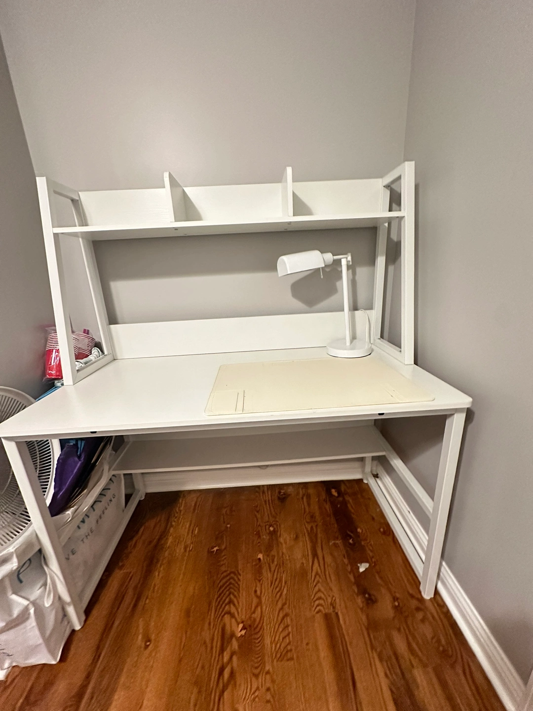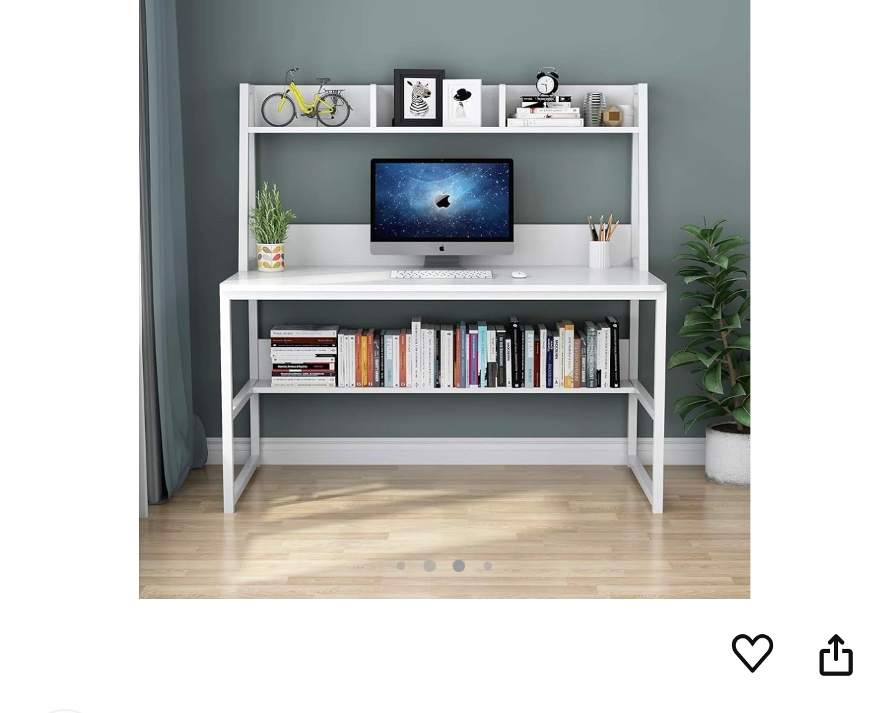 Brand: Tribesigns Shape: Rectangular Desk design: Computer Desk Product Dimensions: 23"D x 47"W x 54"H Color: White Style: Modern DESK & BOOKSHELF TWO-IN-ONE: Its vertical design features a open bookshelf and attached a hutch saves floor space while enhancing storage options. And even with all your stuffs it still feels spacious! COMPACT BUT HUGE ENOUGH FOR 2 MONITORS: This extra large desk surface (47.2in*23.6in) with high capacity makes it perfect fit for your laptop or desktop PC and all of your office accessories. [SUPER STURDY AND DURABLE]: The desk legs made from heavy-duty metal ( 1.18" by 1.18" width) which offers super stability and durability, 0.6" thicker desktop is strong enough support heavy duty load. The Panel material is environmental E1 standard particle wood which is wear-resistant, heat-resistant and easy to clean.