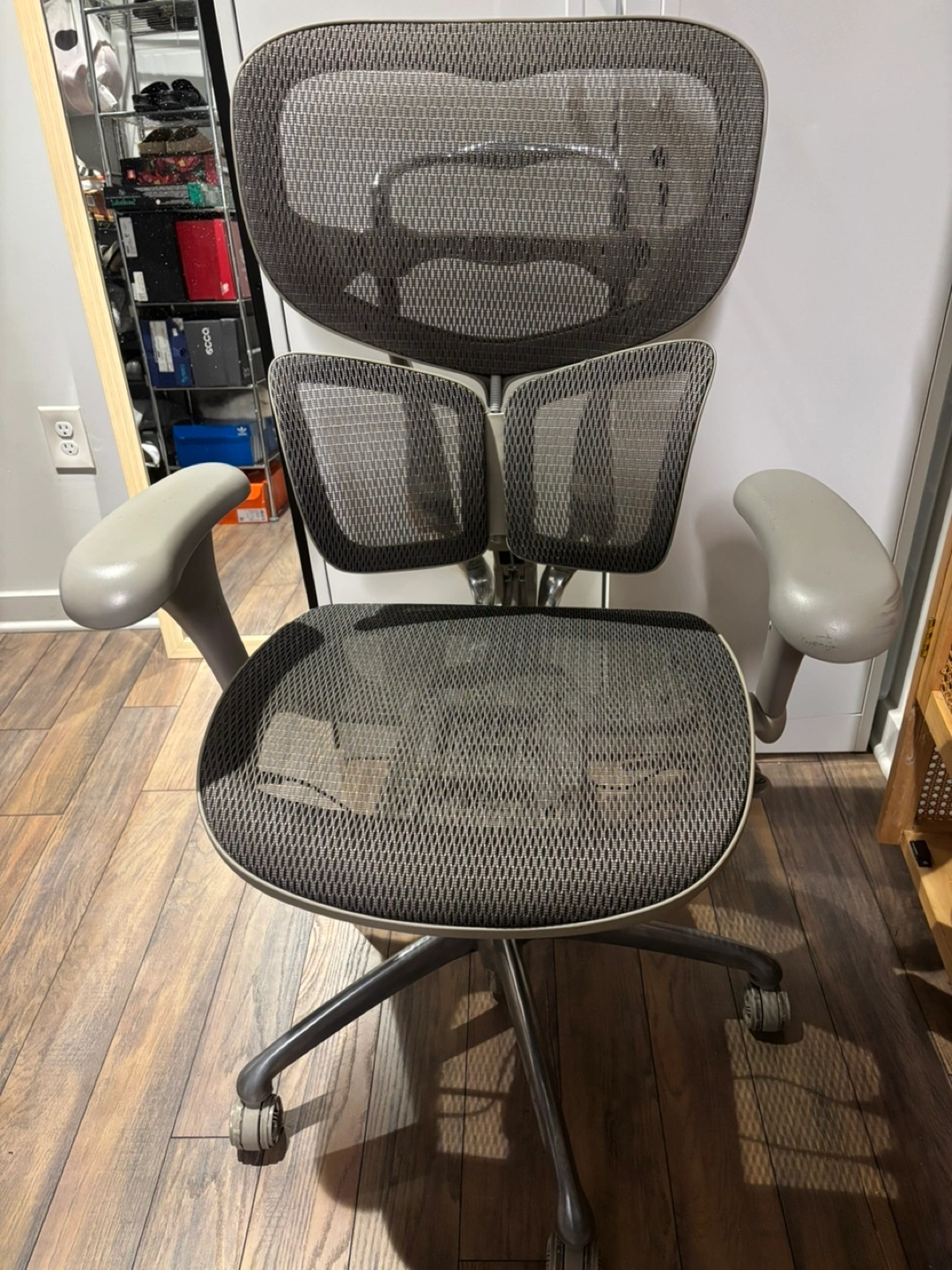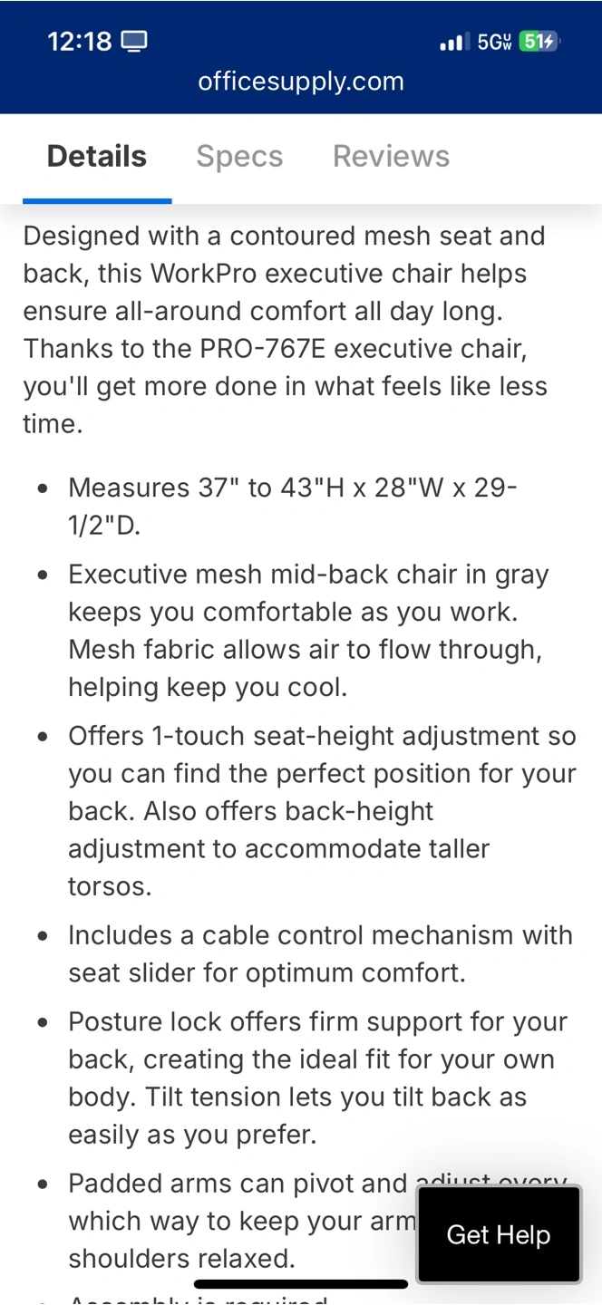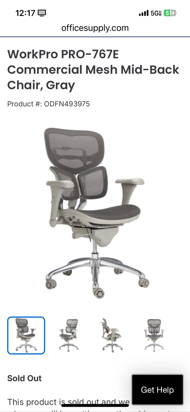 Selling a WorkPro PRO-767E commercial mid-back chair in gray. It's designed with a contoured mesh seat and back for all-around comfort. The chair measures 37" to 43"H x 28"W x 29-1/2"D. It features a 1-touch seat-height adjustment, back-height adjustment, cable control mechanism with seat slider, and posture lock for firm support Original price $500+