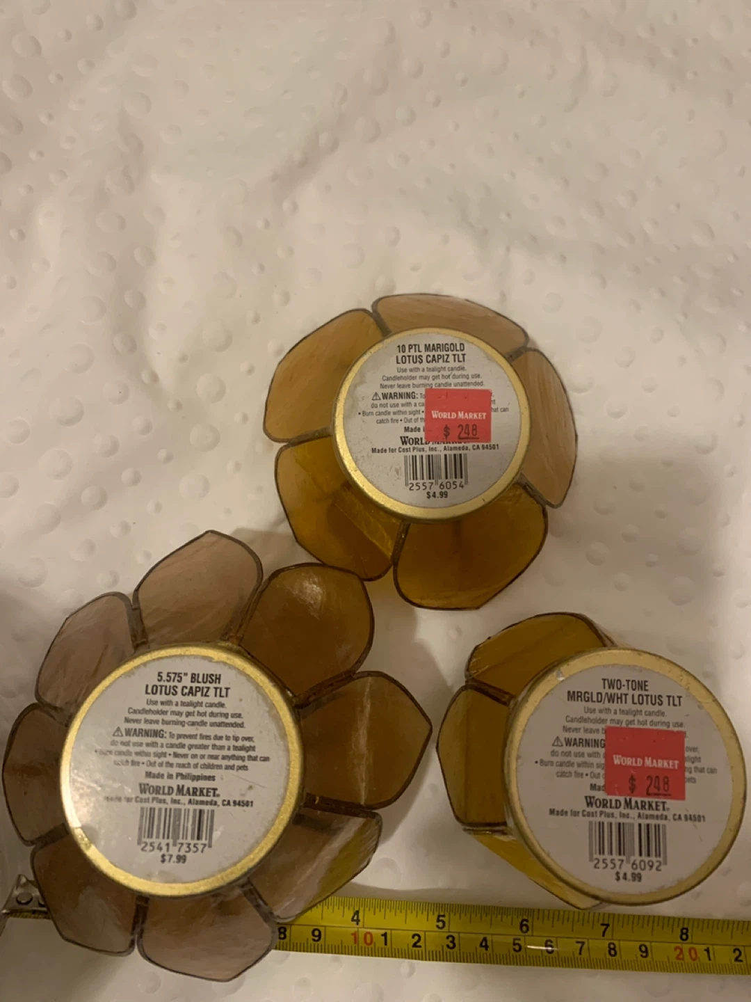 68Selling three World Market Lotus Capiz Tealight candle holders. They are in good condition and ready to add a touch of warmth to your space! - 10 PTL Marigold Lotus Capiz TLT - 5.575" Blush Lotus Capiz TLT - Two-Tone Mrgld/Wht Lotus TLT Originally priced at $2.48, $7.99, and $4.99 respectively